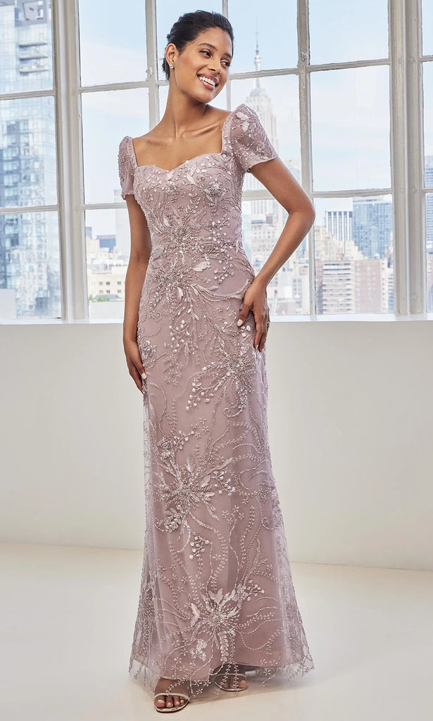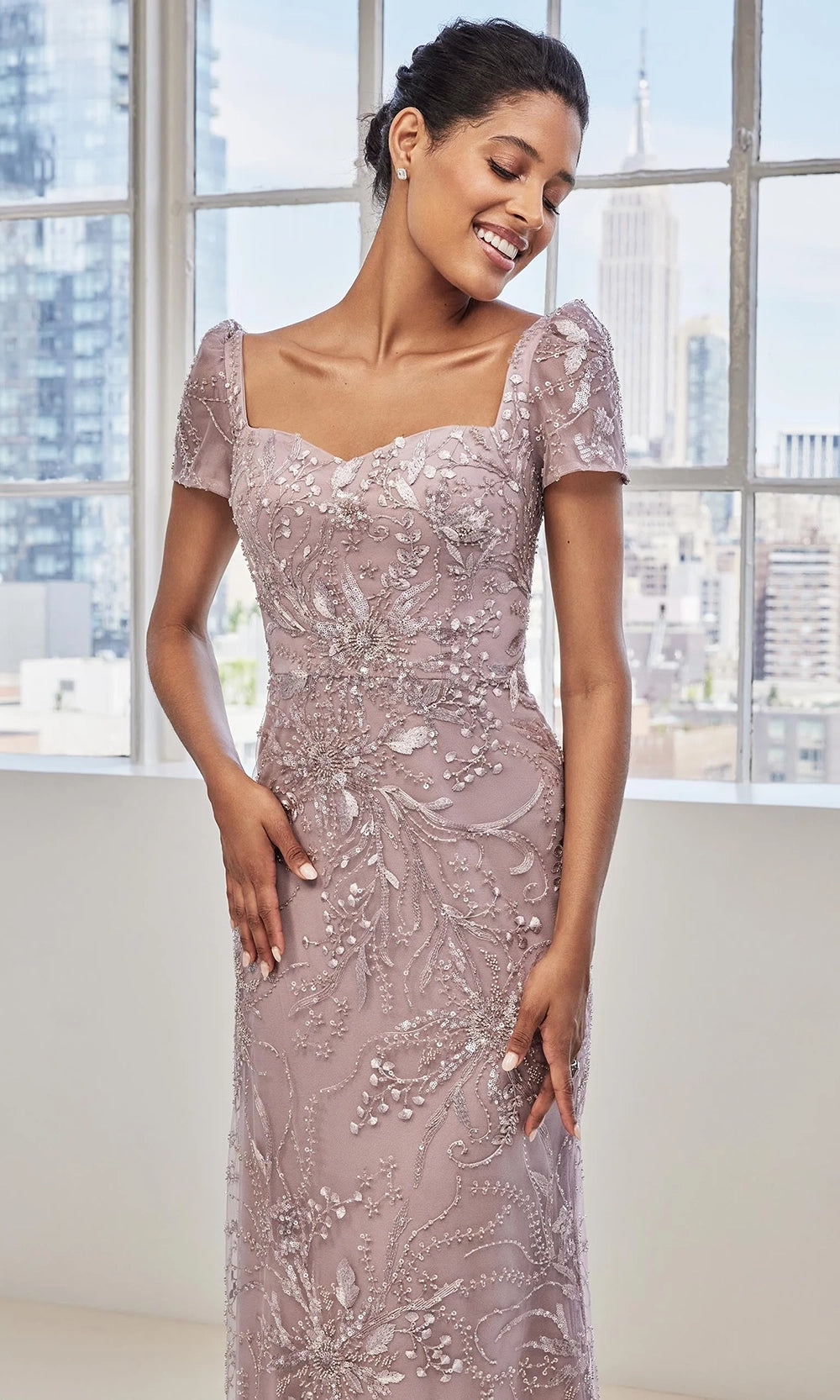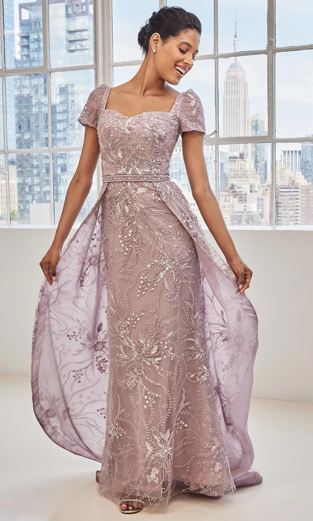 Delicate sparkle and layered texture define this MGNY By Mori Lee 73128 standout gown crafted for eye-catching sophistication. It displays beaded embroidery that covers a sweetheart neckline bodice with sheer short sleeves for soft structure. A detachable overskirt adds volume and elegance to the slim sheath base beneath, allowing for versatile styling. Thoughtfully designed from net fabric with ornate patterns throughout, this gown bridges classic and modern elements beautifully. MGNY By Mori Lee 73128 is a celebration of embellished charm with graceful movement. Model is wearing Lilac color.
