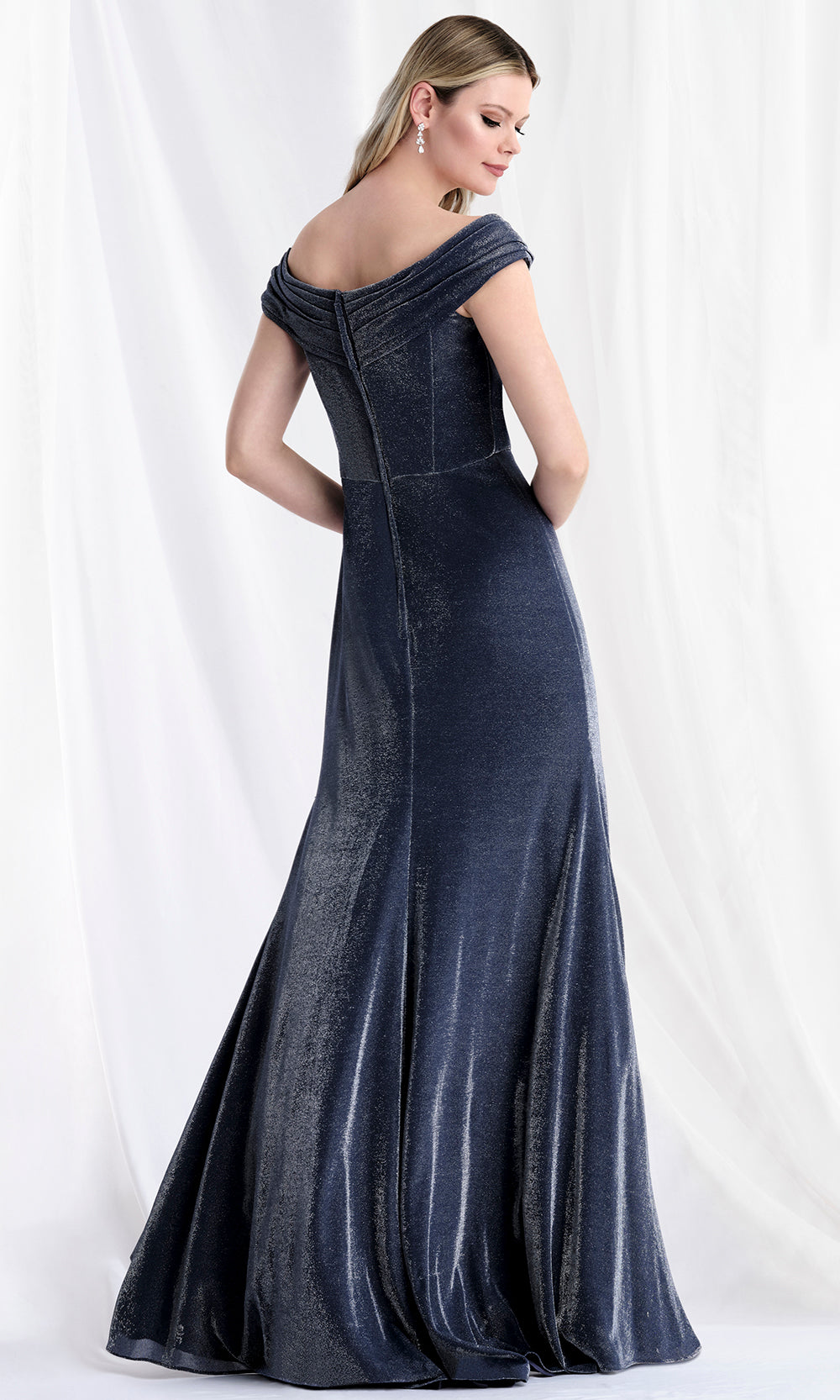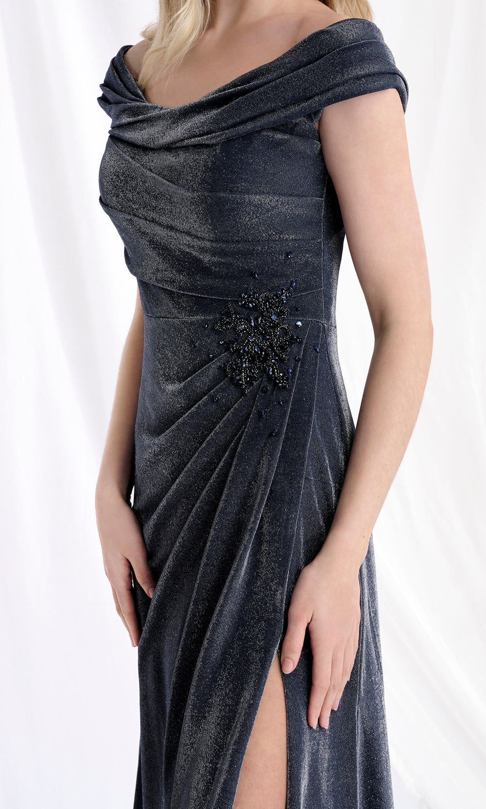Sophistication takes a fresh approach in the MGNY By Mori Lee 73152 gown. A sleek silhouette effortlessly complements the draped off-shoulder neckline while adding subtle dimension to the overall look. The ruched gathering and beaded applique draws the eye to the waist and enhances its feminine shape without overstatement. A tasteful front slit introduces a graceful hint of allure, maintaining poise with every step. Finished with back zipper closure and cap sleeves, this sheath gown offers timeless appeal and gentle drama. MGNY By Mori Lee 73152 combines elegance with thoughtful details that elevate a classic look. Model is wearing Stone color.