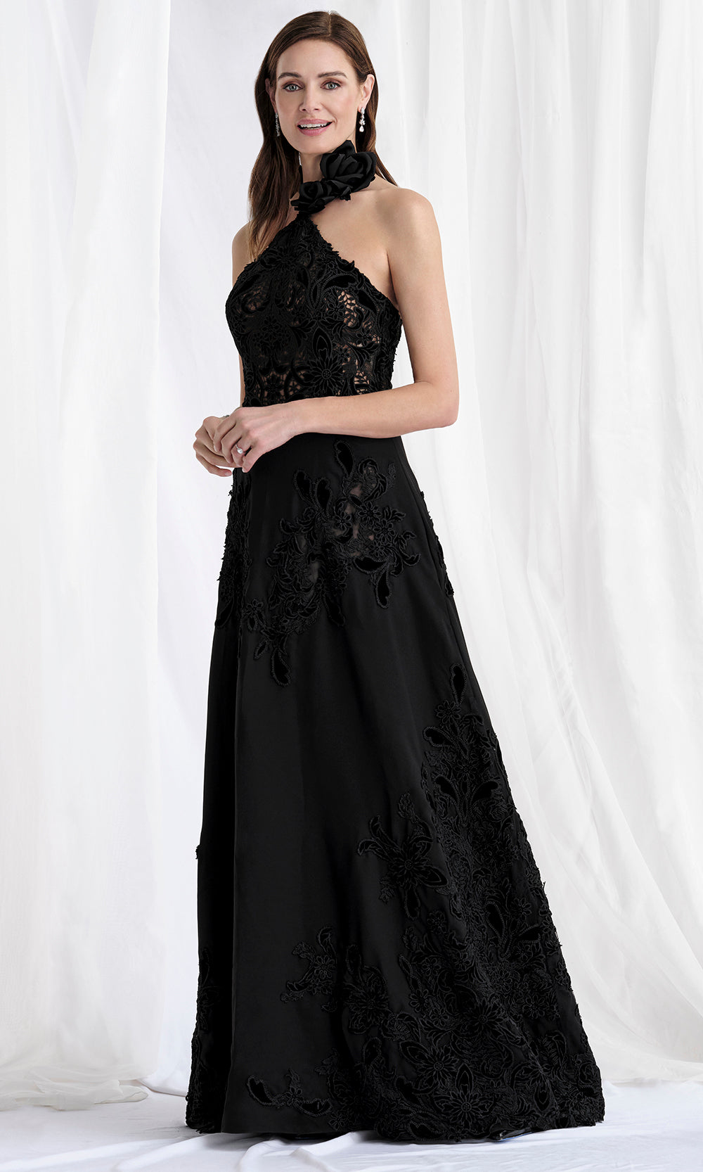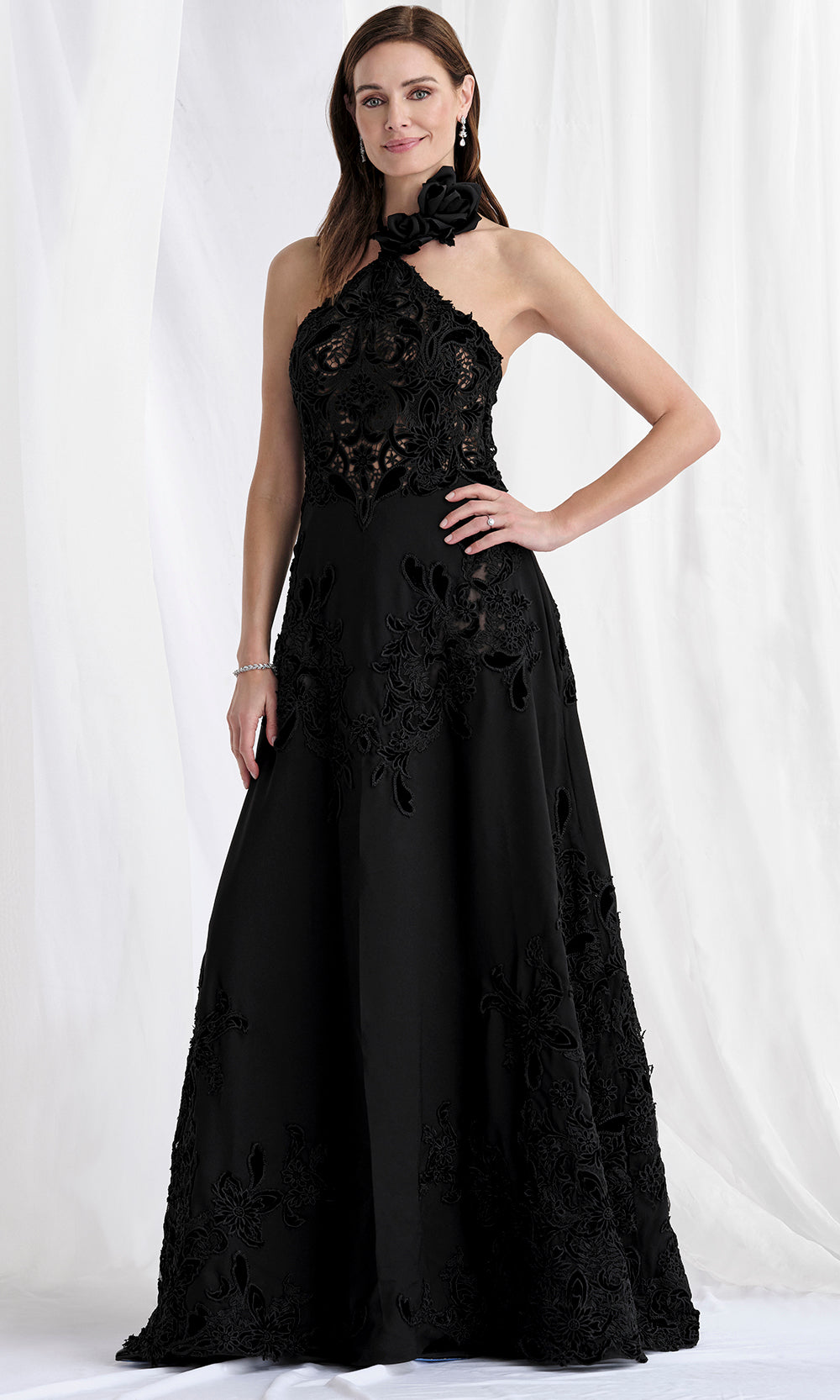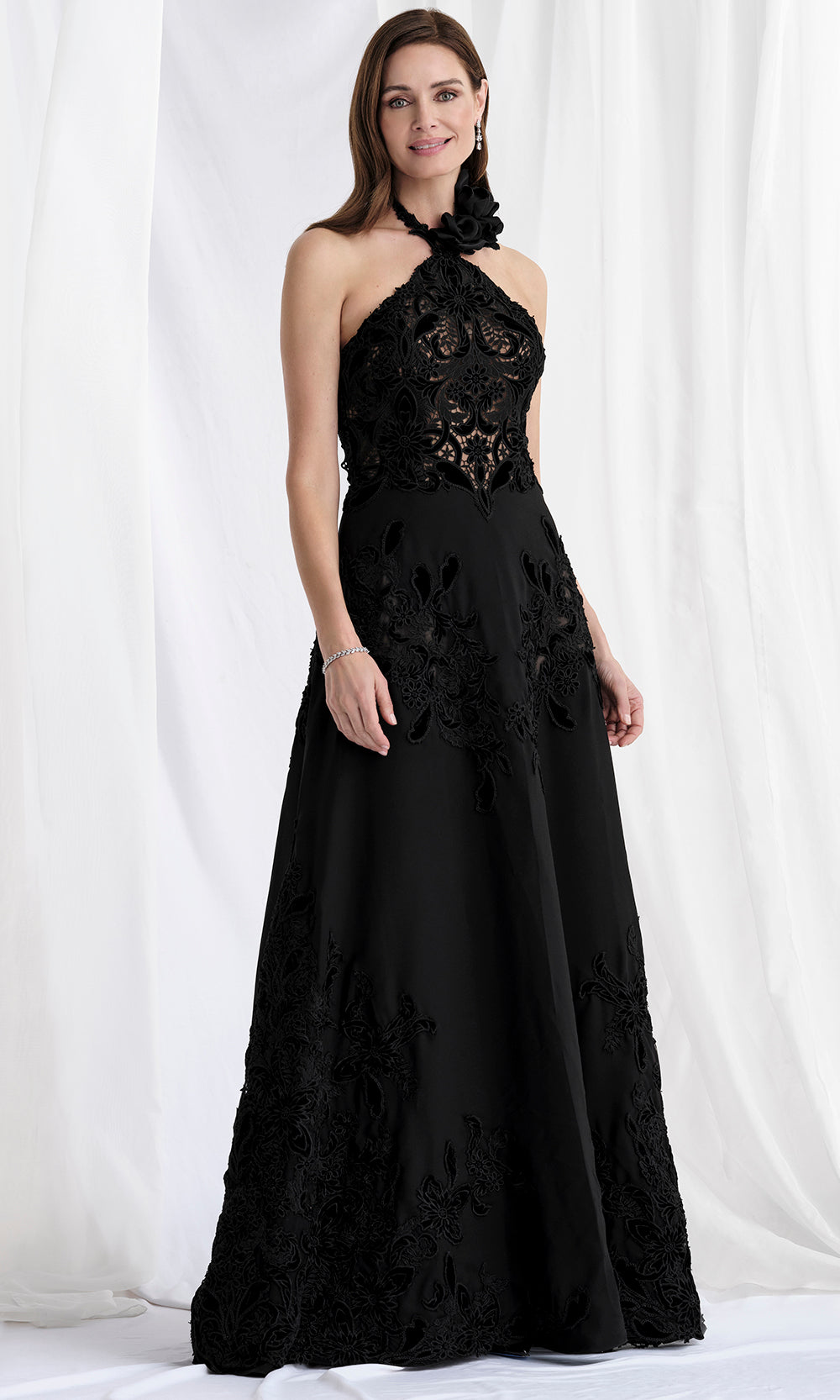 A sense of quiet opulence defines the MGNY By Mori Lee 73159 gown. The halter neckline with 3D floral accent introduces a dramatic touch that contrasts beautifully with the soft, romantic elements throughout. A richly embroidered lace bodice flows seamlessly into a graceful A-line skirt, creating depth without excess. The back reveals an open feature and halter tie closure that adds a modern, unexpected twist to the overall design. MGNY By Mori Lee 73159 balances timeless sophistication with subtle allure, delivering a look that is both elevated and expressive. Model is wearing Black color.