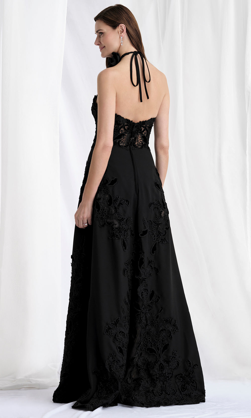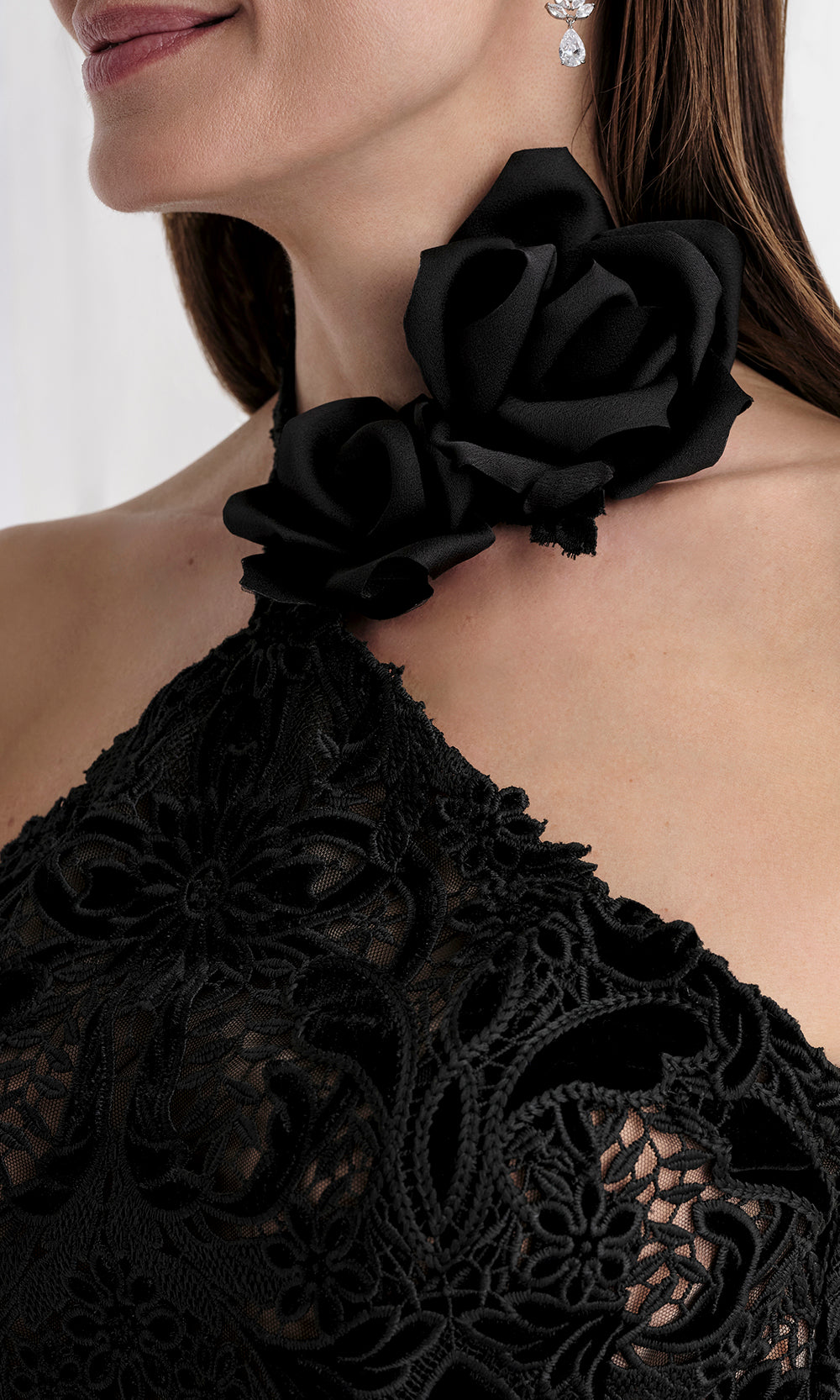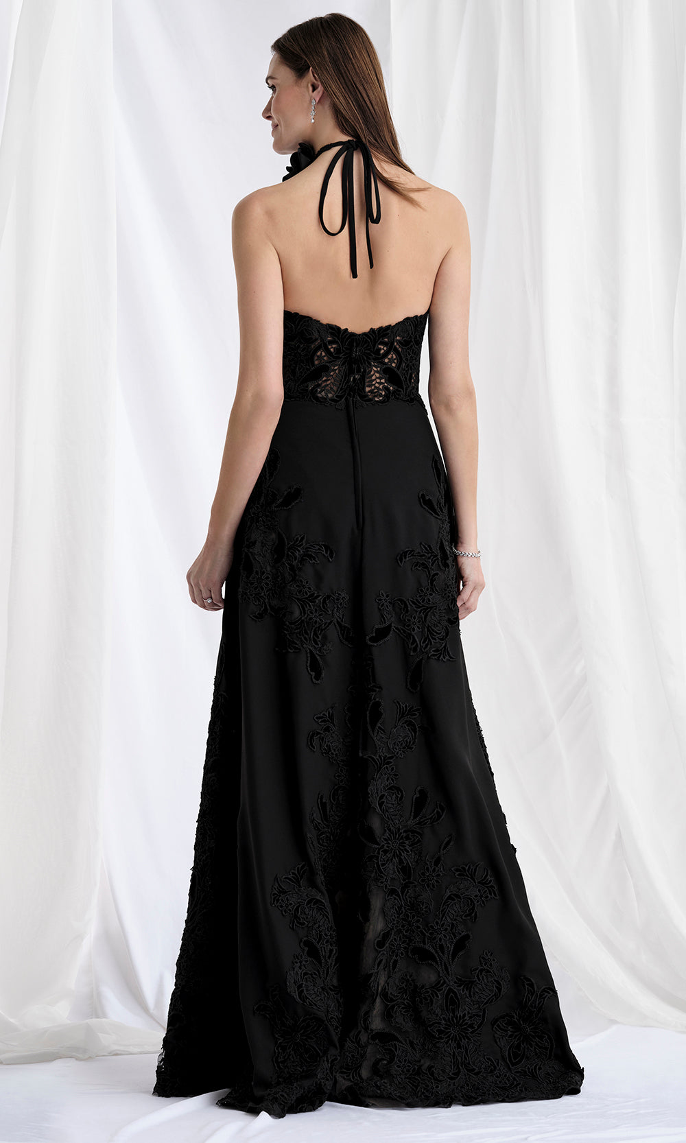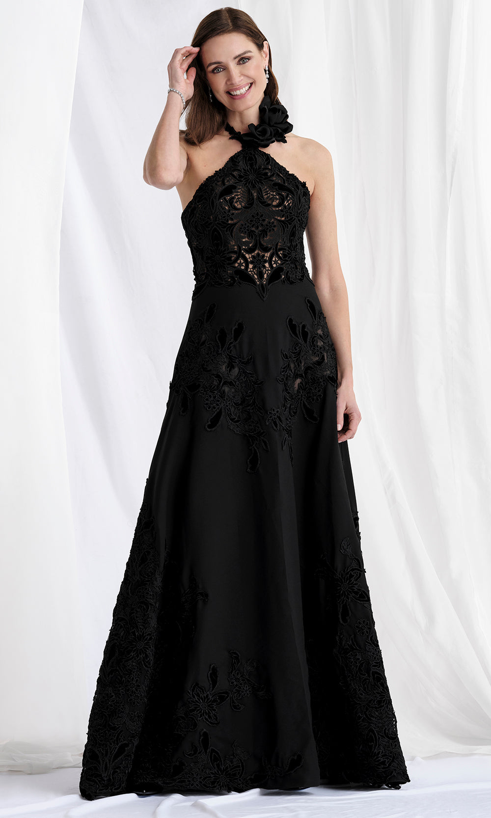 A sense of quiet opulence defines the MGNY By Mori Lee 73159 gown. The halter neckline with 3D floral accent introduces a dramatic touch that contrasts beautifully with the soft, romantic elements throughout. A richly embroidered lace bodice flows seamlessly into a graceful A-line skirt, creating depth without excess. The back reveals an open feature and halter tie closure that adds a modern, unexpected twist to the overall design. MGNY By Mori Lee 73159 balances timeless sophistication with subtle allure, delivering a look that is both elevated and expressive. Model is wearing Black color.