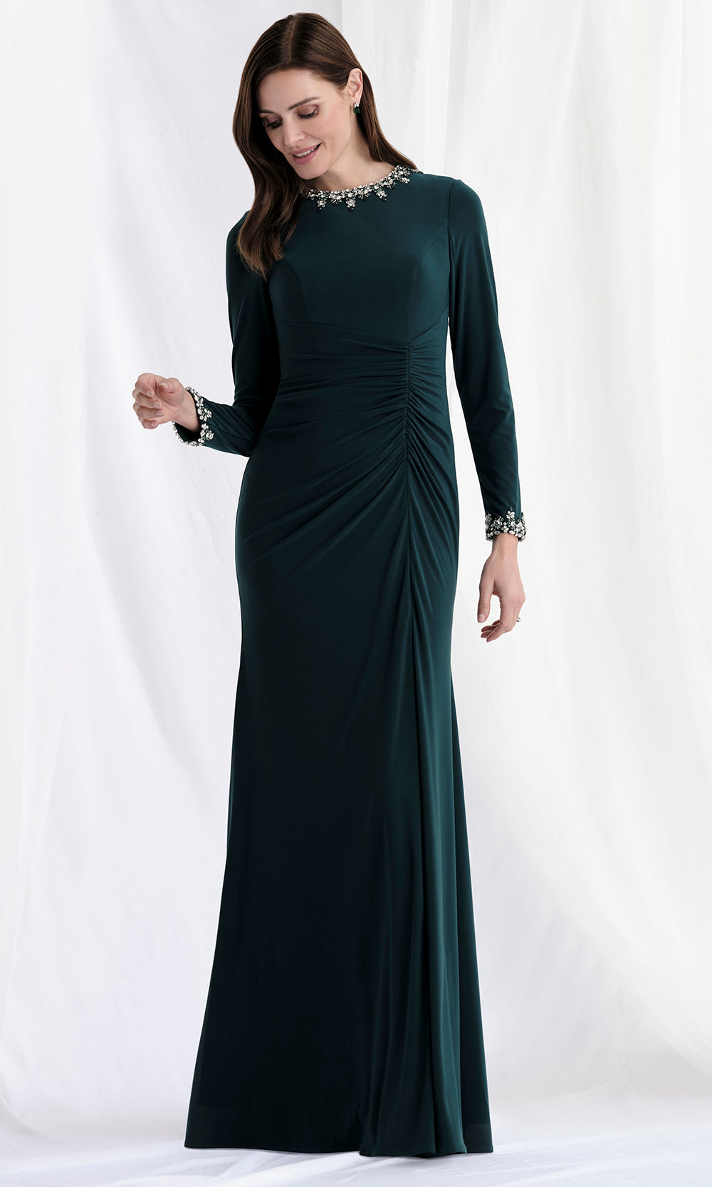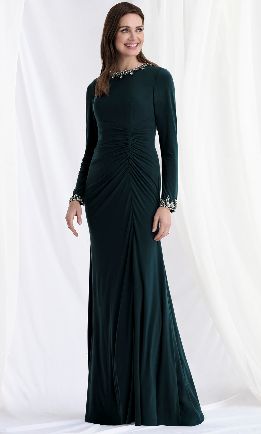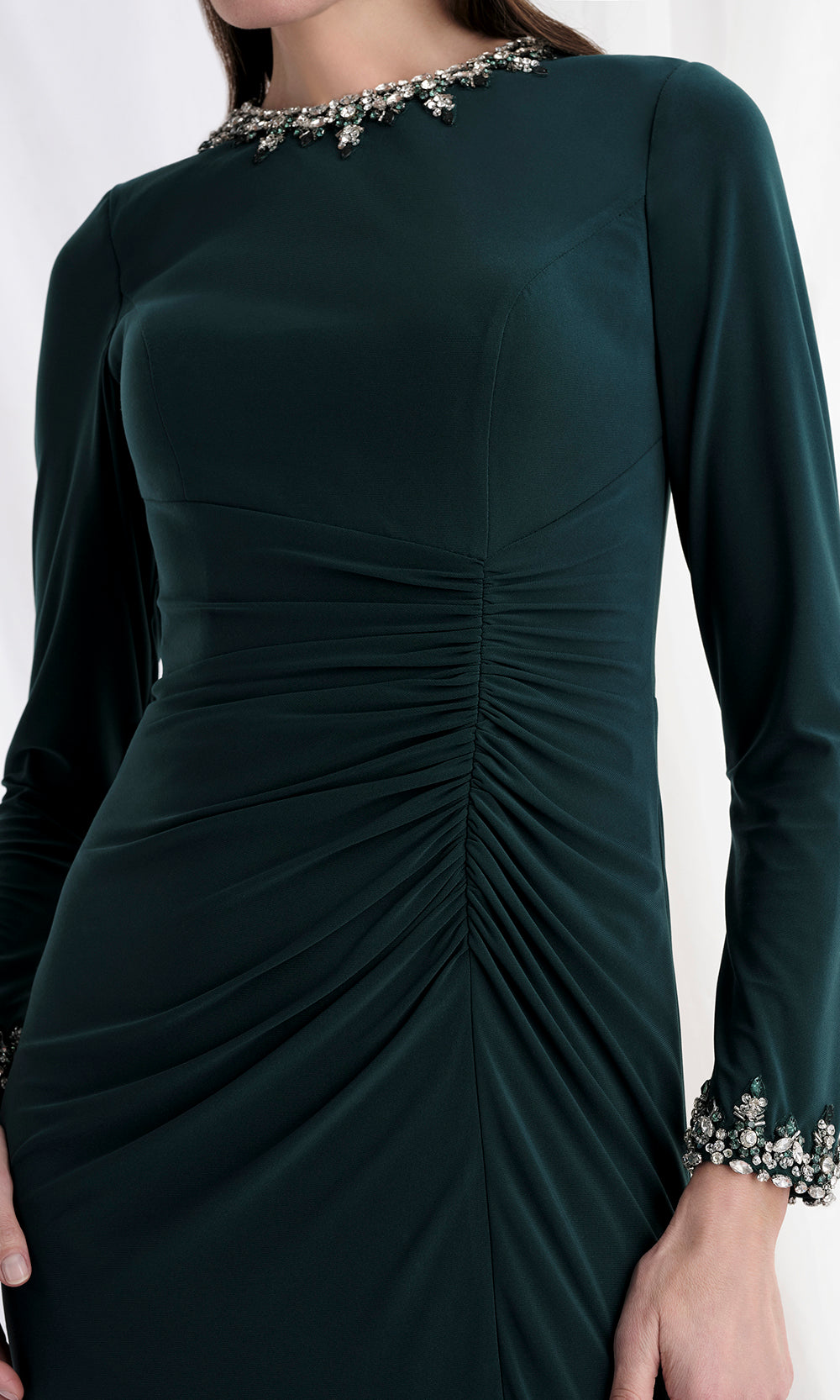 Sophistication and glamour blend effortlessly in MGNY By Mori Lee 73166. The gown structured sheath silhouette is complemented by a beautifully ruched bodice that draws attention to the figure with subtle elegance. Beaded detailing enhances both jewel neckline and long sleeve cuffs, giving it just the right amount of sparkle. The asymmetrical gathering at the waist further defines the silhouette while adding movement to the overall look. MGNY By Mori Lee 73166 is an ideal option for anyone looking to embrace graceful charm and elevated design for their next celebration. Model is wearing Emerald color.
