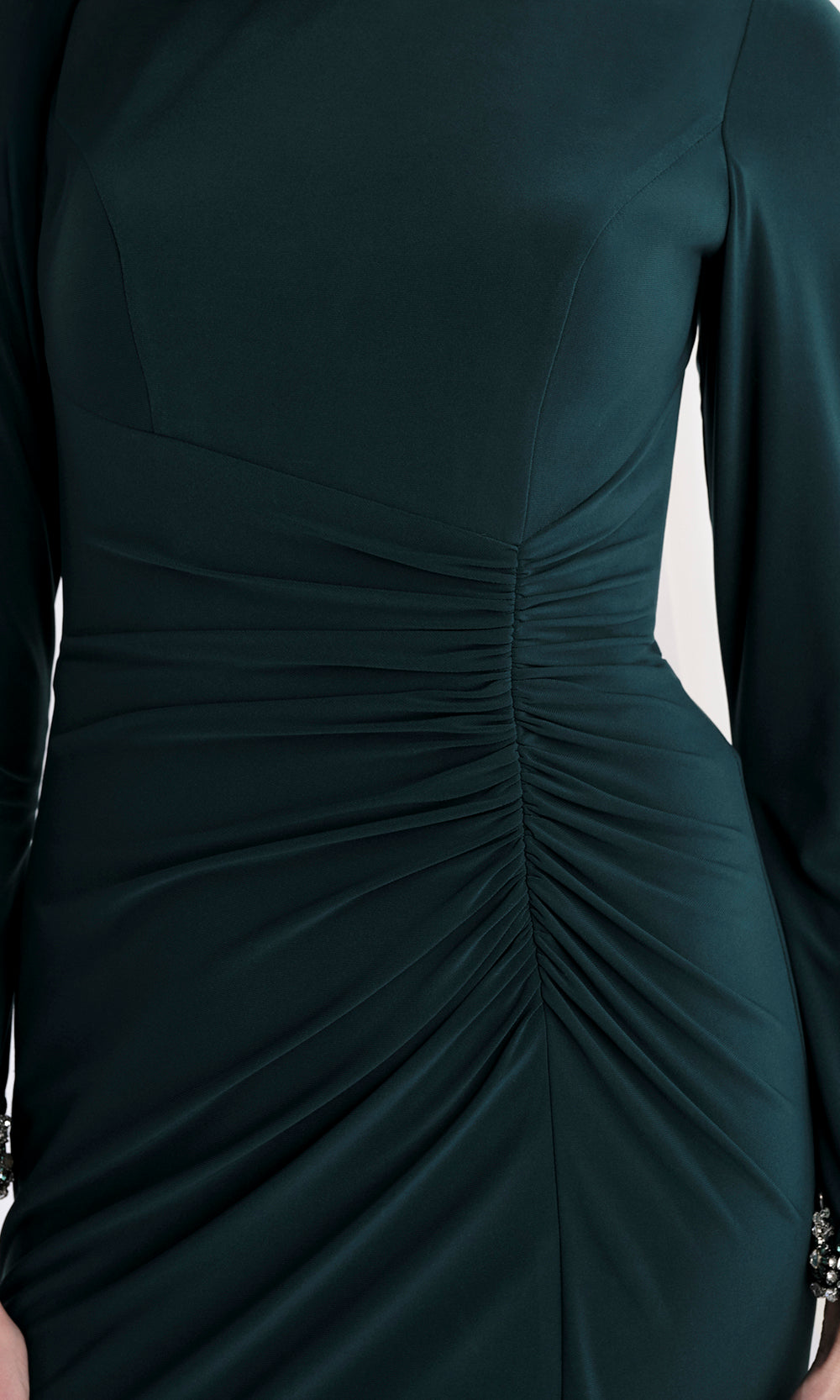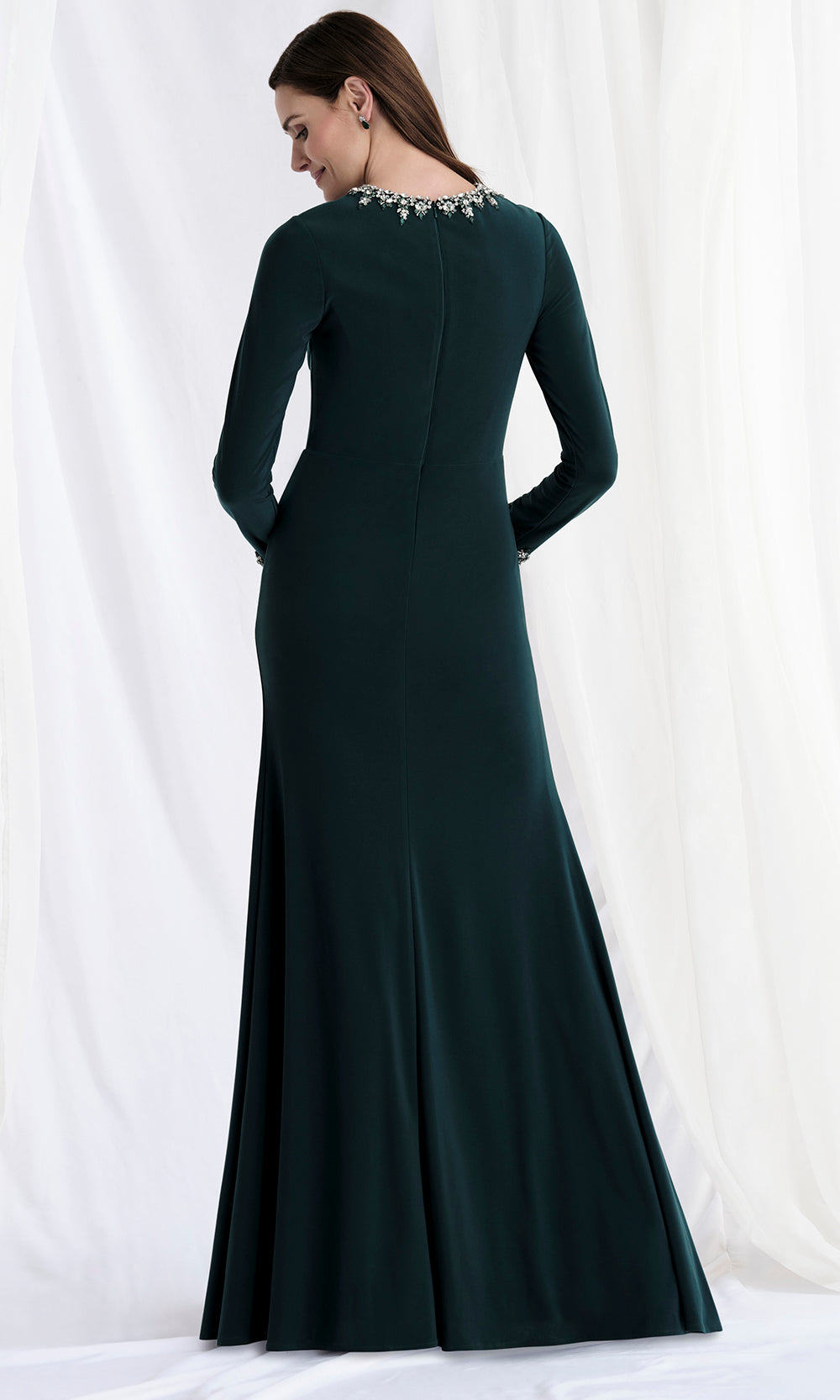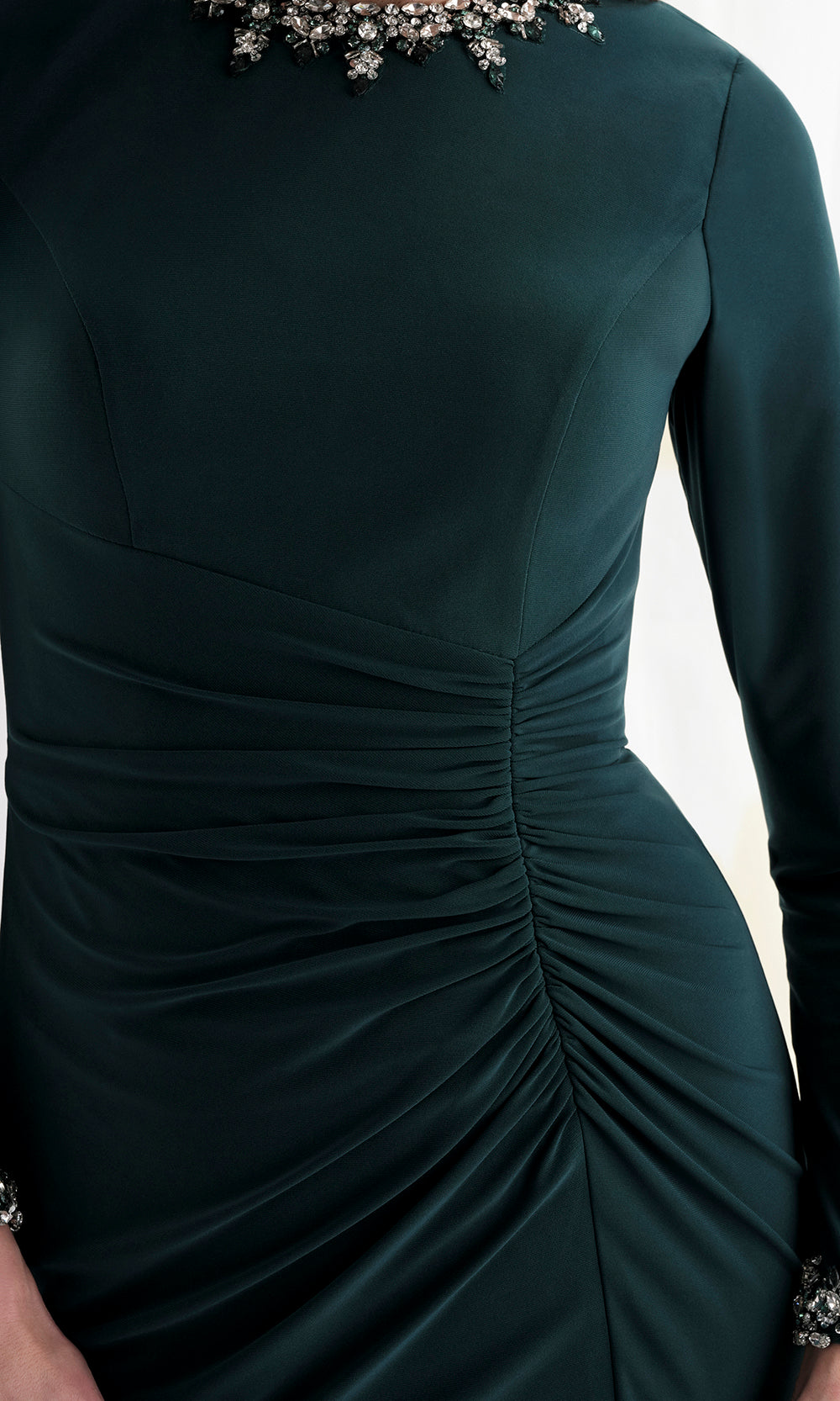 Sophistication and glamour blend effortlessly in MGNY By Mori Lee 73166. The gown structured sheath silhouette is complemented by a beautifully ruched bodice that draws attention to the figure with subtle elegance. Beaded detailing enhances both jewel neckline and long sleeve cuffs, giving it just the right amount of sparkle. The asymmetrical gathering at the waist further defines the silhouette while adding movement to the overall look. MGNY By Mori Lee 73166 is an ideal option for anyone looking to embrace graceful charm and elevated design for their next celebration. Model is wearing Emerald color.