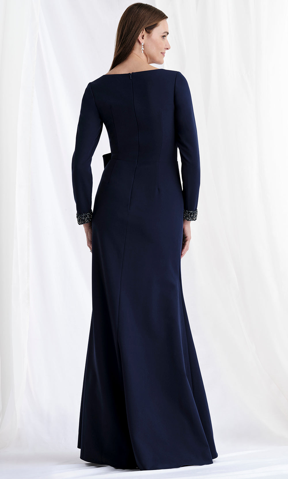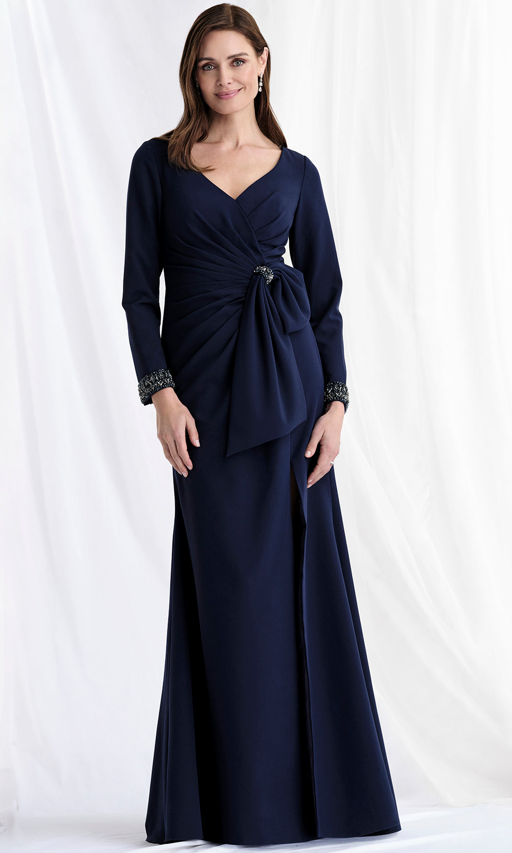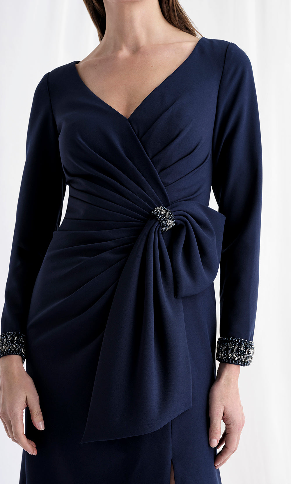 True sophistication shines in the MGNY By Mori Lee 73172 evening gown, where refined design elements create a look that is both graceful and memorable. It displays a flattering V-neckline that elongates the frame and long fitted sleeves finished with beaded cuffs. Its ruched upper bodice is enhanced by a sparkling brooch and oversized bow, providing subtle definition to the silhouette. The sheath design is complemented by a front slit that allows graceful movement, creating both poise and comfort. The MGNY By Mori Lee 73172 offers a timeless look for women who value elegance infused with refined detail. Model is wearing Navy color.