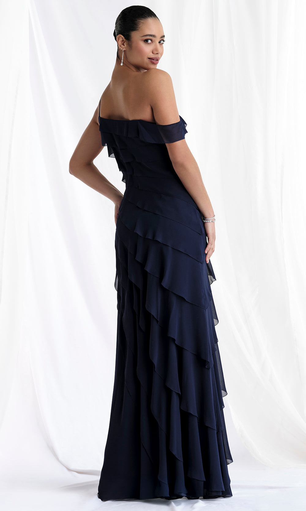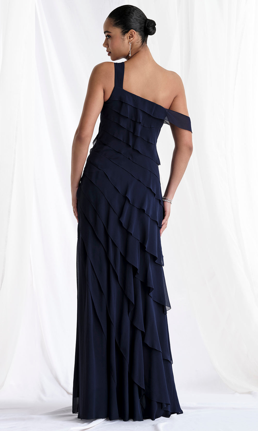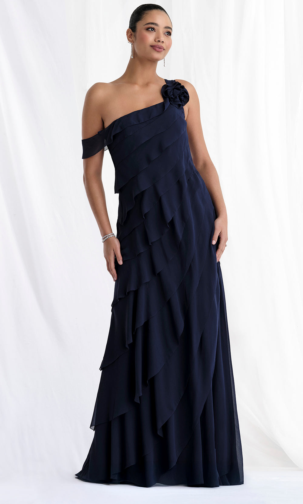 | Details: | Rosette Detail, One Shoulder, Tiered, Mid-Open Back, Floor Length |