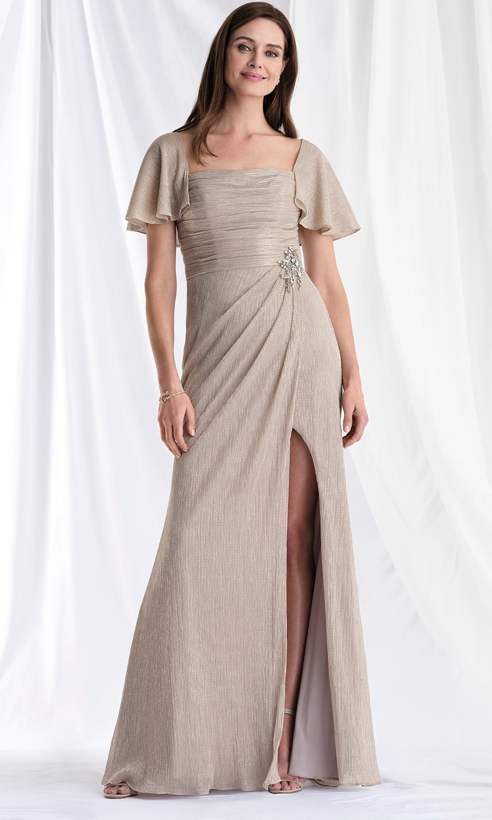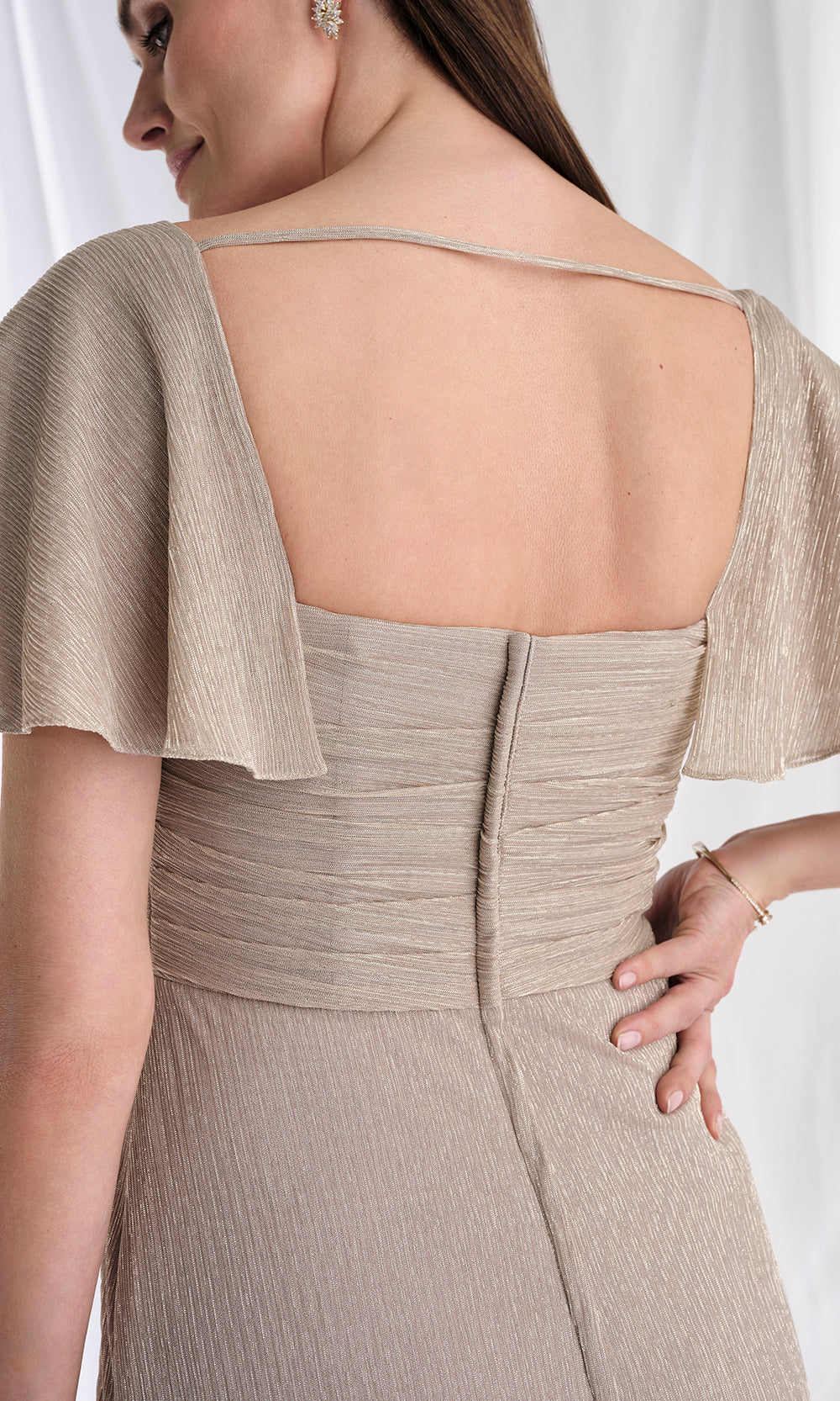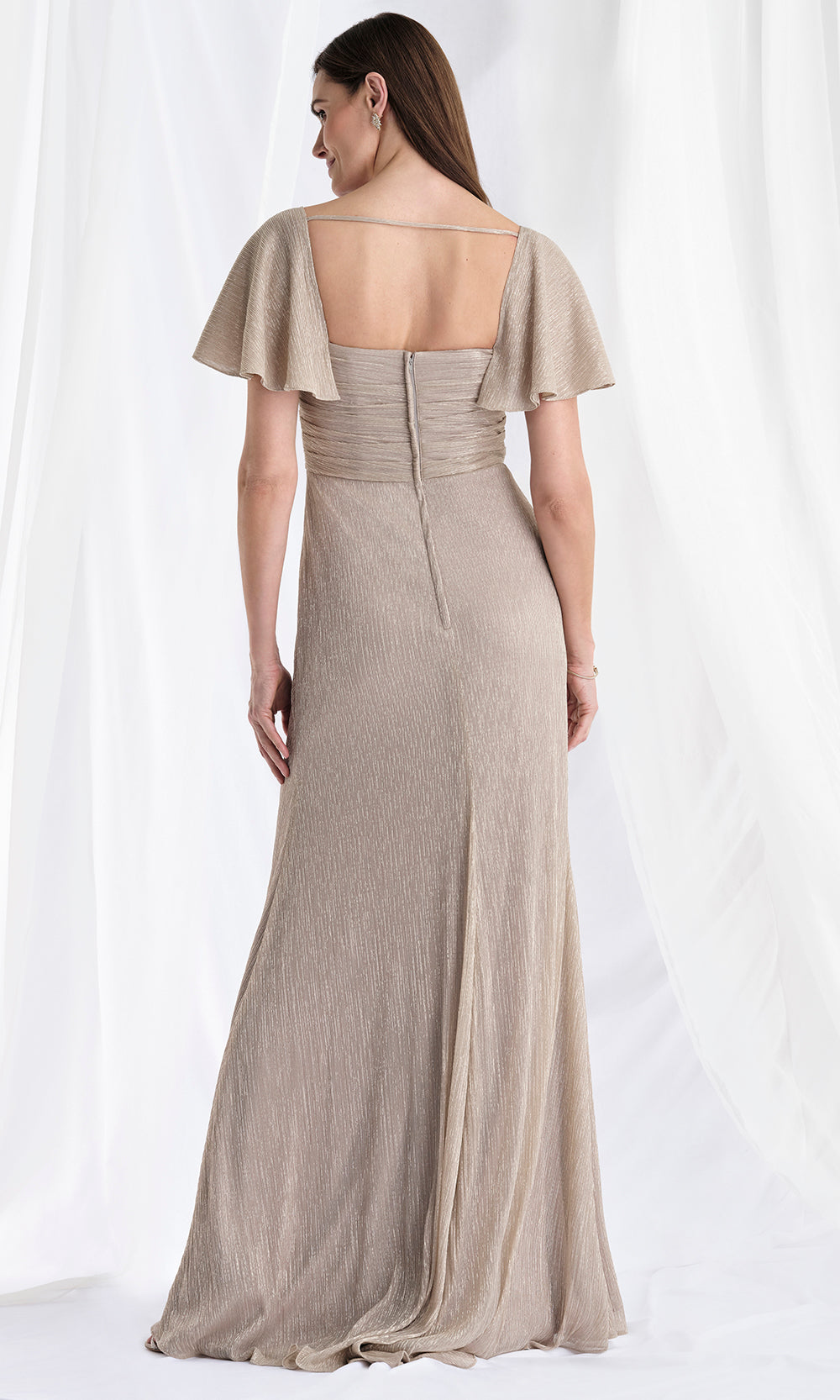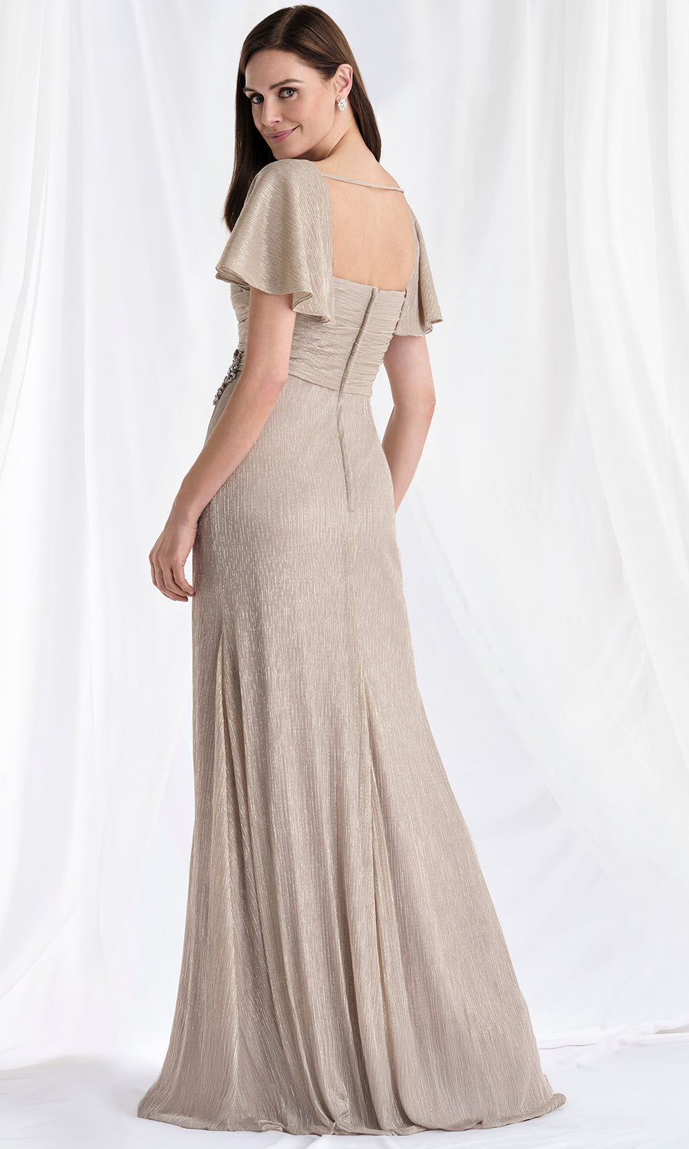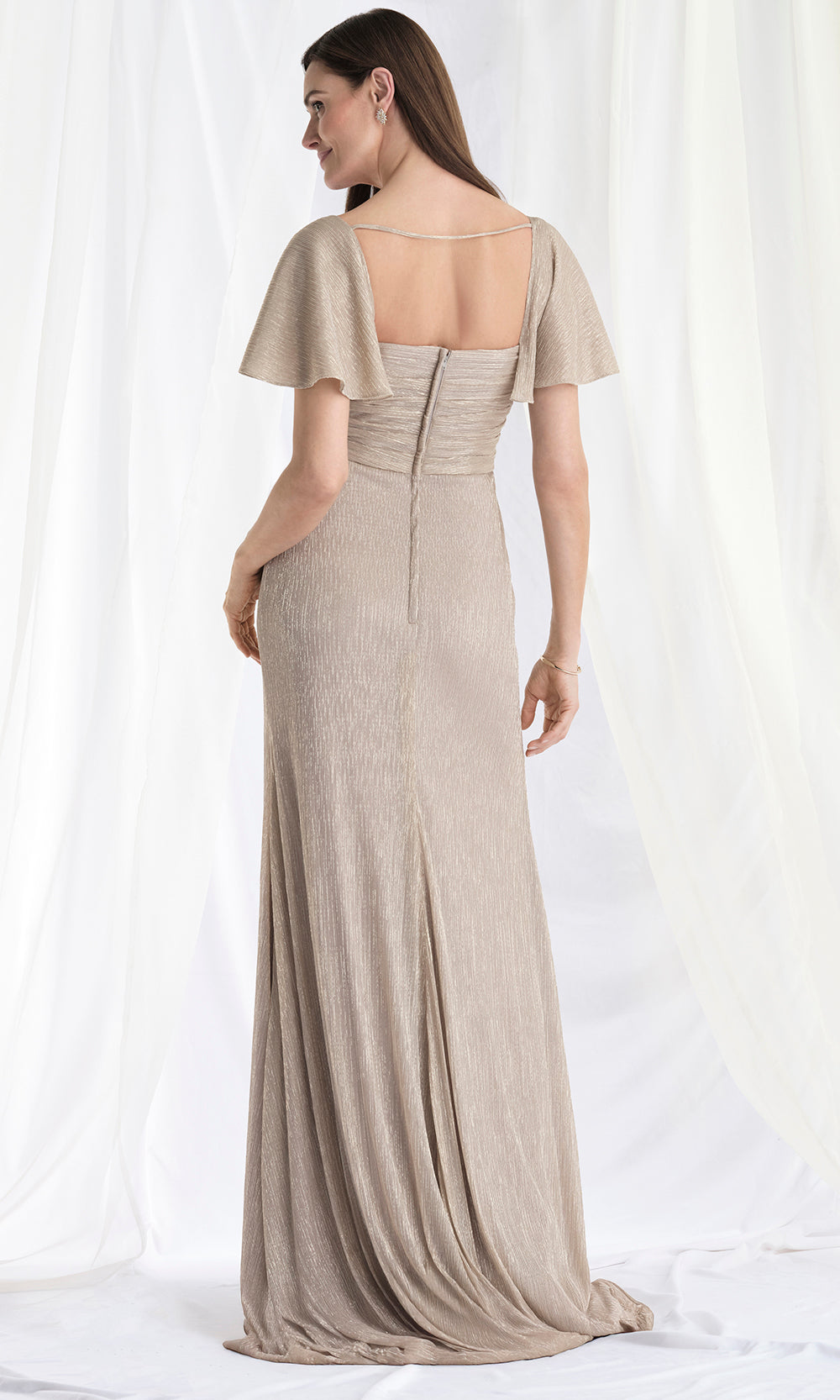 | Details: | Short Flutter Sleeves, Ruched Bodice, High Slit, Beaded Applique, Open Back |
