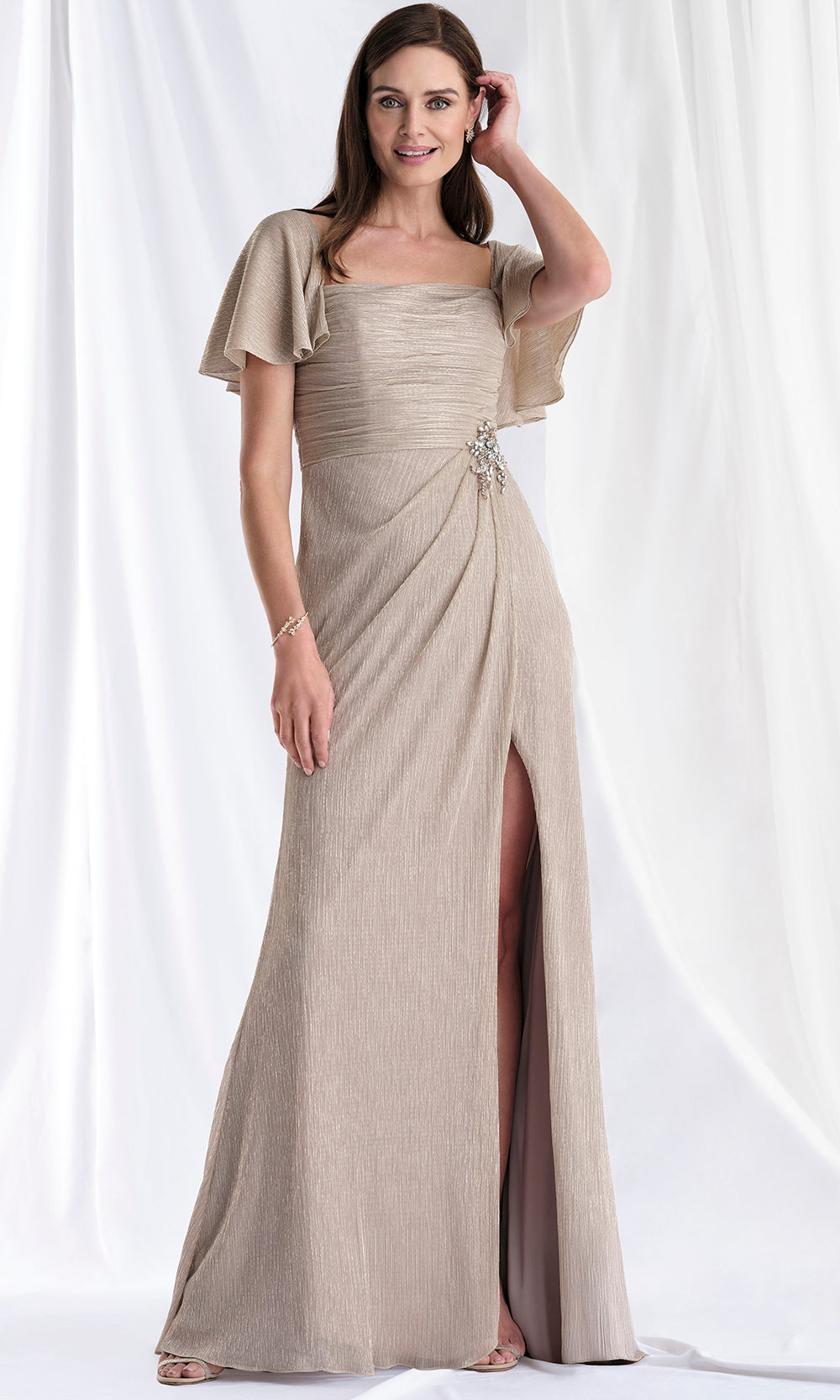 The MGNY By Mori Lee 73178 redefines evening wear with thoughtful touches that radiate sophistication. Its square neckline is balanced by short flutter sleeves, offering graceful coverage while adding a soft and feminine look. A shimmering beaded applique highlights the ruched bodice and natural waist, enhancing the figure before giving way to a flowing A-line skirt finished with a refined slit. Polished yet unique, the MGNY By Mori Lee 73178 is a timeless choice for those who want a gown that combines elegance with a contemporary feel. Model is wearing Gold color.