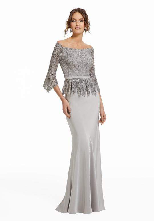 Beaded lace design the fitted bodice, framed with an off-shoulder neckline and quarter length sleeves, complemented with a full zipped up back. A detachable thin belt accents the natural waist as it gives way to the pleated peplum. Styled in crepe, the skirt parades a sheath silhouette that falls to a full length hemline, finished with a small train.