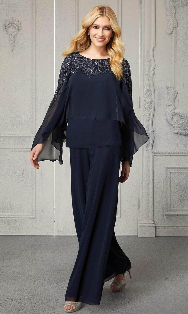 This two piece pant suit features a bateau neckline and a cape shear sleeves. The top has a sequin pattern design that adds to the elegance of the pant suit. The pant suit is made with a chiffon fabric. The pants is so flowy that makes your every walk look elegant. Model is wearing the Navy color.