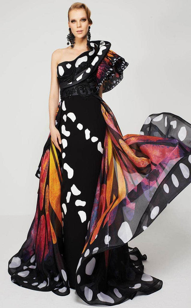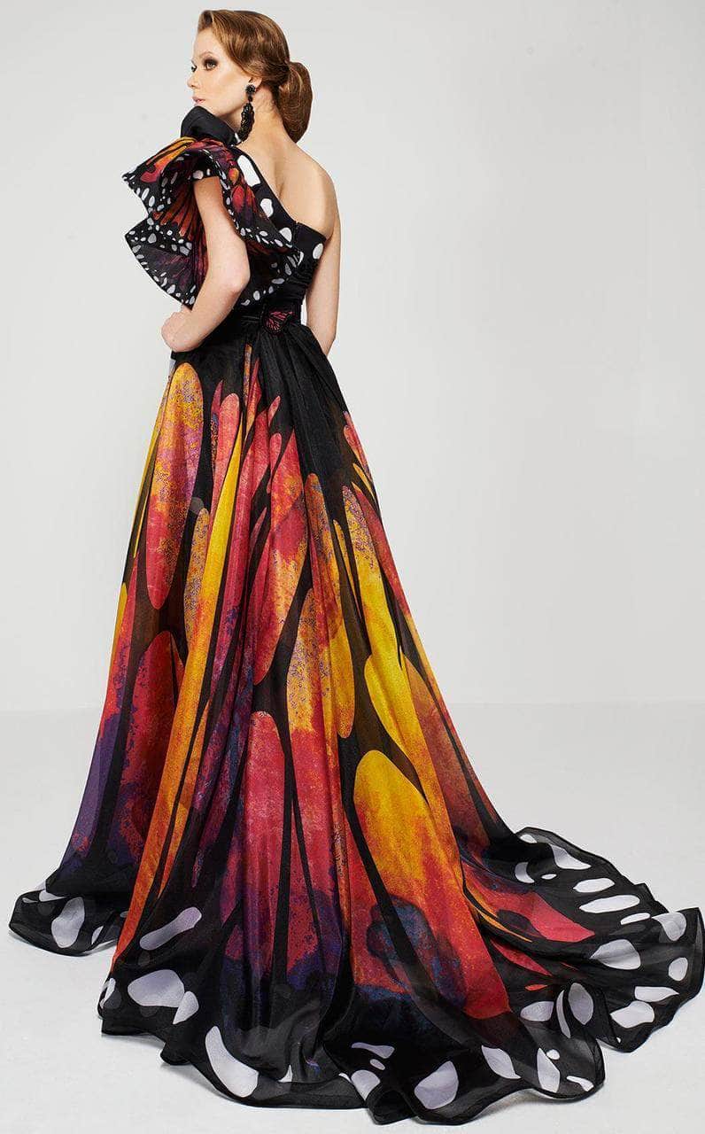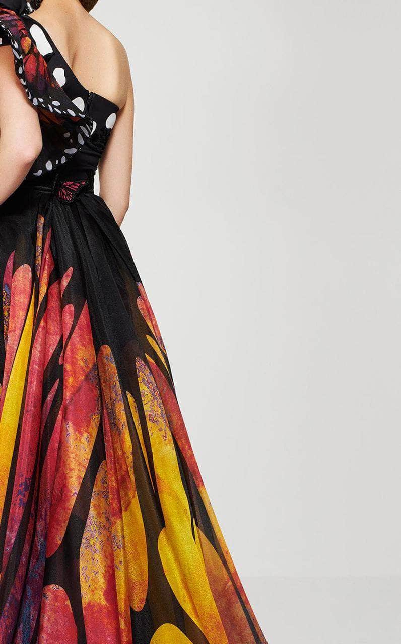 The luxurious bodice has a single shoulder strap embellished with fabulous ruffled layers creating a vivid asymmetrical style. Cinched with a chic tonal belt to create curves, this glamorous red carpet ensemble glides to the full-length hem in soft fluttering waves of romantic monarch butterfly print. Model is wearing the Multicolor.