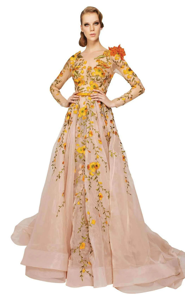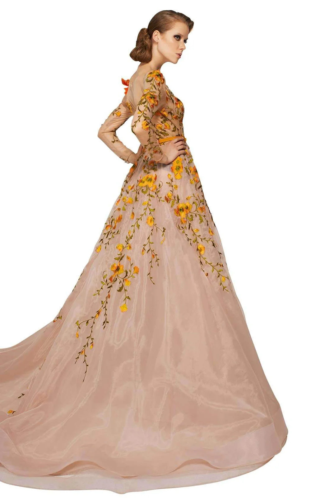 Radiate confidence and elegance in our sensational MNM Couture 2401 creation, tailored to perfection. Meticulously designed to enhance its sculpted figure, this exquisite gown features an elaborate floral embroidered pattern adorned its length. Highlighting a cold shoulder detail and a long-sleeved bodice graced by a bateau neckline, the ensemble reveals a full back discreetly secured with a zipper closure. Embellished with a bow detailed waistband, the A-line skirt cascades with grace, culminating in a grandiose train. Leave a memorable mark in our glamorous MNM Couture 2401 masterpiece, tailored for the contemporary queen. Model is wearing the Nude Orange color.