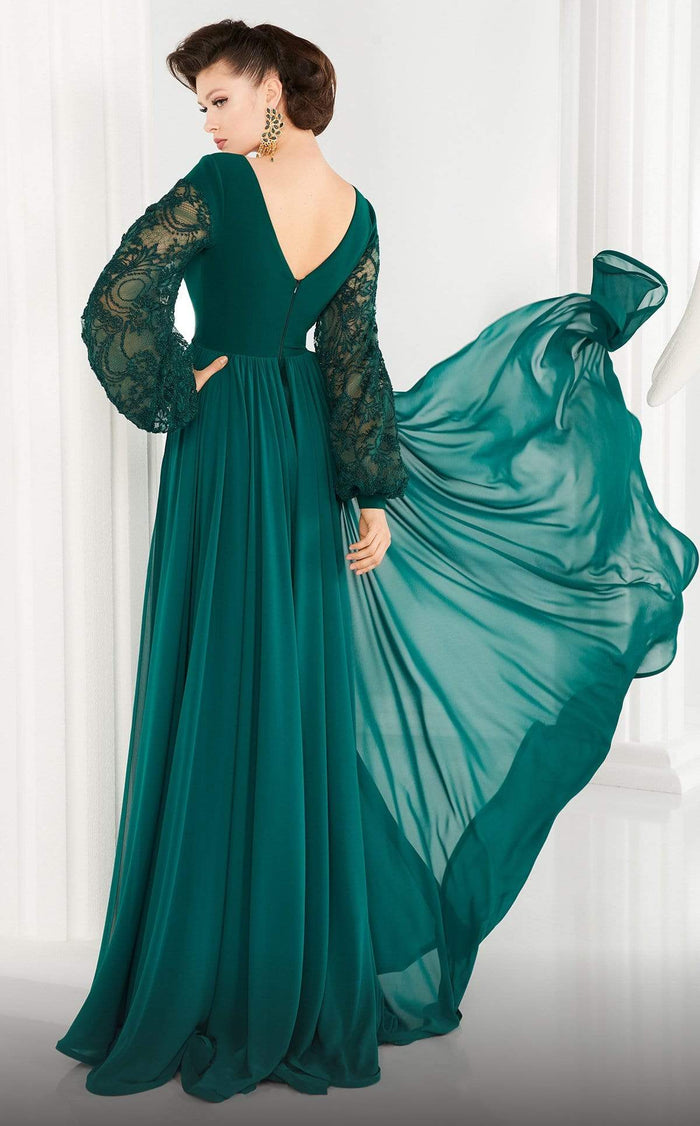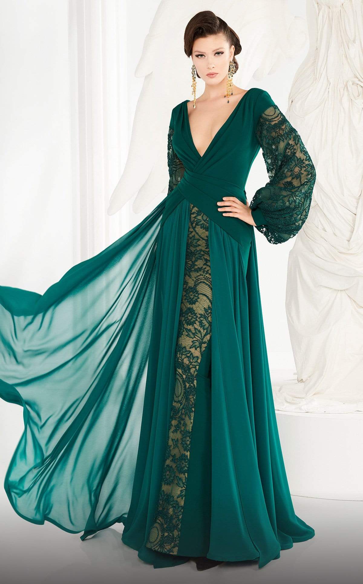 Sway in along the music as you charm everyone in this MNM Couture 2551 creation. Draped with a nude lining and an overlaying embroidered lace, this beauty shows a plunging v-neckline with a surplice style. Asymmetrically wrapped with pleats along the waist, the back reveals a v-design. The lace sheath skirt is overlaid with sheer tonal overskirt that ends with a train. Bask in the elegance and flair of this MNM Couture masterpiece. Model is wearing the Green color.