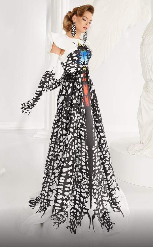 Refuse to be ignored at your sumptuous event in this MNM Couture 2592 creation. Exquisitely printed with a beautiful spectacle, this gown flaunts a high square neckline stringing from shoulder straps. Fluttering cap sleeves stream to render a square open back. Beaded appliques contrast the waist. The A-line skirt flows in soft flutters as it touches the floor with a train. Be delighted by the attention rendered by this MNM Couture masterpiece. Model is wearing the Black/White color.