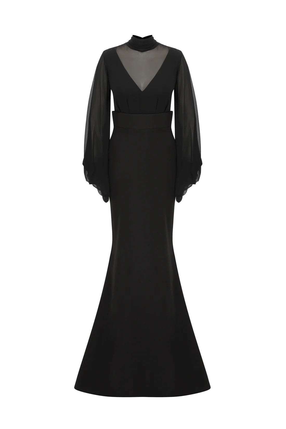 Elevate your evening look with the MNM Couture 2637A. Made from luxurious crepe with chiffon fabrics, this gown features a flattering V neck illusion high neck. The bishop style sleeves add a touch of sophistication, while the mermaid lower cut creates a stunning, elongated silhouette. Perfect for any special occasion, MNM Couture 2637A is a must-have for those who appreciate timeless elegance. Dress is pictured in Pink, Black, Black/White, and White variants.