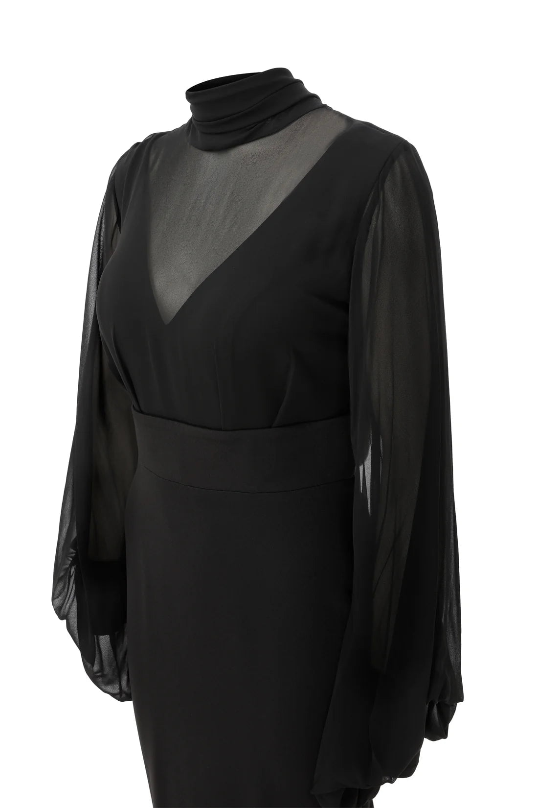 Experience ultimate luxury with MNM Couture 2637B evening gown. Made of crepe with chiffon, this exquisite dress boasts a beautiful illusion high neckline, a perfectly tailored fitted bodice, and a mermaid lower cut. Two full-length bishop sleeves add a touch of sophistication and exclusivity to this stunning gown. Model wears the Blue variant, embodying the elegance and class of this dress.