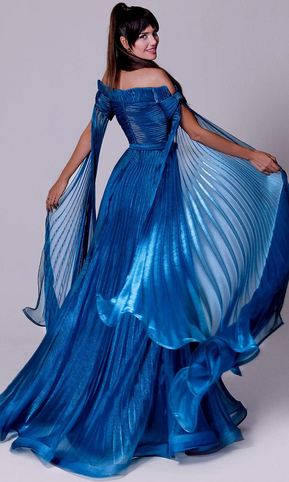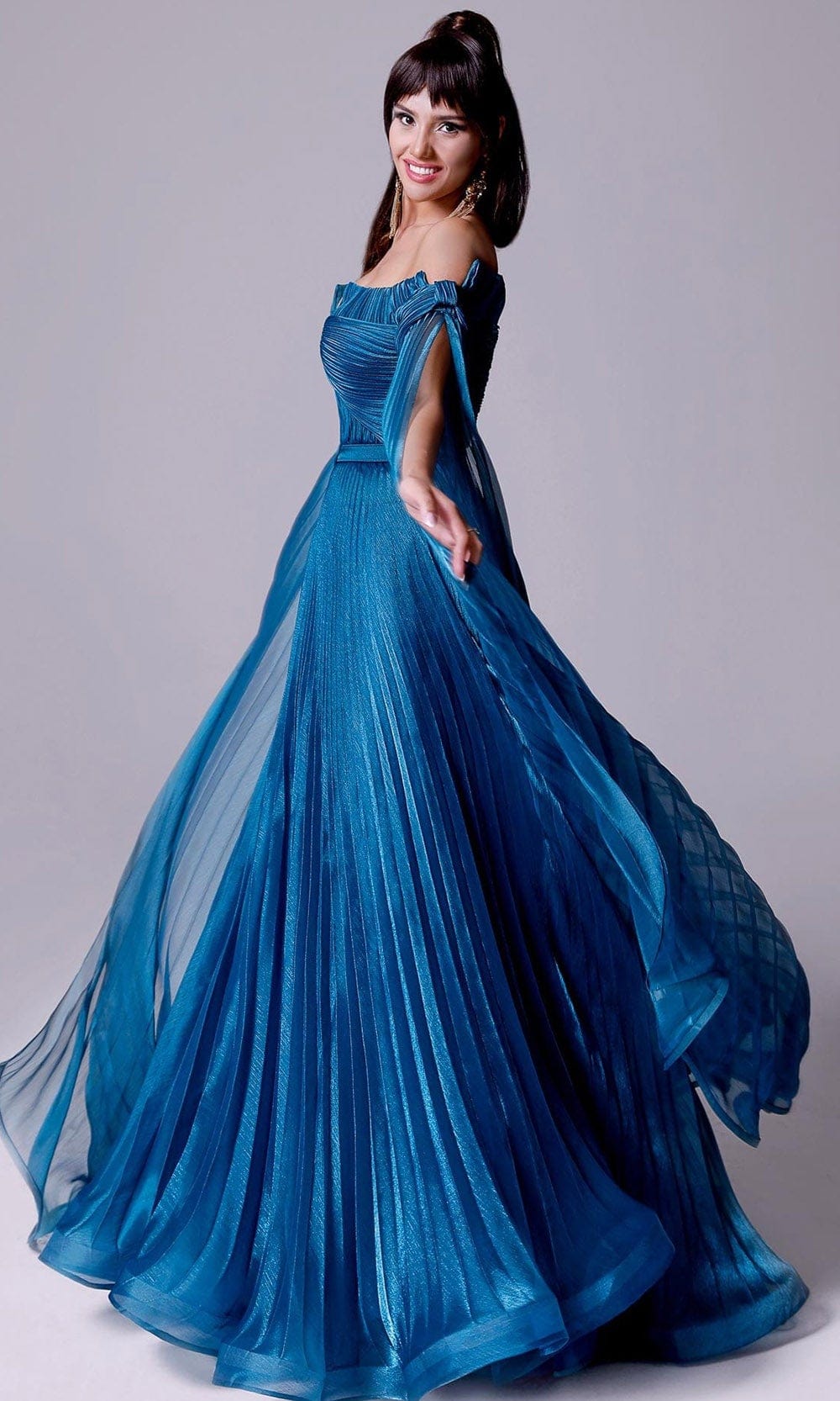 Mesmerize everyone with the style of this MNM Couture 2694 creation. Styled with intricately rendered pleats, this gown flatted with an off shoulder neckline with a notch accent and a bow detail. Draped with cascading split sleeves, the A-line skirt commences from a belted waist and ends with a train. Dominate everyone’s attention in this MNM Couture masterpiece. Each of MNM Couture design offers cutting edge styles that will make every woman look sophisticated. Dress is pictured in Petrol Blue, and Yellow variants.