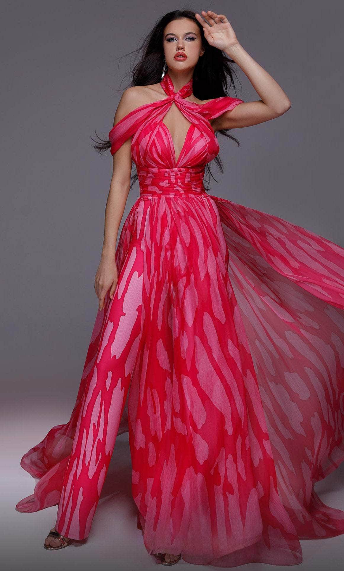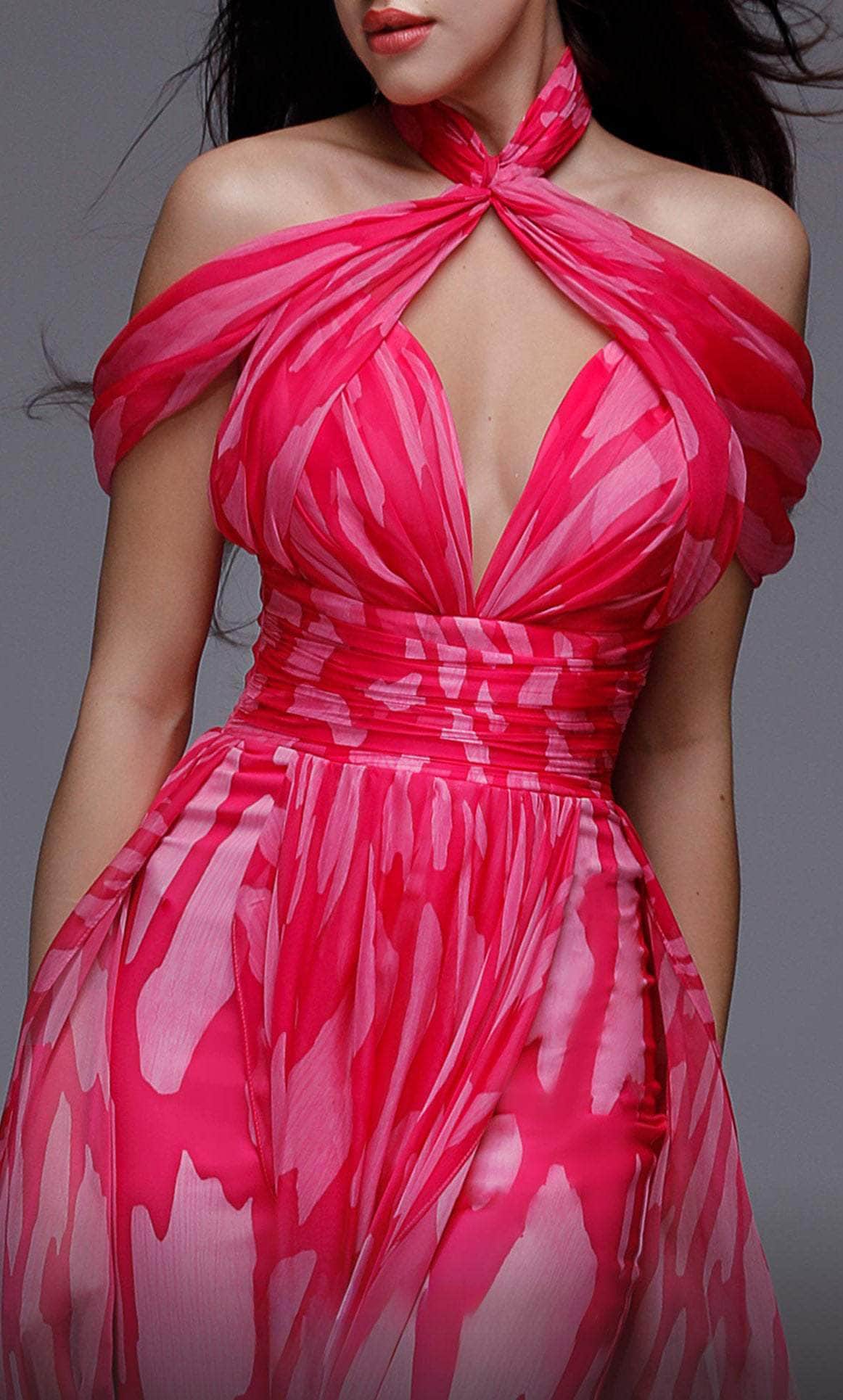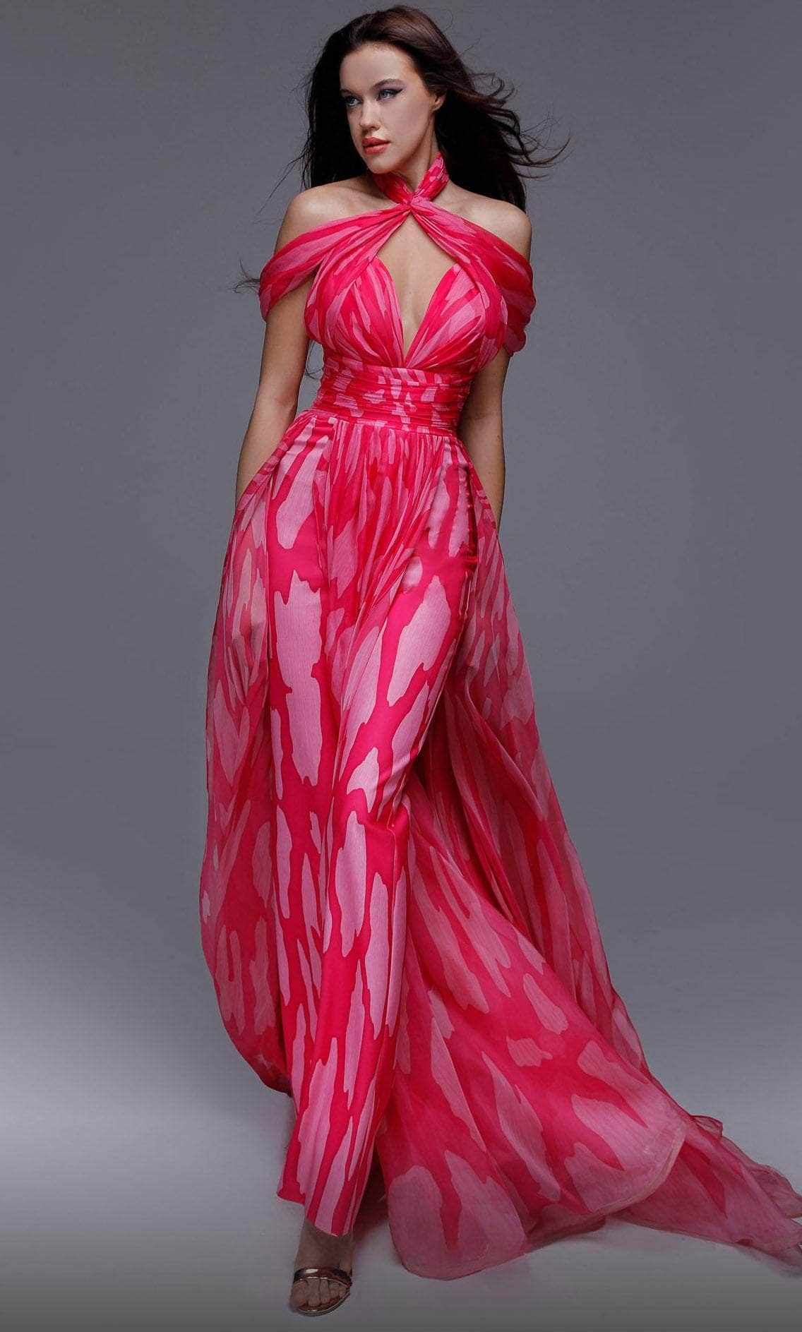 Flourish a chic style that will mesmerize the opulent crowd in this MNM COUTURE 2734 jumpsuit. Charmingly detailed in two-tone print and ruching, this ensemble unveils a high halter neckline with a front v-shaped cut and an off-shoulder sleeve. A ruched wide waistband perfectly defines the waist. The bottom has a pair of straight pants that flows into a full length hem, completed with a floor sweeping A-line overskirt. This MNM COUTURE 2734 creation is truly remarkable! Models are wearing the Blue/Beige, Fuchsia With Yellow and Pink colors.