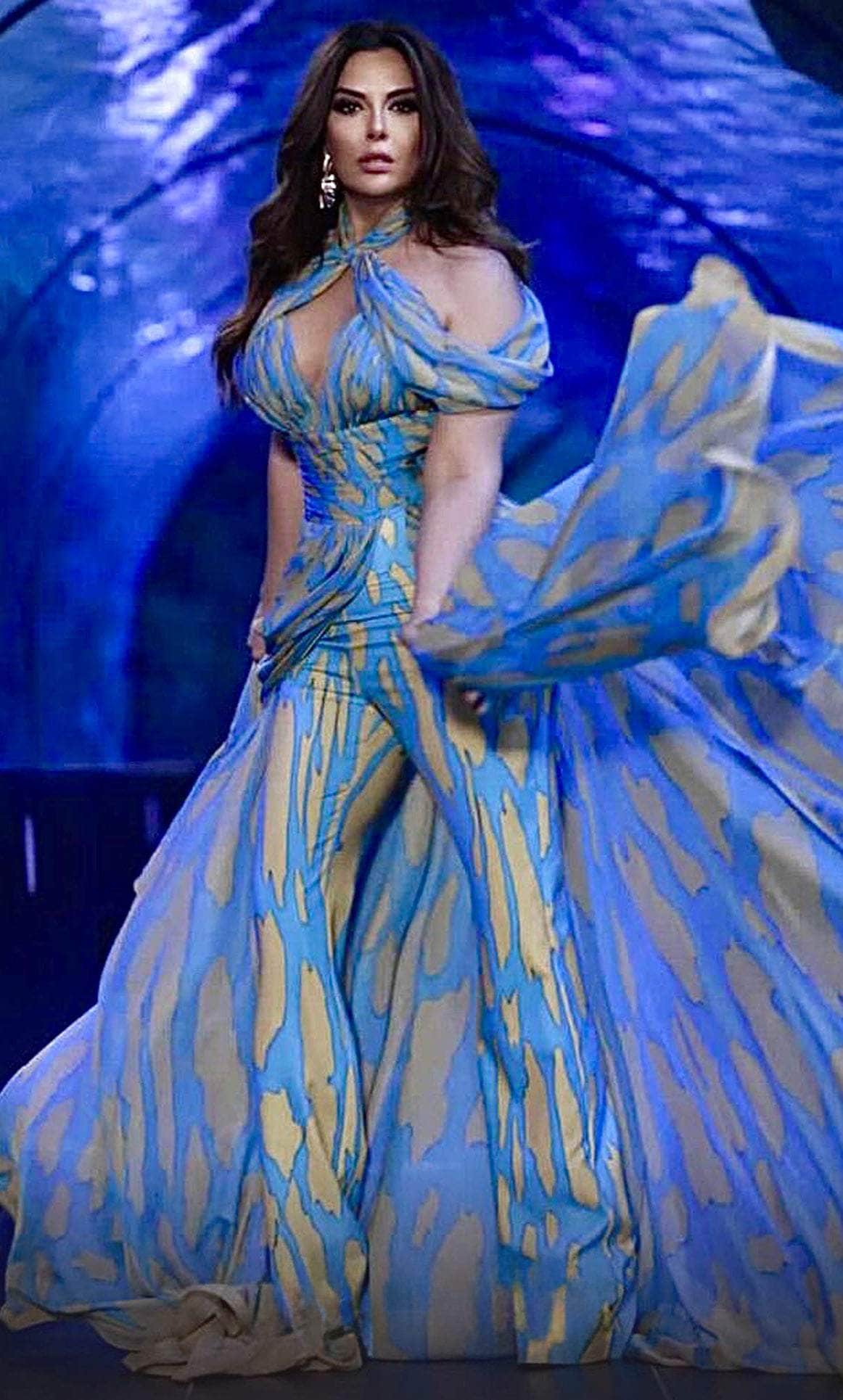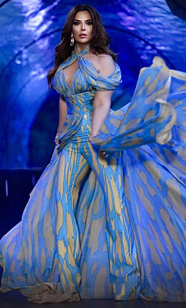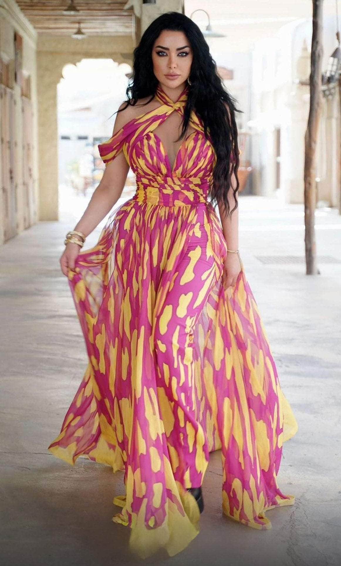 Flourish a chic style that will mesmerize the opulent crowd in this MNM COUTURE 2734 jumpsuit. Charmingly detailed in two-tone print and ruching, this ensemble unveils a high halter neckline with a front v-shaped cut and an off-shoulder sleeve. A ruched wide waistband perfectly defines the waist. The bottom has a pair of straight pants that flows into a full length hem, completed with a floor sweeping A-line overskirt. This MNM COUTURE 2734 creation is truly remarkable! Models are wearing the Blue/Beige, Fuchsia With Yellow and Pink colors.