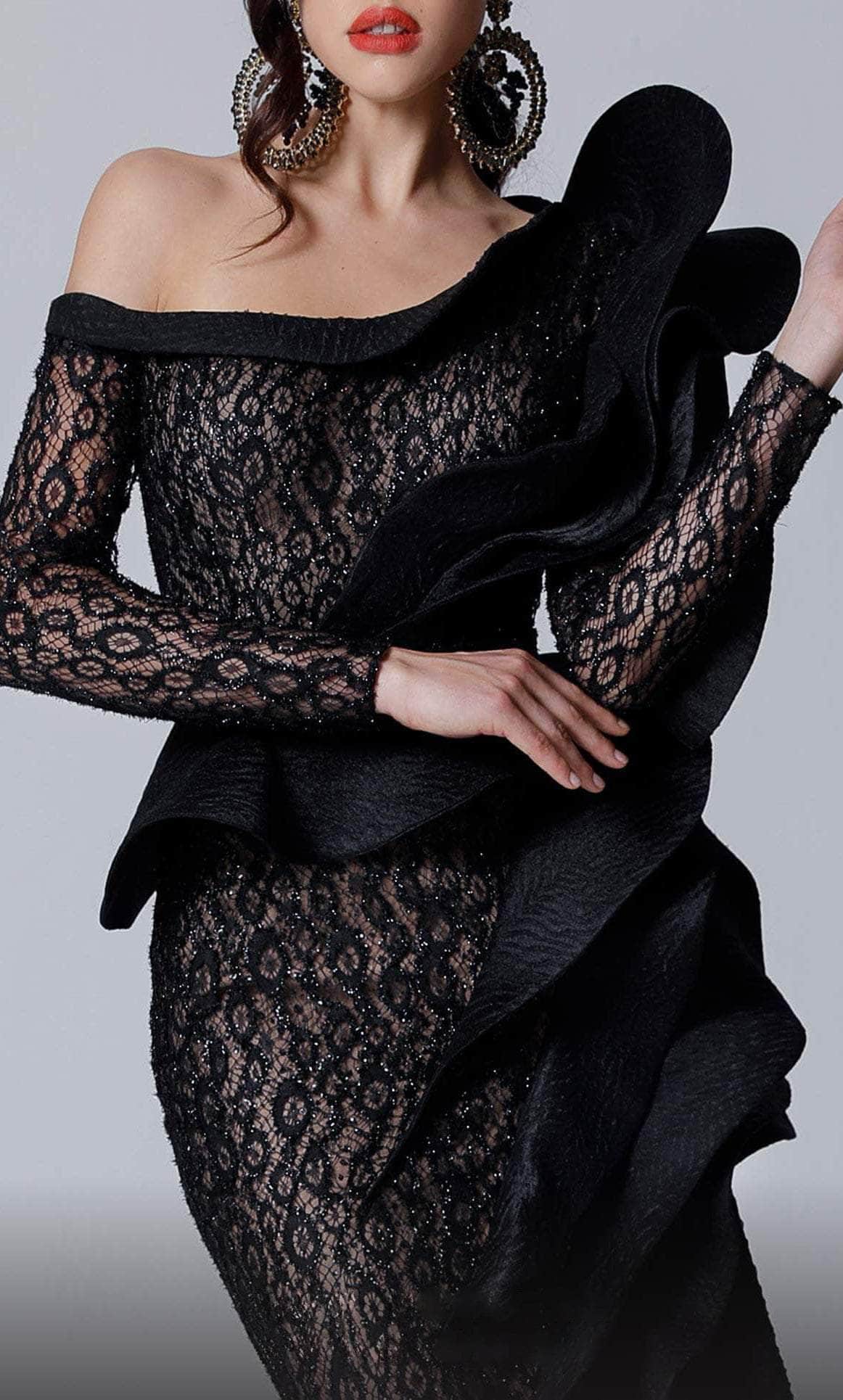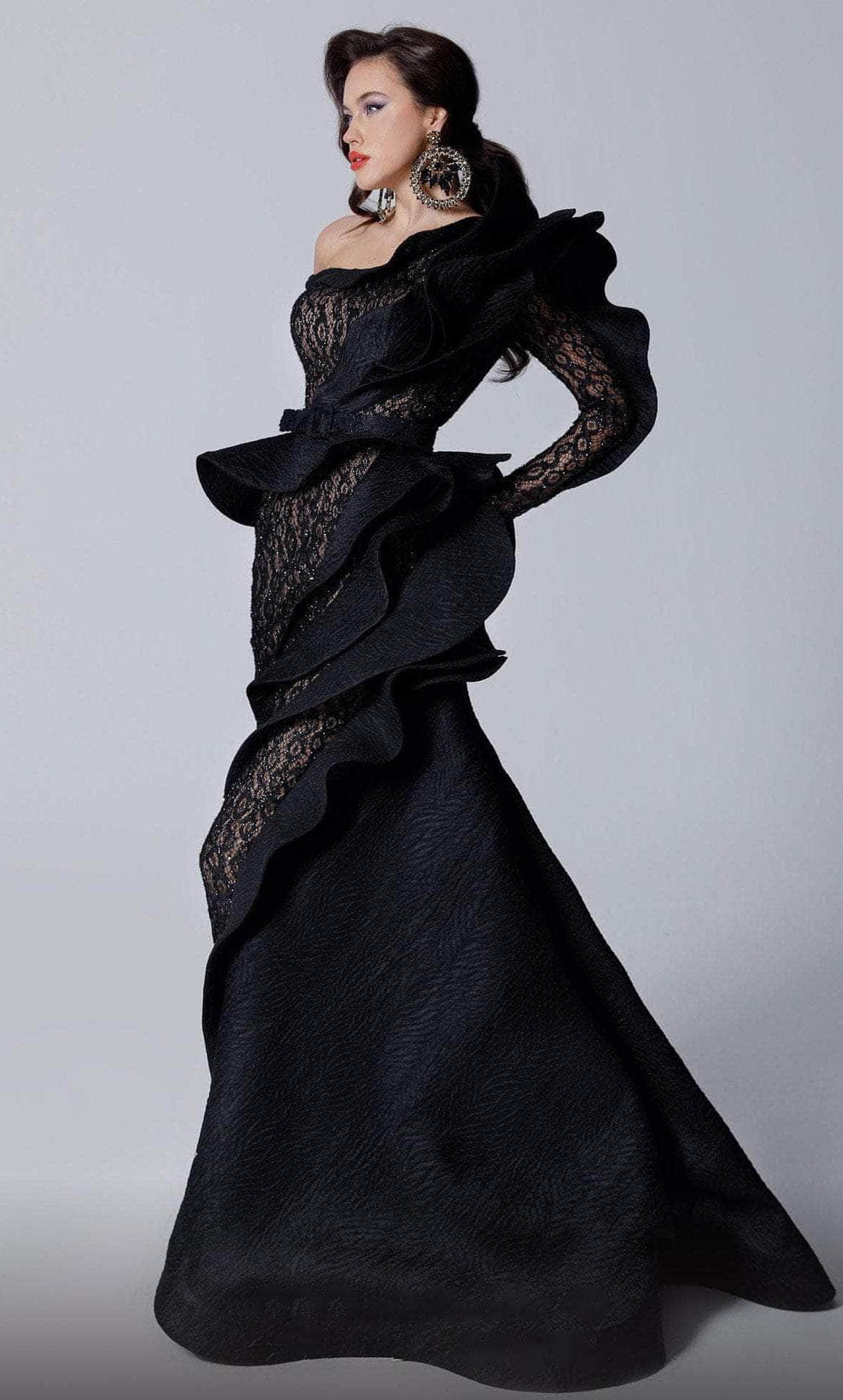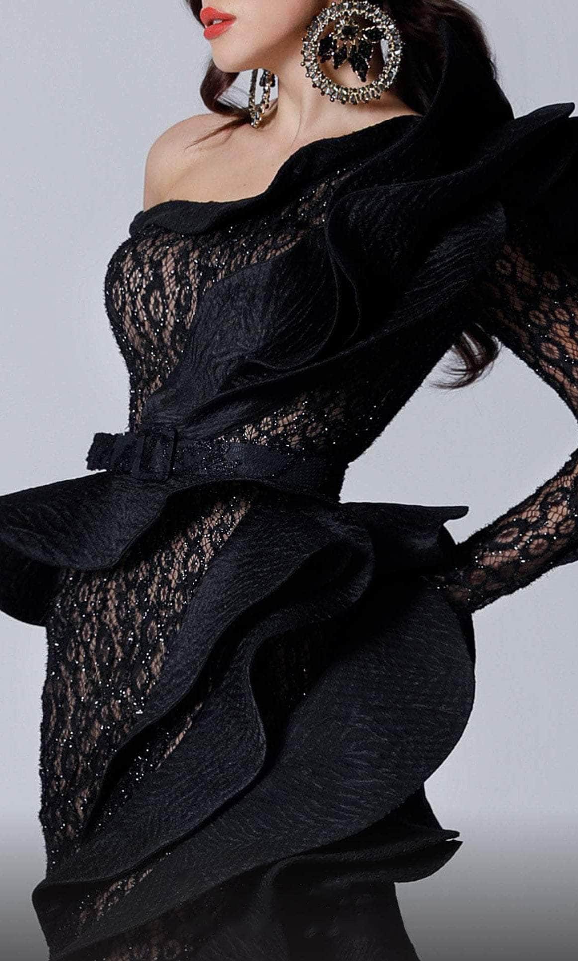 Fantasize a night of eloquent style and poise at your black-tie event in this wonderful MNM COUTURE 2735 masterpiece. Stand out in this classy fitted gown made from lace fabric with sparkly beadwork and a ruffled jacquard wrap along the bodice. This style features an asymmetrical neckline, long sleeves and a matching belt. The mermaid skirt skims along the hips and flares down into a sweeping train for a ravishing finish. This MNM COUTURE 2735 creation will sure to display your natural beauty and grace. Model is wearing the Black color.