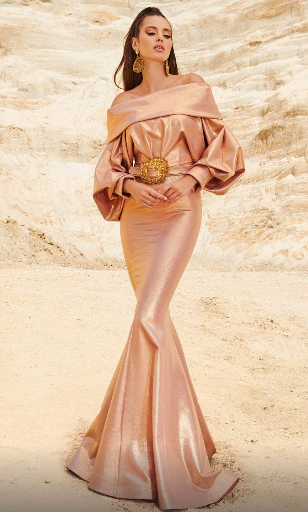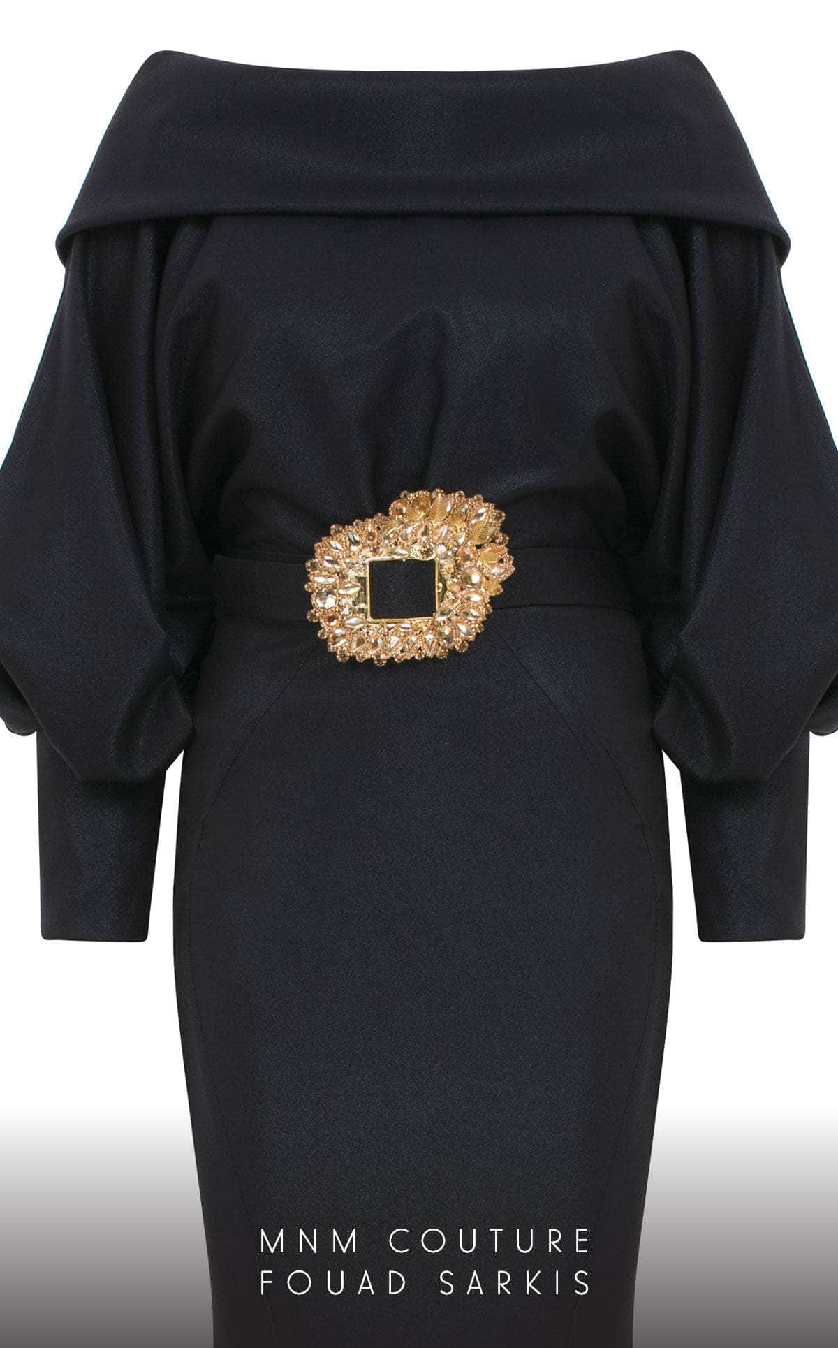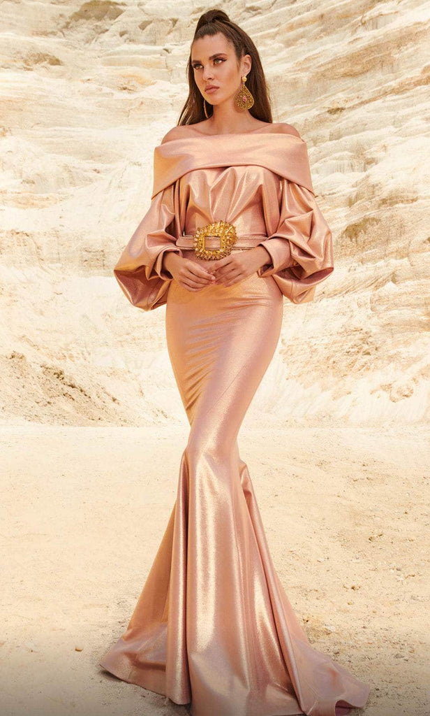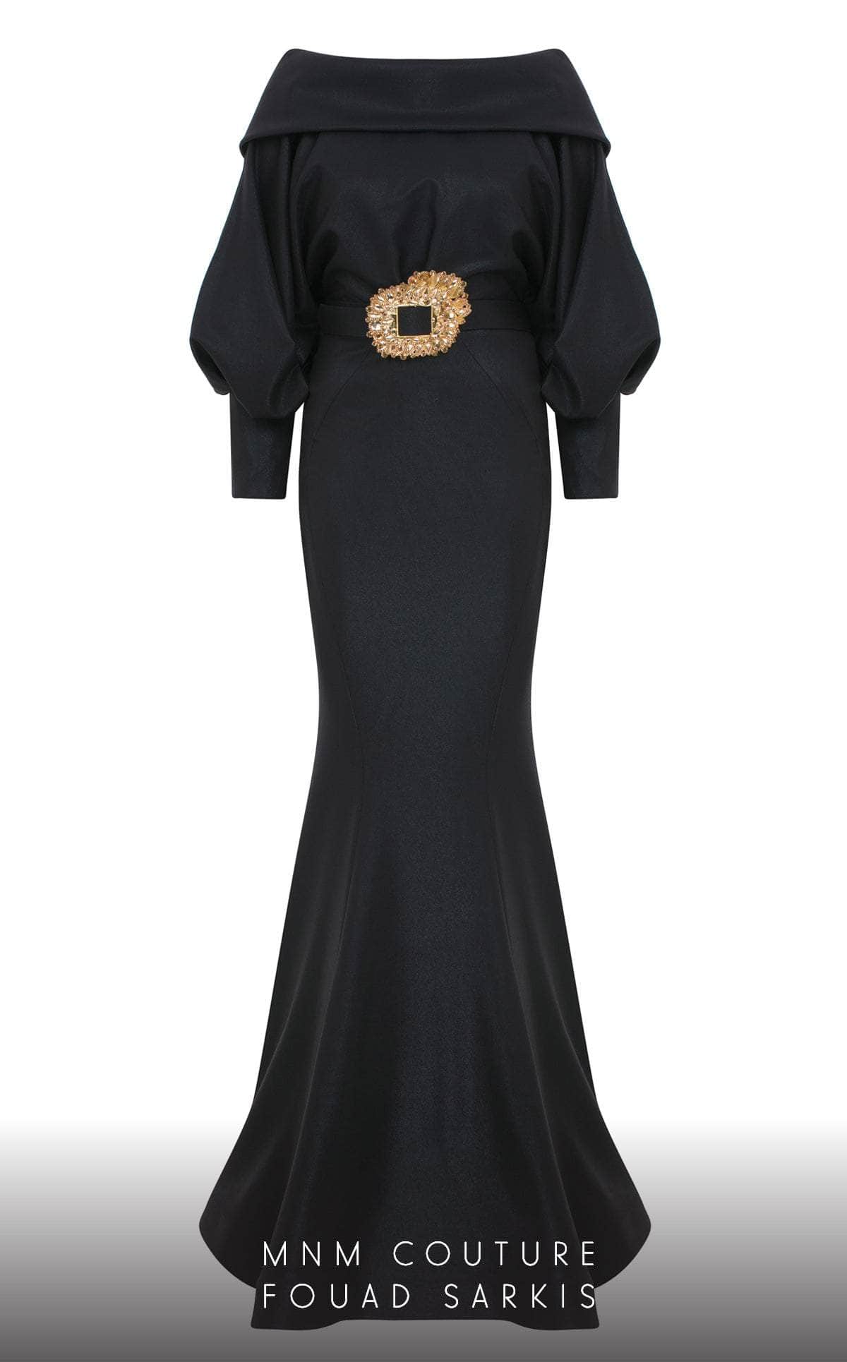 Look impeccably chic and polished as you sweep them off their feet in this dazzling MNM Couture 2752 masterpiece. This stylish piece features an off-shoulder bodice crowned with a straight-across neckline framed with balloon long sleeves. The skirt in a mermaid silhouette cascades to the floor with a sweeping denouement, highlighting a gorgeous belt that cinched the bodice. Be the center of attention in this glamorous MNM Couture 2752 gown.