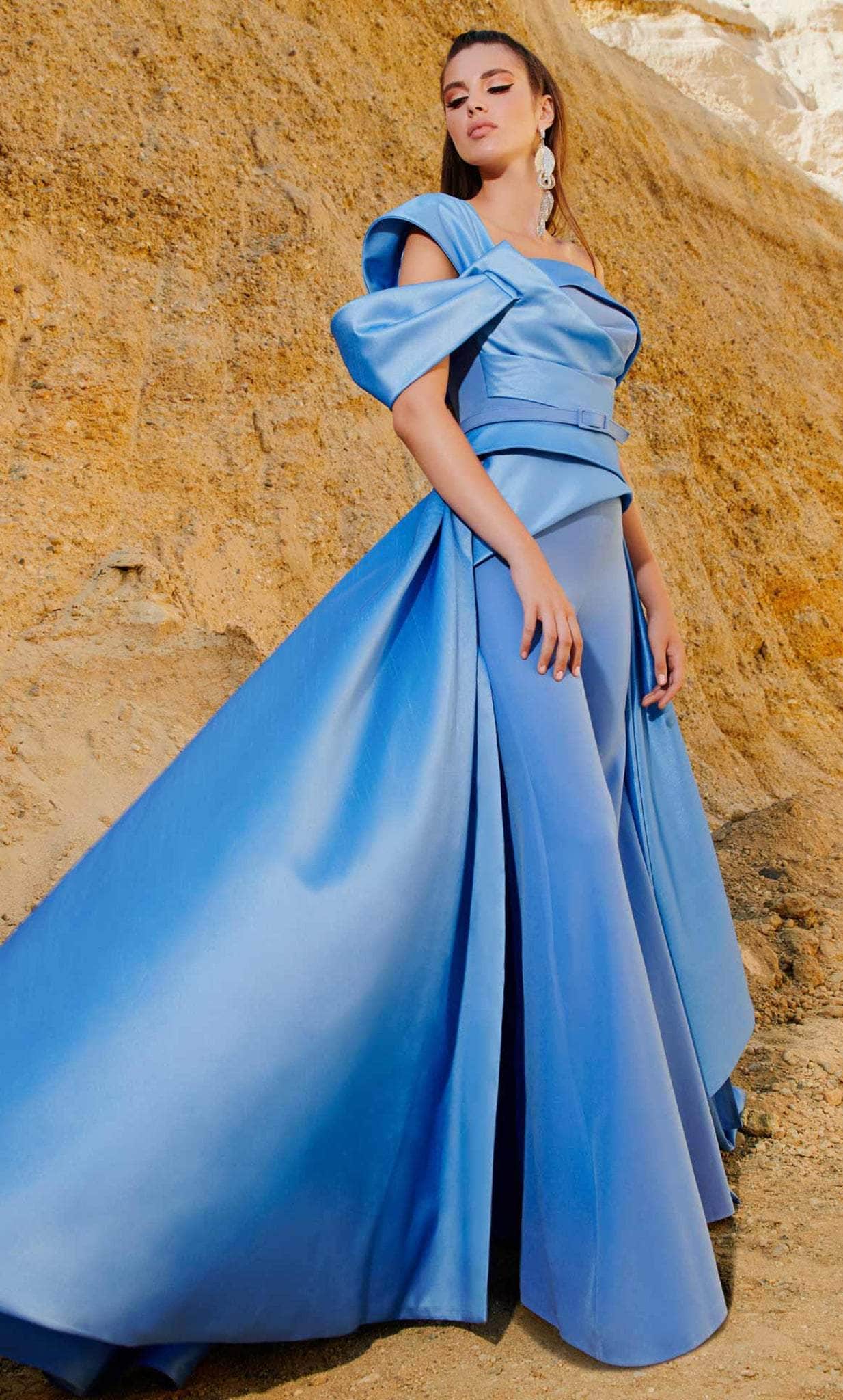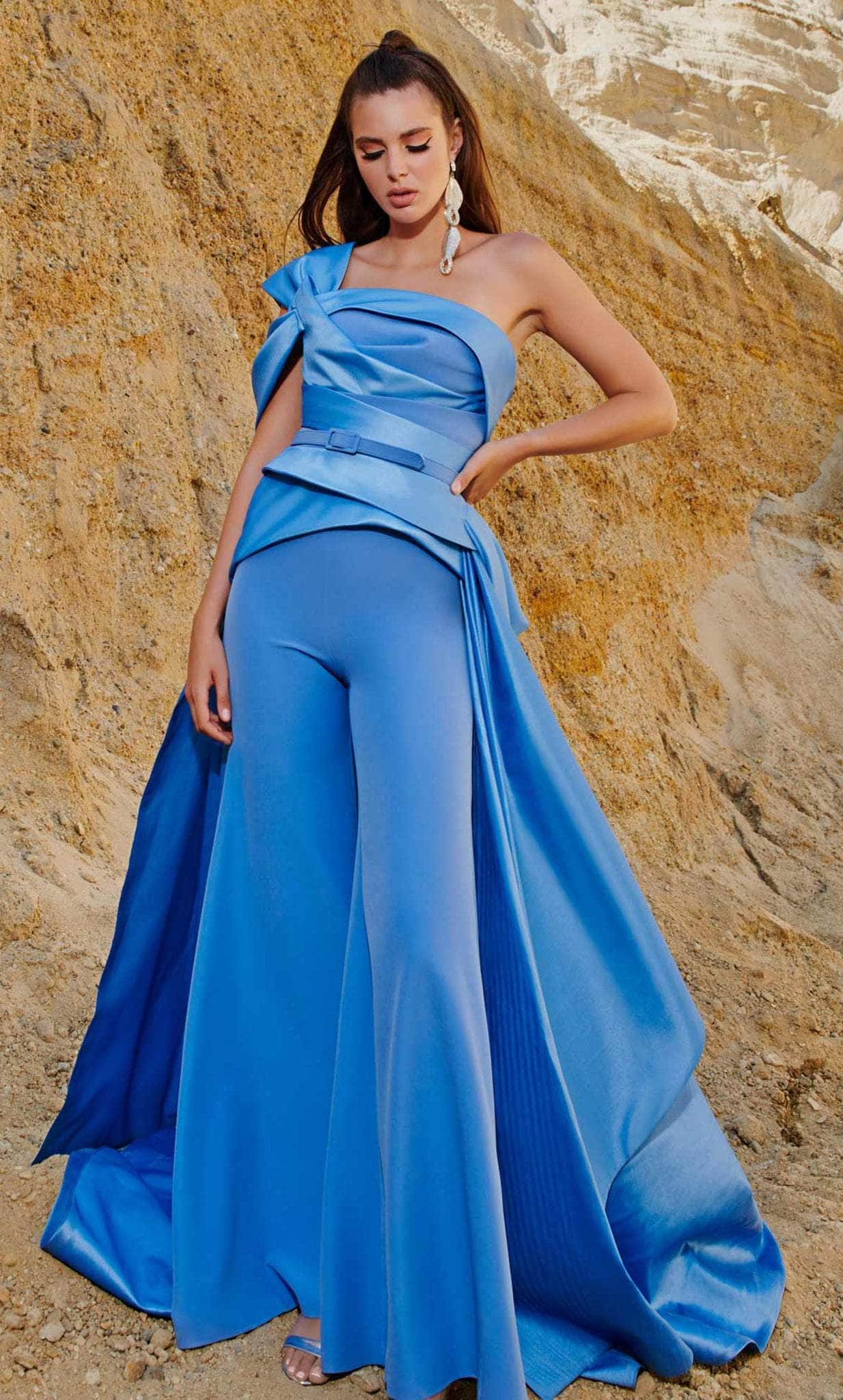 Channel red carpet glamour wearing this MNM COUTURE 2753 jumpsuit. Beautifully structured with pleating and folded detail, this style gives an exceptional and attention-grabbing look. Featuring an asymmetrical neckline, matching belt and a short sleeve, this also shows a mid-open back with a zipper fastening. A pair of wide leg pants flowing to the full length hem and a floor-sweeping A-line overskirt complete this stunning outfit. Be the spotlight wearing this extravagant MNM COUTURE 2753 creation. Model is wearing the Blue color.