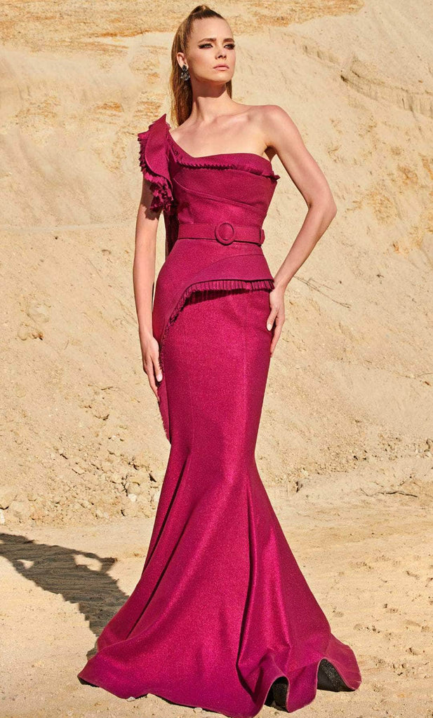 | Details: | Pleats, Asymmetric, One shoulder strap, Belt, Fitted bodice, Peplum, Floor length, Sweep train |