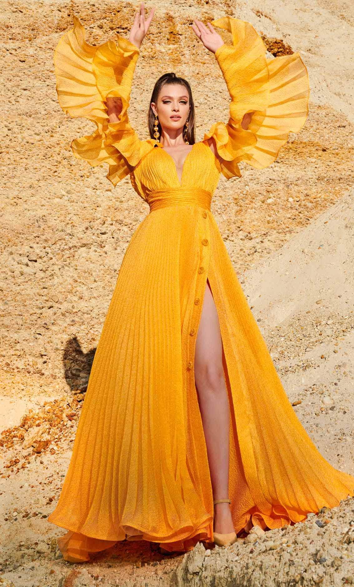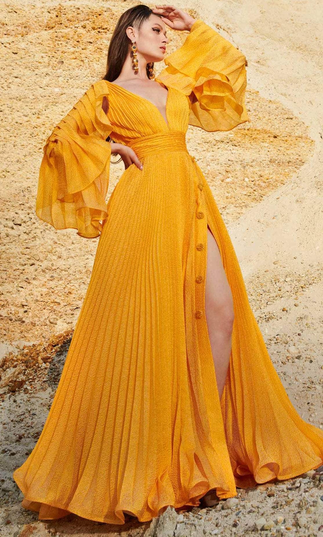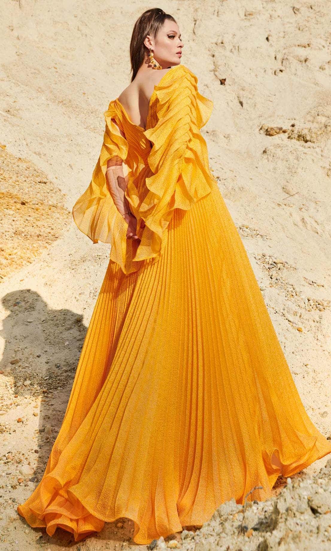 This MNM Couture 2775 is the perfect choice for the girl who wants to look attractive without being suggestive. The whole fabric used is designed with small pleats from neck down to the hem. Even the sleeves flutter in full length and it fashions a plunging neckline with high thick waist band. Thigh-high slit accentuates your legs and add sexiness to the A-line silhouette of this gown. MNM Couture 2775 is an instant refresh for your eveningwear repertoire. Model is wearing Mustard color.