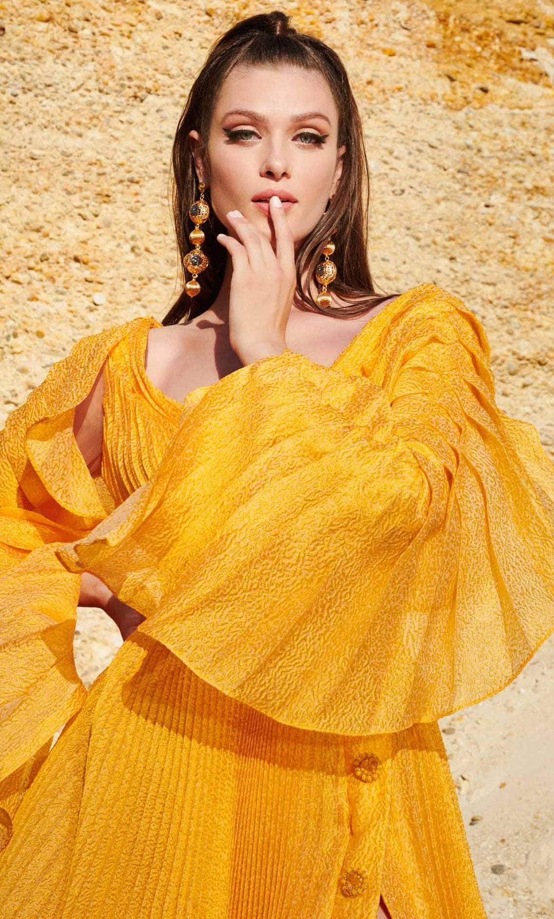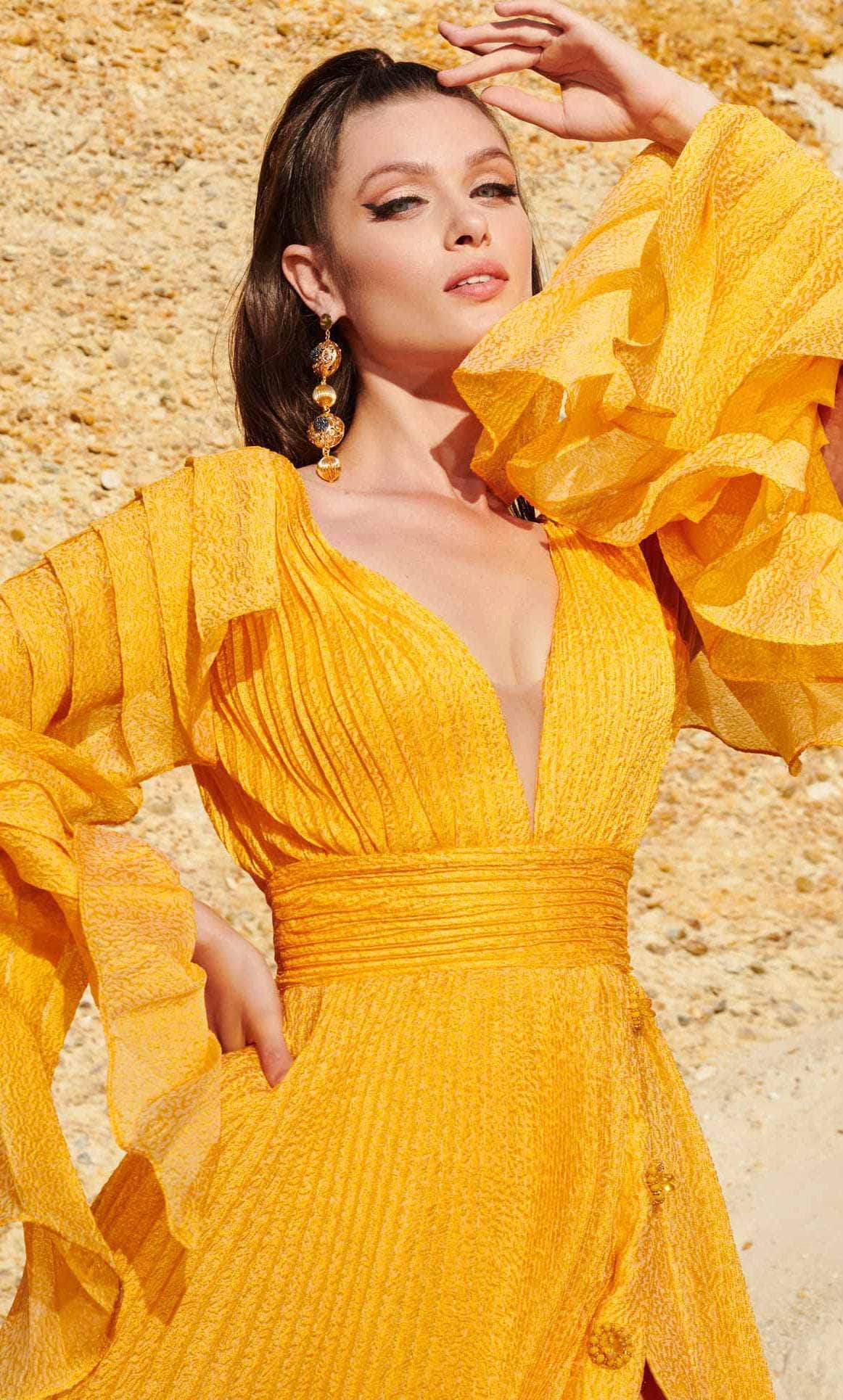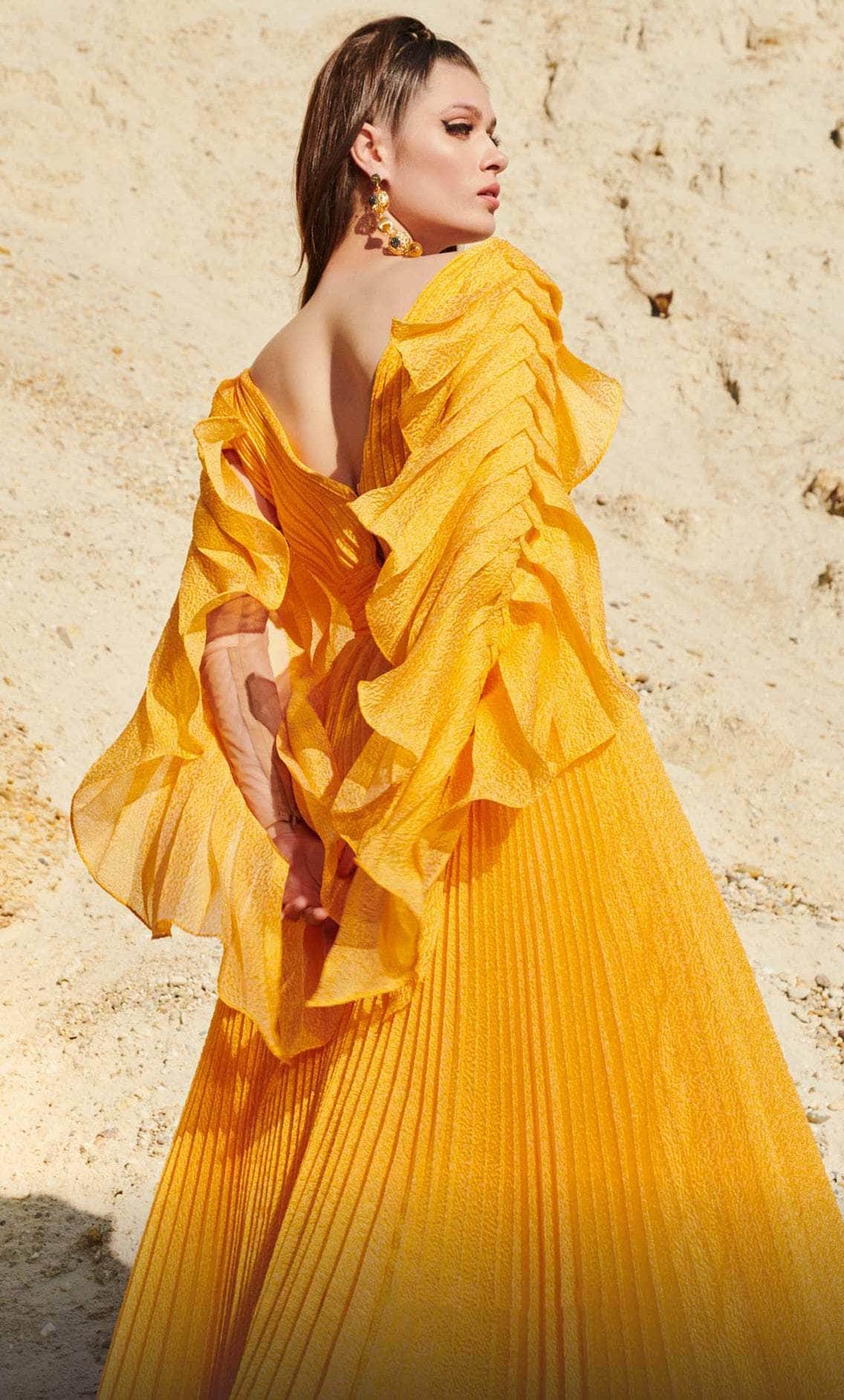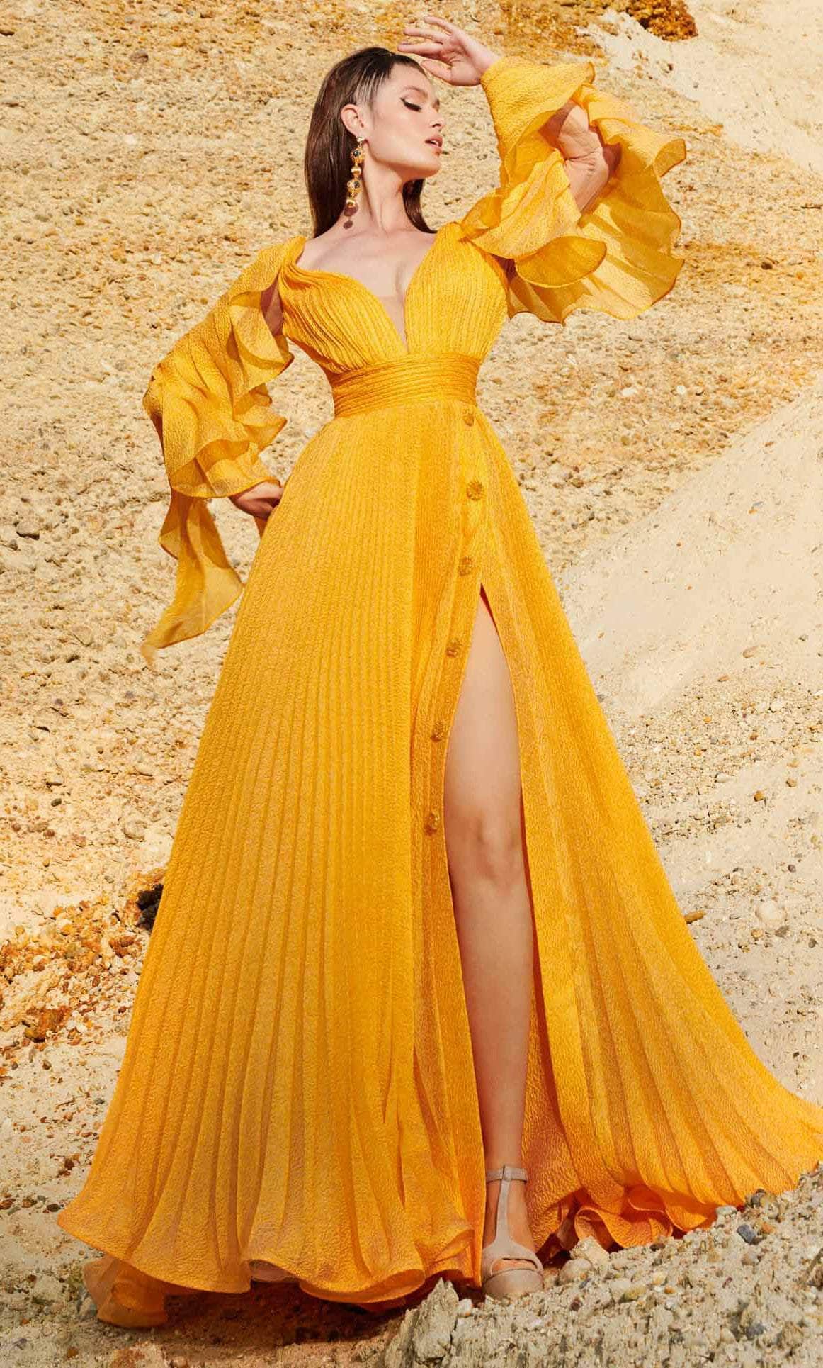 This MNM Couture 2775 is the perfect choice for the girl who wants to look attractive without being suggestive. The whole fabric used is designed with small pleats from neck down to the hem. Even the sleeves flutter in full length and it fashions a plunging neckline with high thick waist band. Thigh-high slit accentuates your legs and add sexiness to the A-line silhouette of this gown. MNM Couture 2775 is an instant refresh for your eveningwear repertoire. Model is wearing Mustard color.
