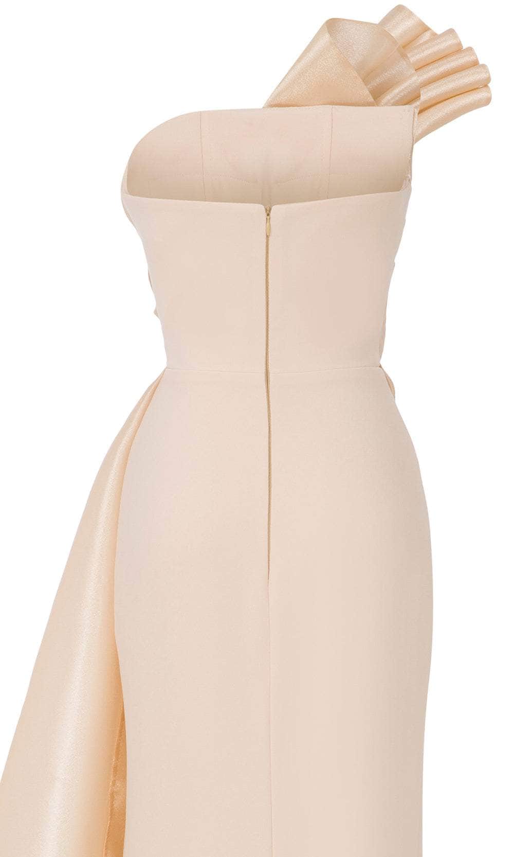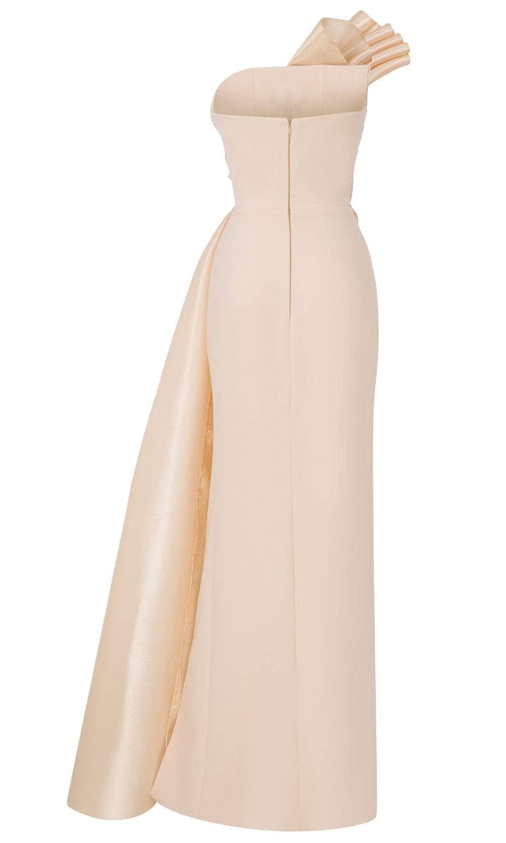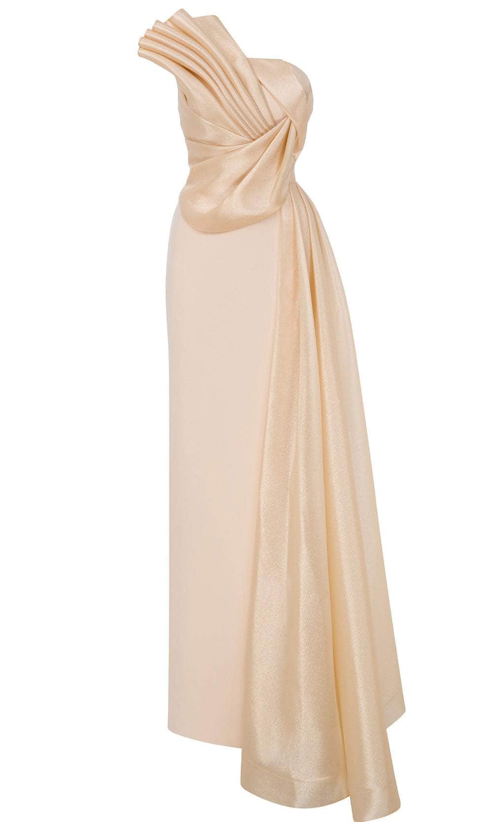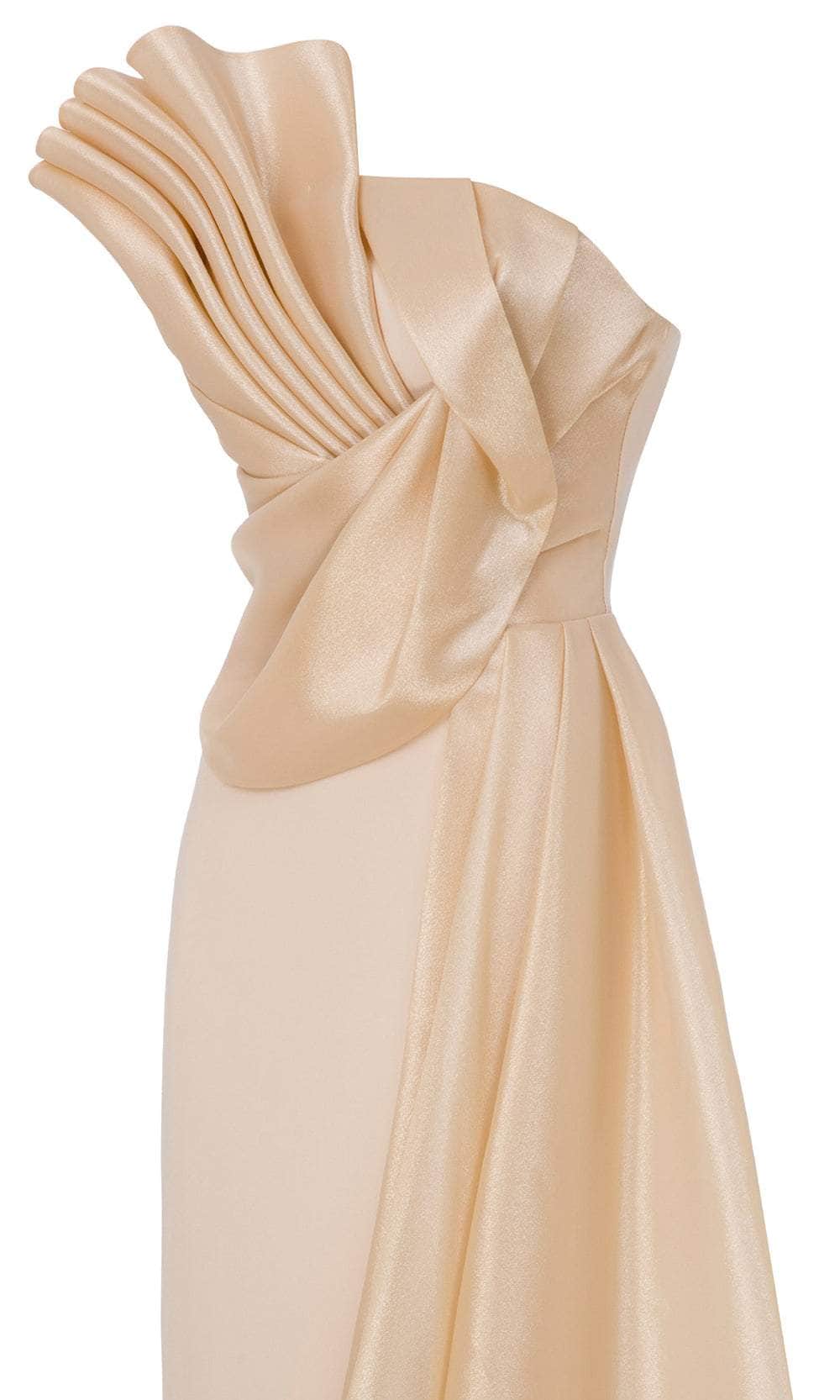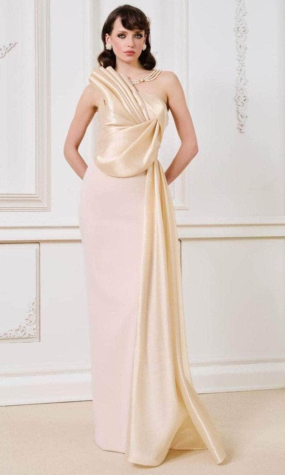Indulge in sculptural sophistication with MNM Couture B1130, a strapless long dress that exudes timeless grace. It features a chic asymmetric neckline, mid-open back and a sexy thigh-high leg slit. The pleated bodice creates a rich textural element that wraps around the torso, forming an elegant swirl that anchors the draped accent cascading from shoulder to waist. Its smooth column silhouette enhances the figure with understated precision, creating a powerful visual presence. Command attention with MNM Couture B1130, where classic form meets modern artistry. Model is wearing Gold color.