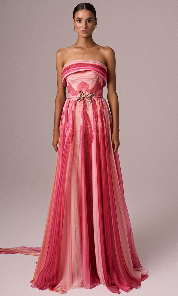 Vivid and youthful, MNM Couture E0079 is a celebration of color and form. This strapless gown features a pleated bodice and structured thin belt at the natural waist, detailed with gold-tone hardware for a modern twist. The flowing A-line skirt showcases a vibrant stripe pattern, while the cape-style design at the back adds red carpet-worthy drama. Perfect for gala events or upscale celebrations, MNM Couture E0079 brings bold style to classic femininity. Model is wearing Pink color.