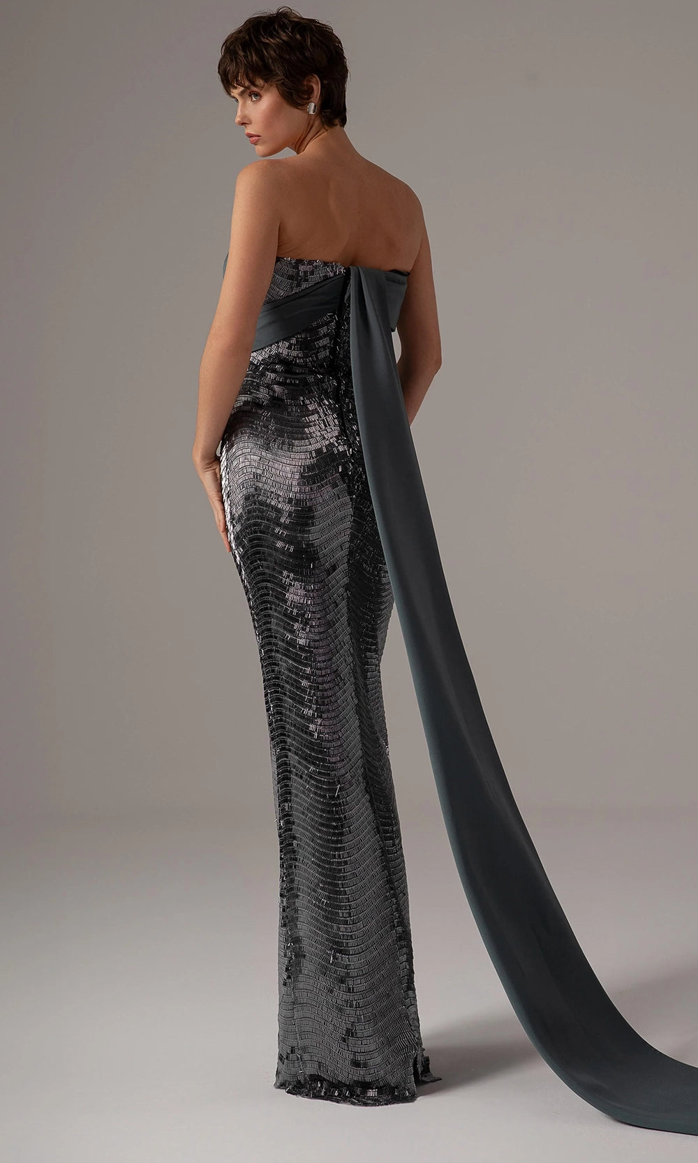 Striking in both texture and form, this MNM Couture E0087 gown offers a perfect harmony of sleek lines and dramatic embellishment. The strapless bodice is crowned with an asymmetrical folded neckline, adding depth and visual intrigue. Its fitted column silhouette accentuates the body shape, while the embroidery reflects light with a mesmerizing effect. The floor-length skirt and back long cape delivers an added dose of sophistication. The MNM Couture E0087 is designed for those who want to make a lasting impression through modern elegance and bold detailing. Model is wearing Silver color.
