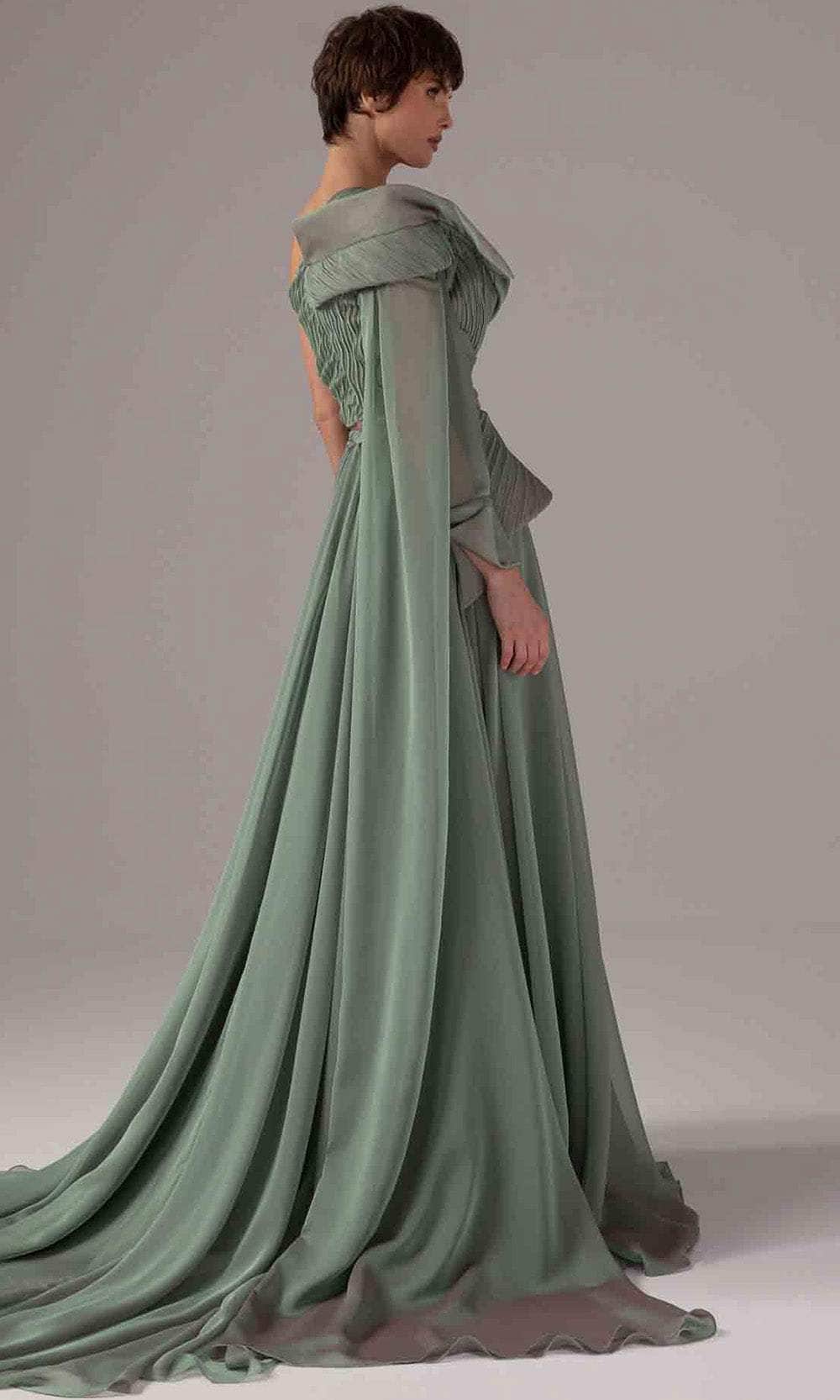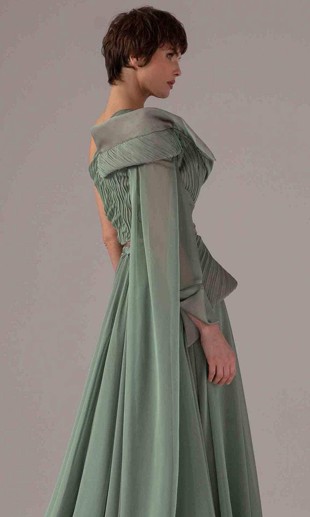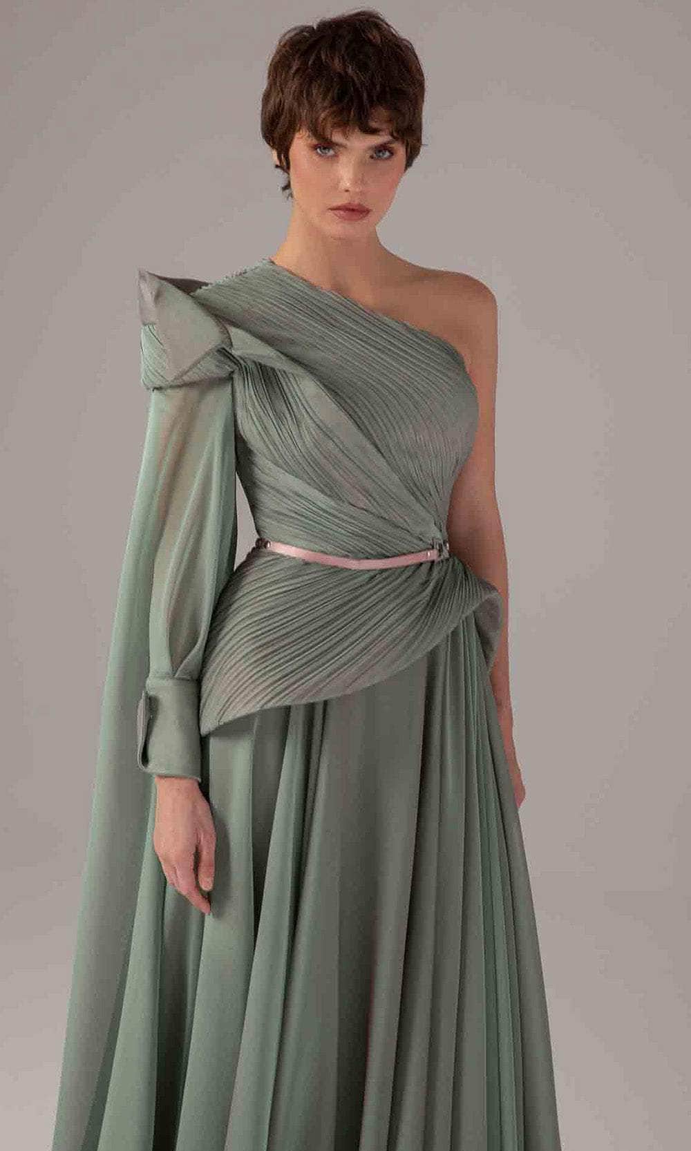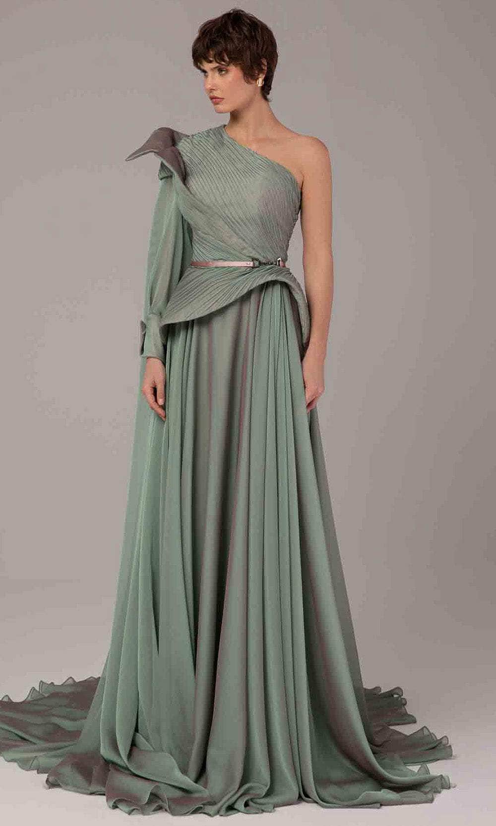 Make a statement with MNM Couture E0097, a breathtaking one-shoulder gown that blends asymmetry and texture with sculptural grace. The ruched bodice wraps across the torso with refined elegance, flowing into a structured overlay that mirrors the lines of the single long sleeve. A sleek belt defines the waist, while the skirt unfurls in an A-line silhouette that offers volume and fluidity. Perfect for formal galas or fashion-forward events, MNM Couture E0097 captures the essence of innovative couture style. Model is wearing Green color.