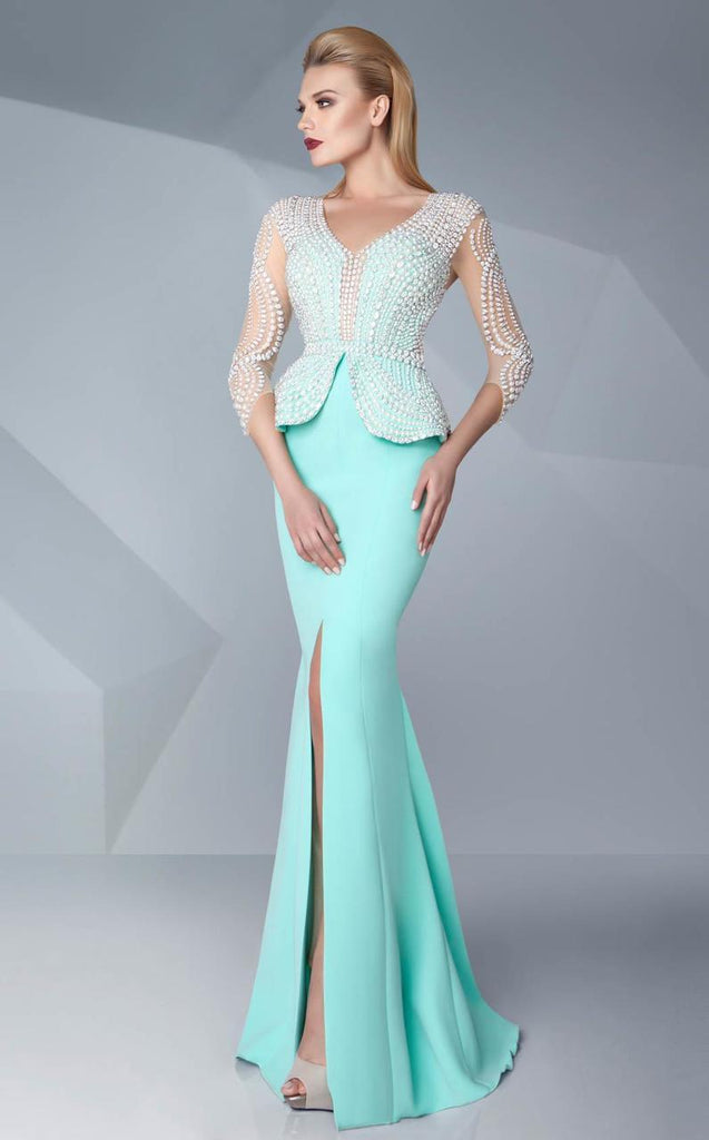 Exude enchanting elegance as you grace every party with your exquisite presence in this stunning MNM Couture G0573 creation. Intricately crafted with pearl and crystal beads on an illusion bodice, this captivating piece showcases a v-illusion over a plunging sweetheart neckline and sheer scalloped quarter sleeves. Cinched at the waist with an iridescent embellished band and a split peplum detail, the sculpted mermaid skirt that parts with a thigh high slit and flows impeccably down to complete with a sweep of train. Inspire awe in this mesmerizing MNM Couture masterpiece.