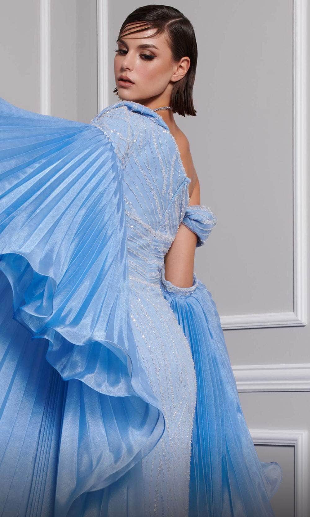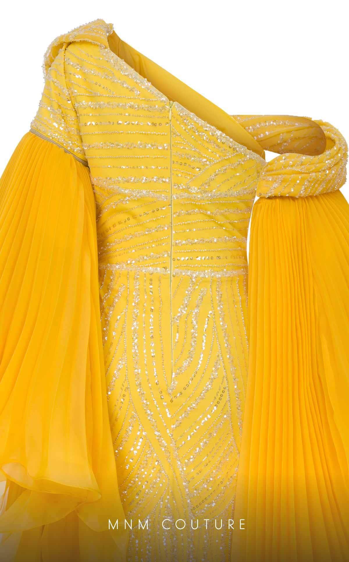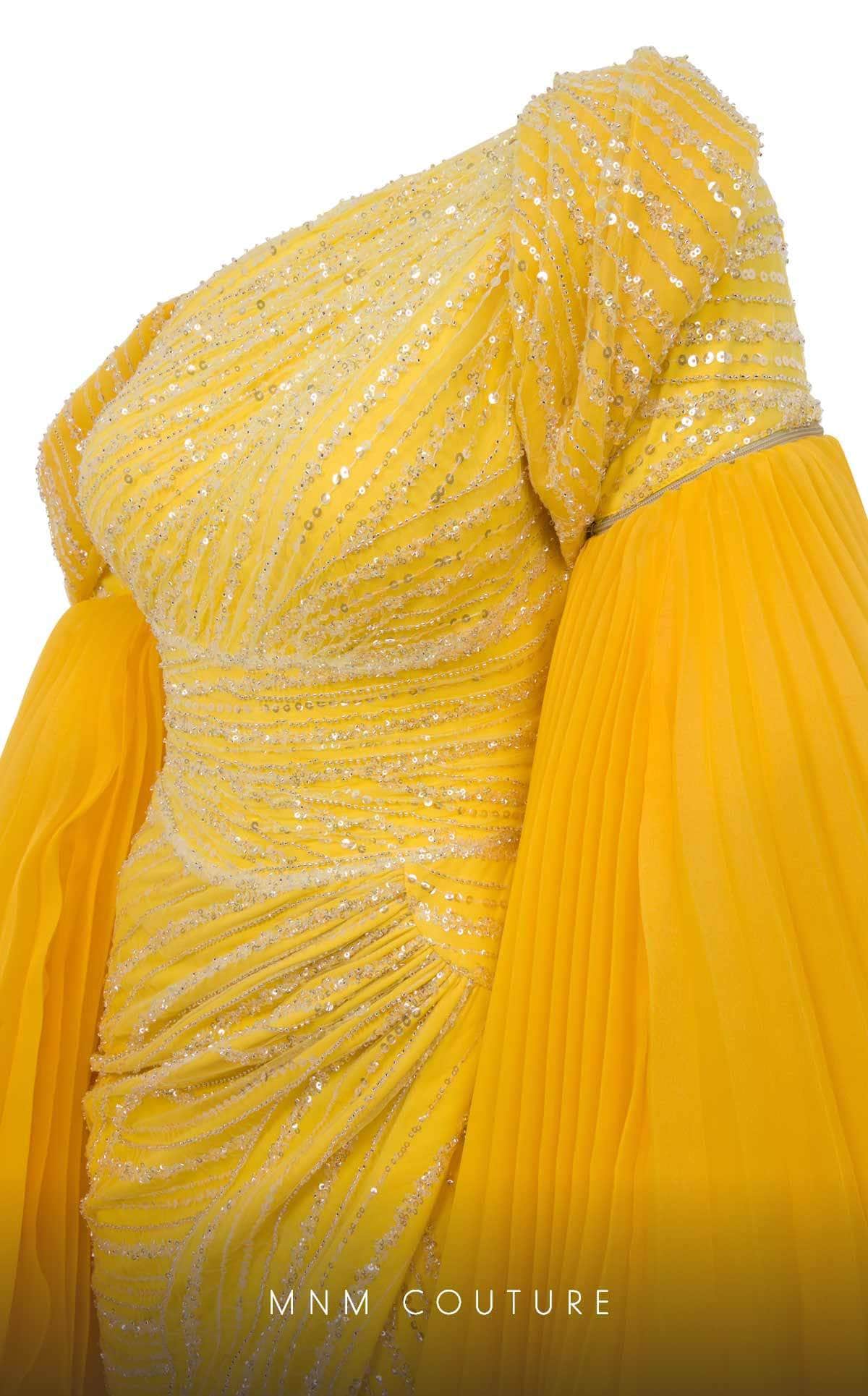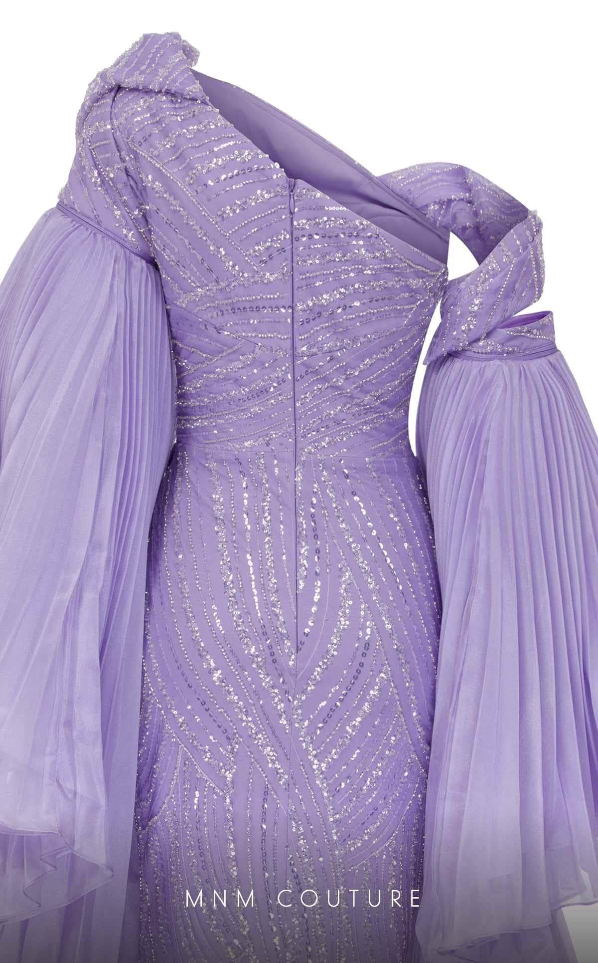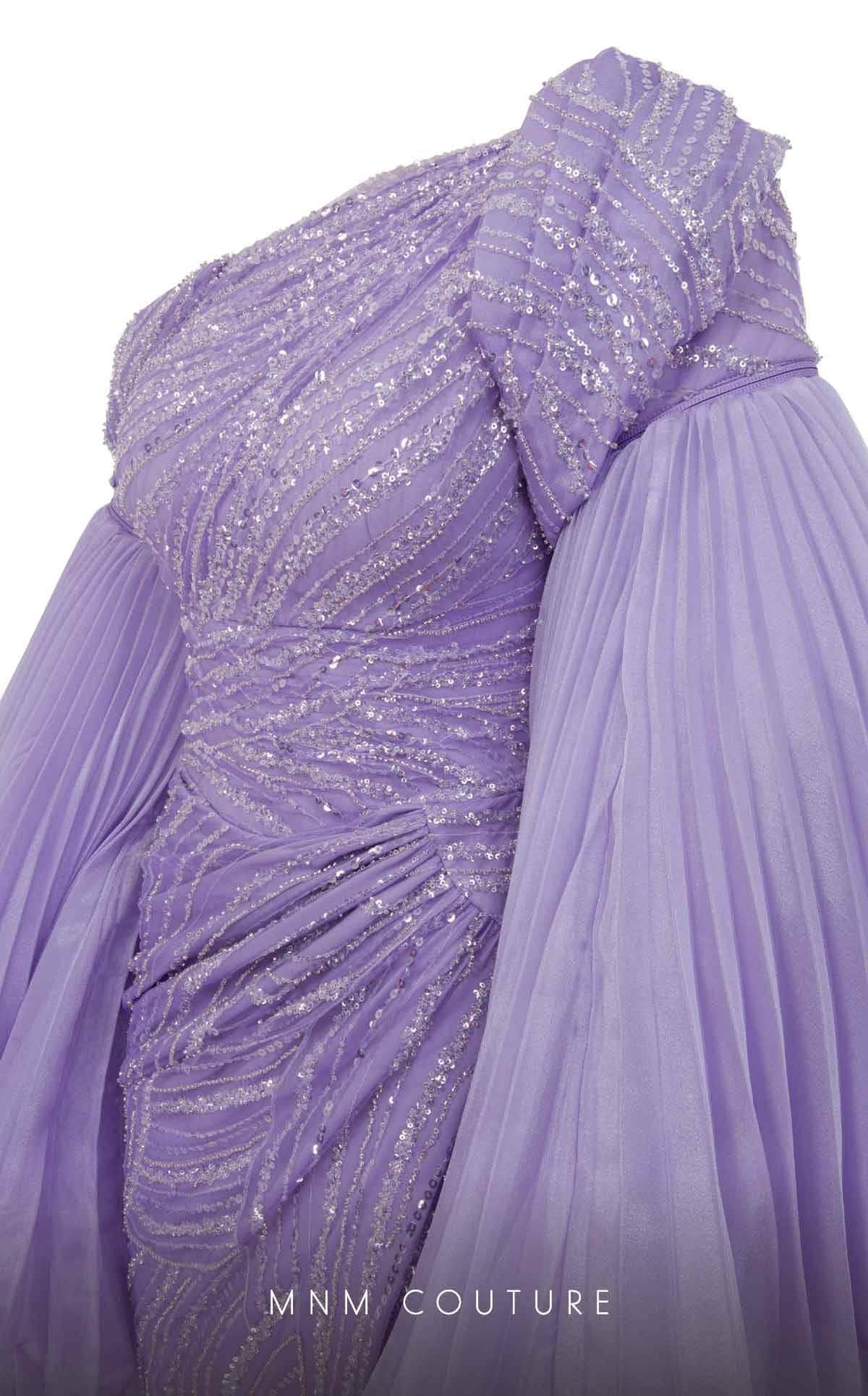 Make an entrance that sets you apart from the rest in this MNM Couture F02816A creation. Encrusted with a blend of shimmering sequins and beadworks, this gown is truly an extravagant stunner. The asymmetric neckline, mid-open back and short sleeves are features. A wide band accentuates your waist beautifully. The sheath skirt displays a beautiful wrap design, which reveals a sexy high leg slit on the front. It also includes detachable pleated long cape sleeves for a dramatic and fashionable flair. This MNM Couture F02816A design promises to grab attention with its striking charm.