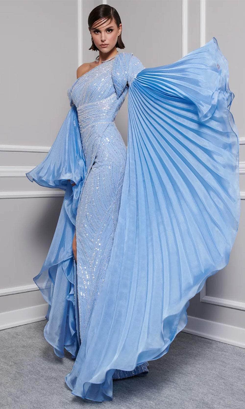 | Details: | Short Sleeve, Beaded, Sequin, Wide Waistband, Mid-Open Back, High Slit, Detachable Cape Sleeve with Pleated |