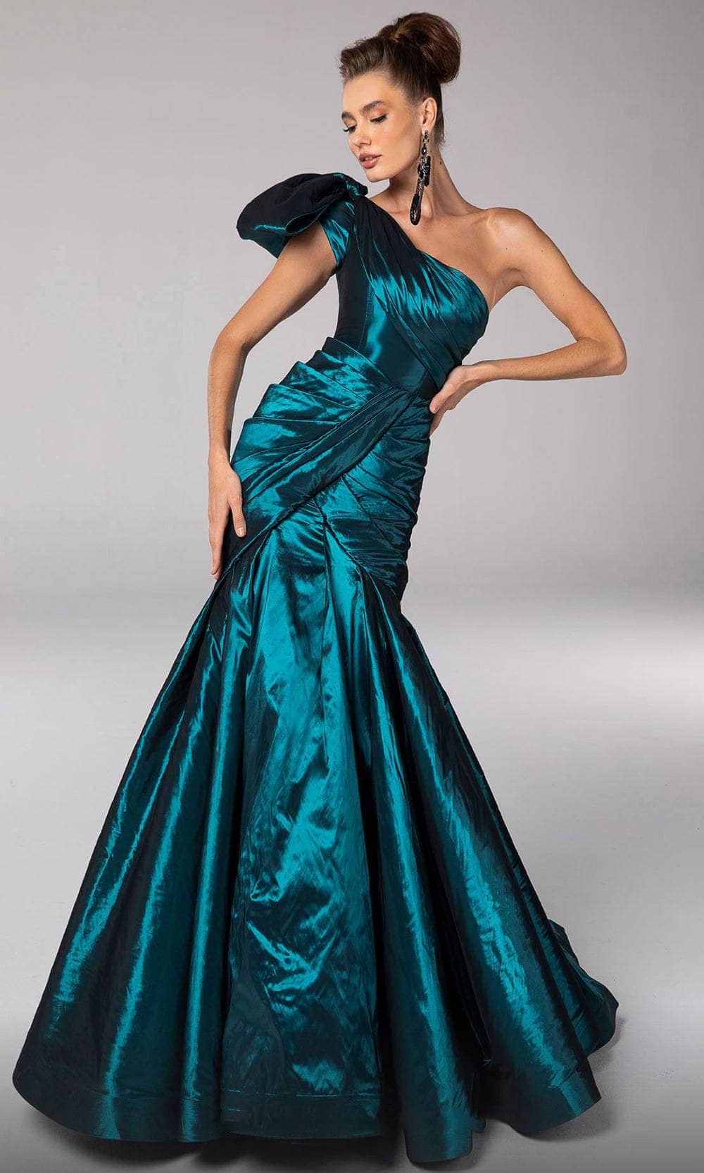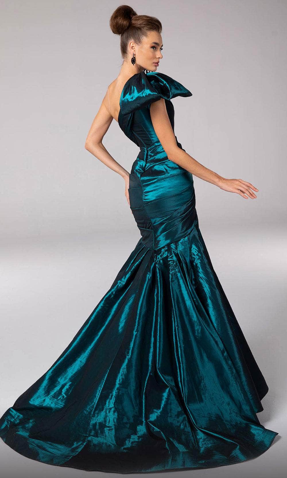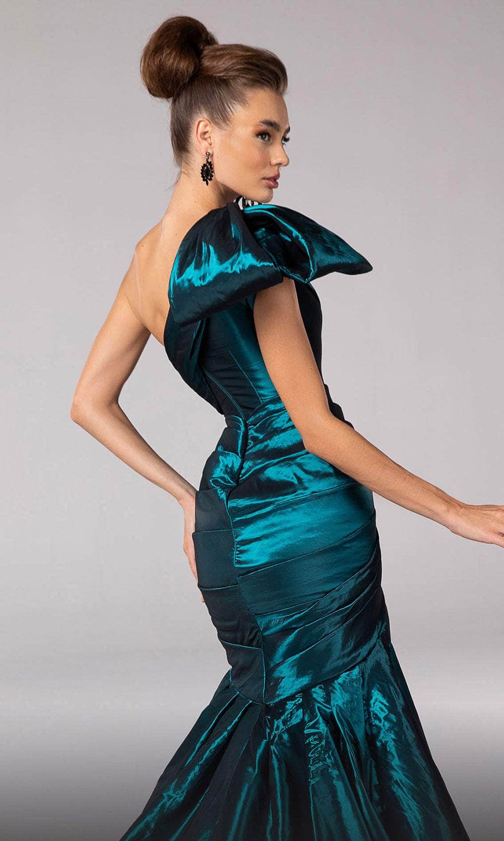 Step into the spotlight with the MNM Couture F02833 evening gown. Expert tailoring sculpts the dress into a sleek silhouette, hugging your curves and creating a powerful presence. The asymmetrical neckline adds a touch of drama, accentuated by a beautifully crafted bow that sits gracefully on one shoulder. As your gaze travels down, the bodice unfolds in a cascade of delicate pleats. The true showstopper, however, lies in the trumpet skirt. Unlike a traditional skirt, it offers captivating woven pleated details. This detail flows seamlessly into a dramatic sweep train. This MNM Couture F02833 masterpiece is a perfect blend of modern design and timeless elegance for a night to remember. Model is wearing the Petrol color.