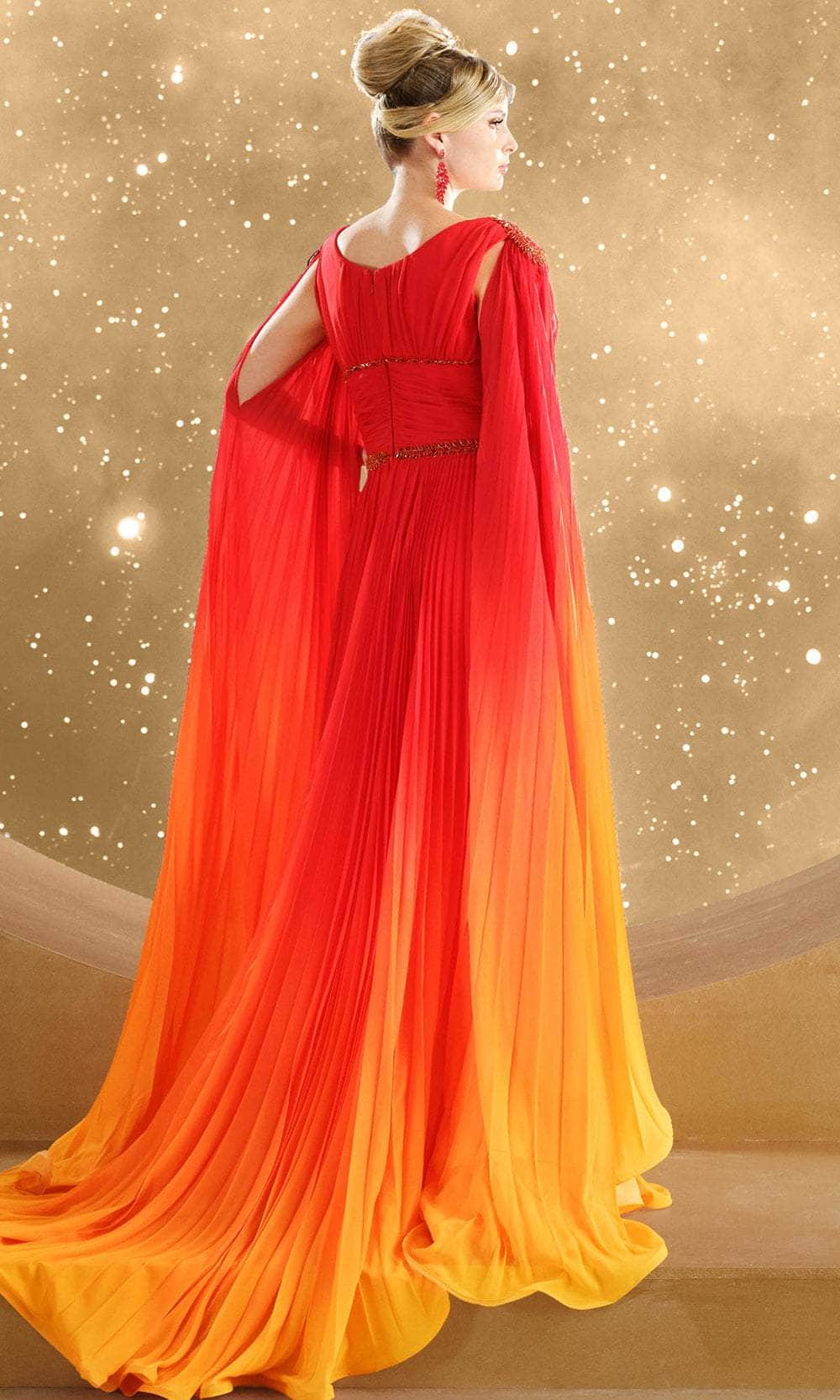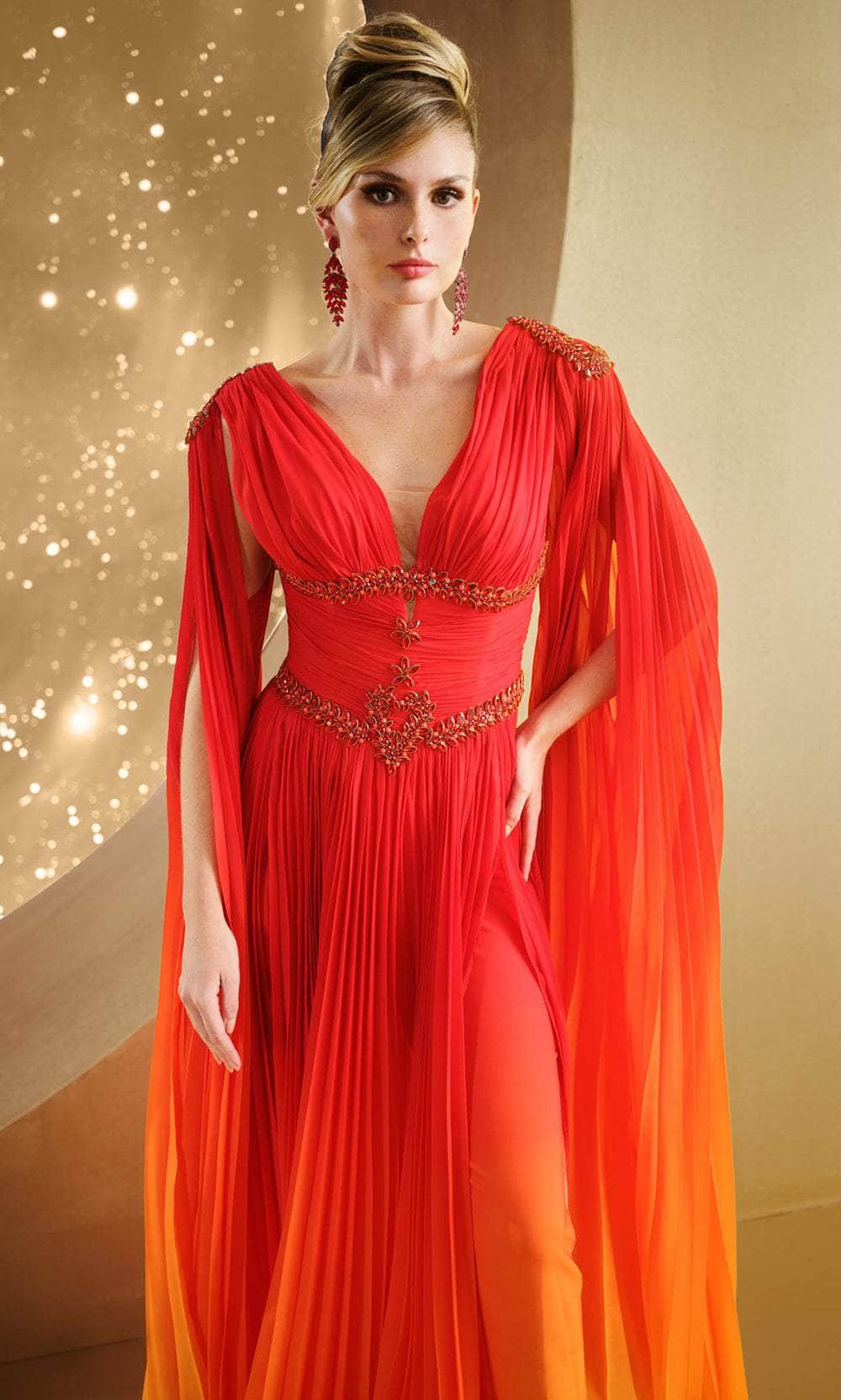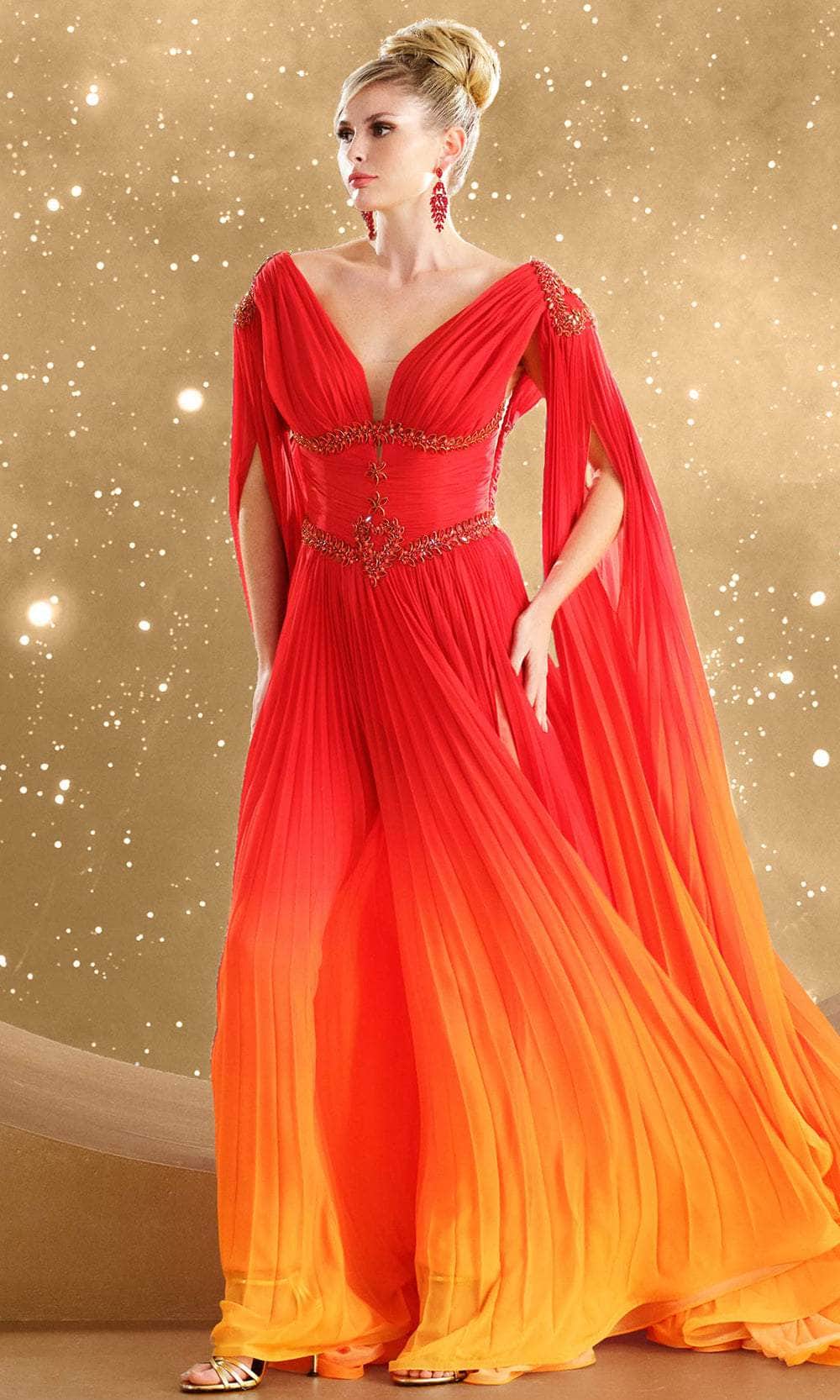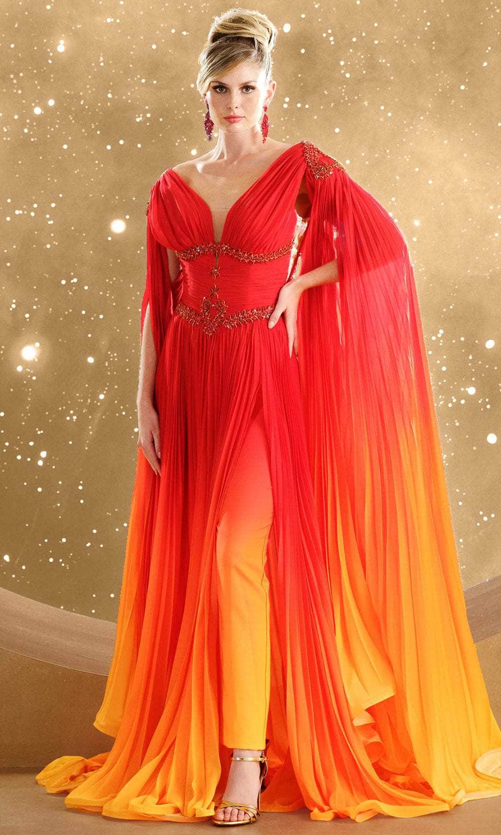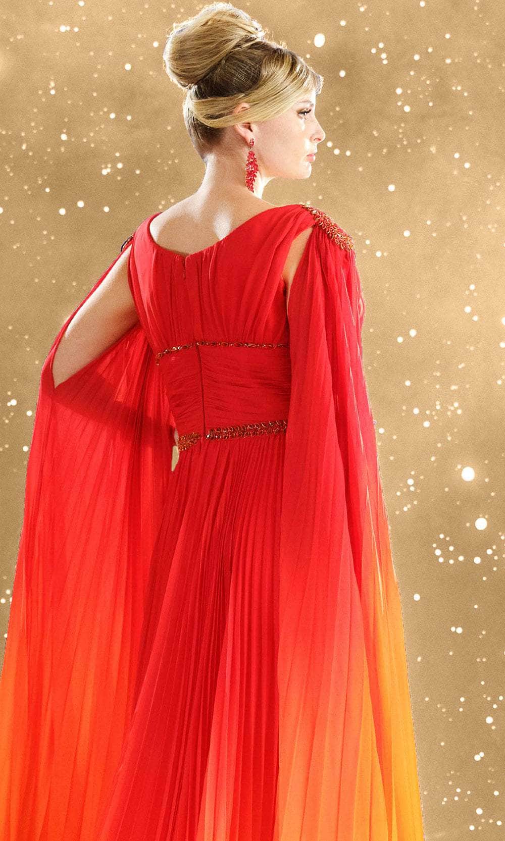 Step out with poise in MNM Couture F02847, where bold design meets high-fashion finesse. The plunging V-neckline and pleated bodice sculpt the figure, complemented by gradient ombre coloring. Beaded appliques at the waist and shoulders add sparkle, while flowing split cape sleeves and wide-leg pants create striking movement. The look is perfected with an airy A-line skirt that offers graceful flow and balance. Perfect for fashion-forward events, MNM Couture F02847 offers the boldness of a jumpsuit with the drama of a gown. Model is wearing Red color.