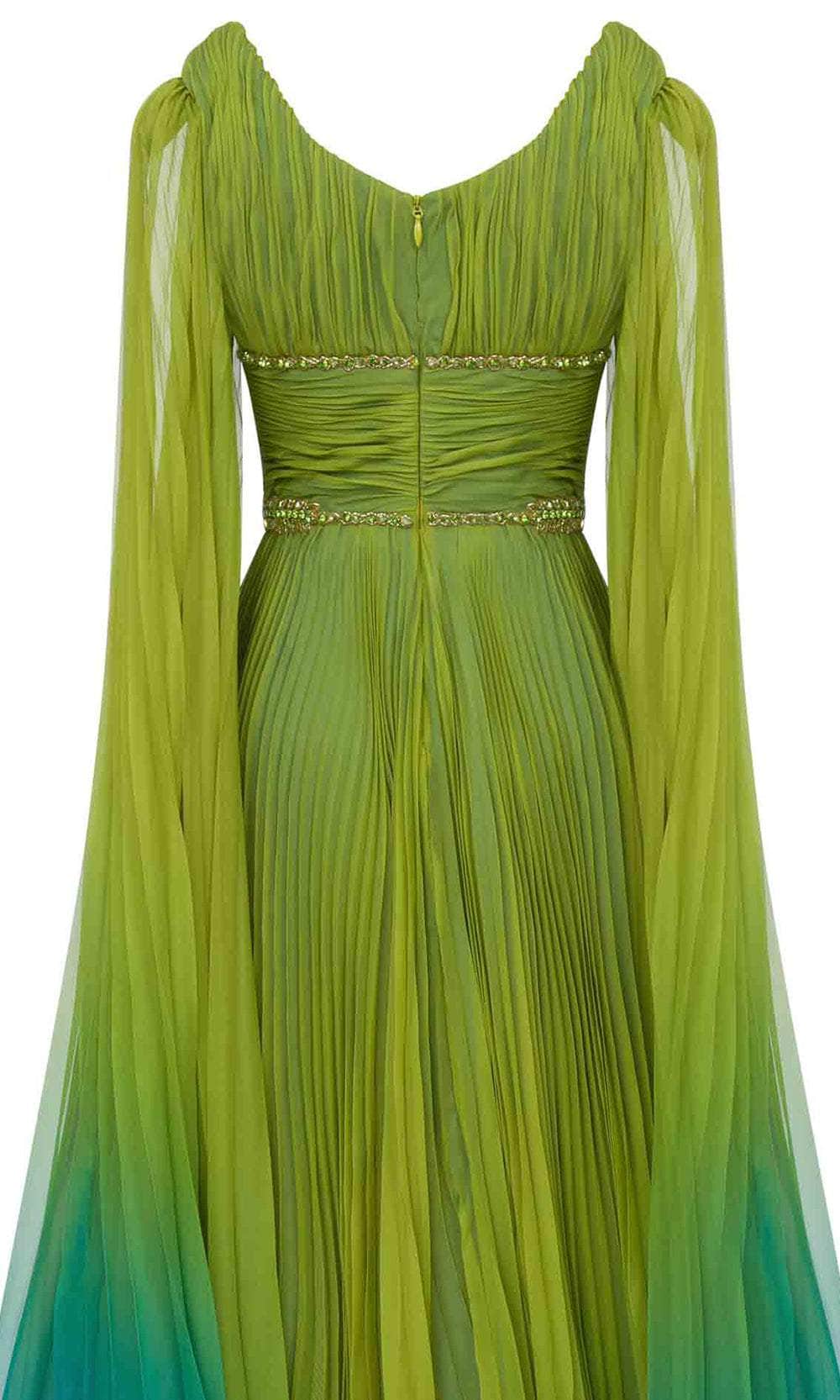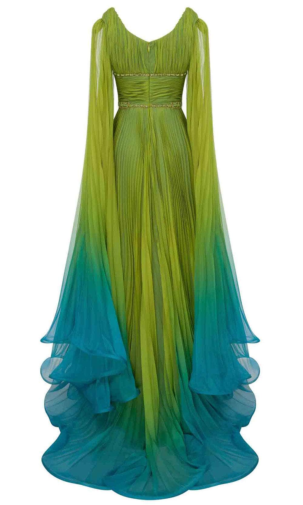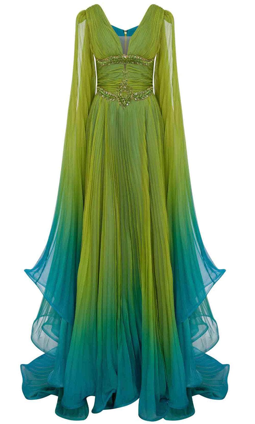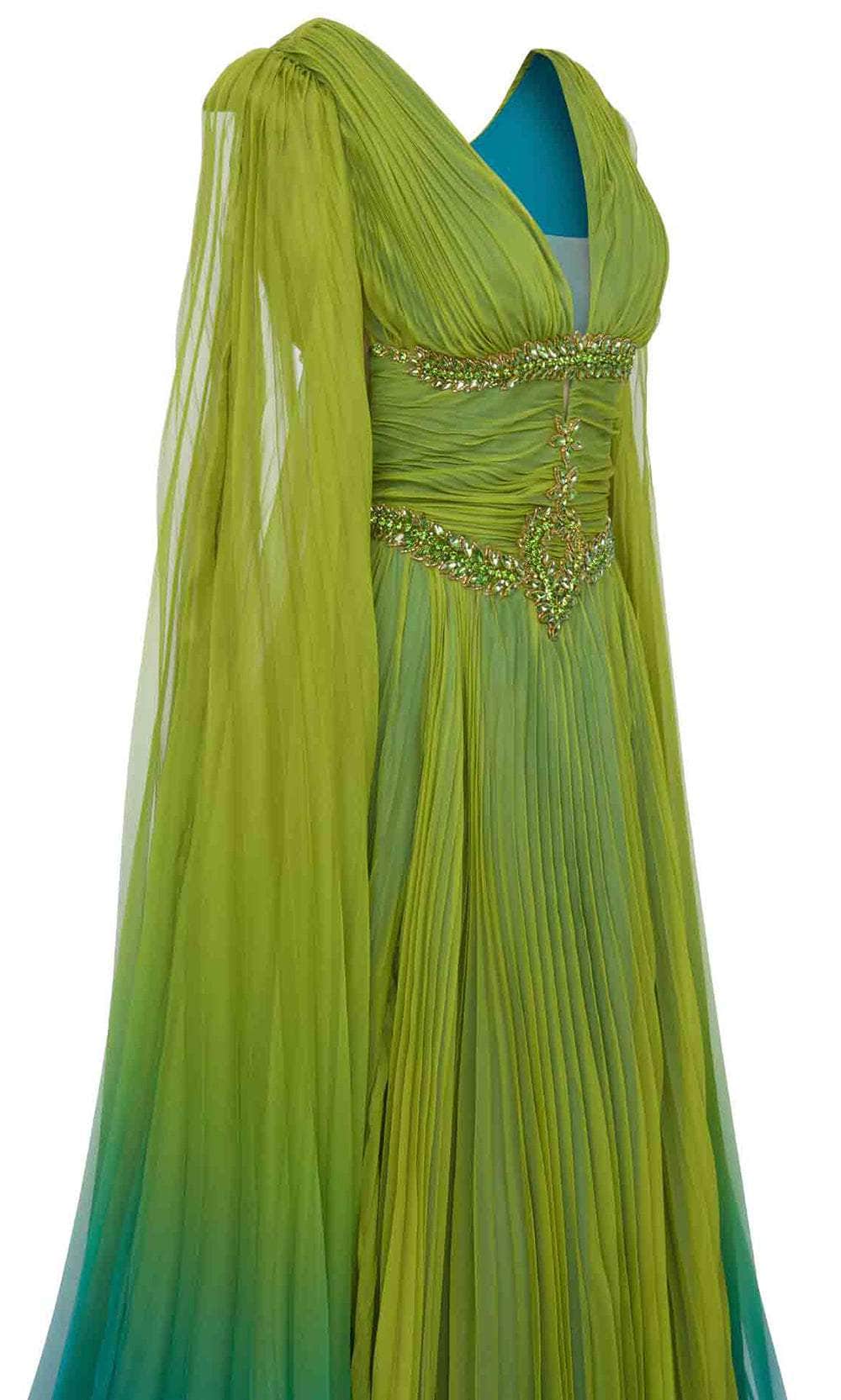 | Details: | Long Cape Sleeves, Ombre Gradient, Beaded Appliques, Wide-Leg Pants, Ruched Bodice |