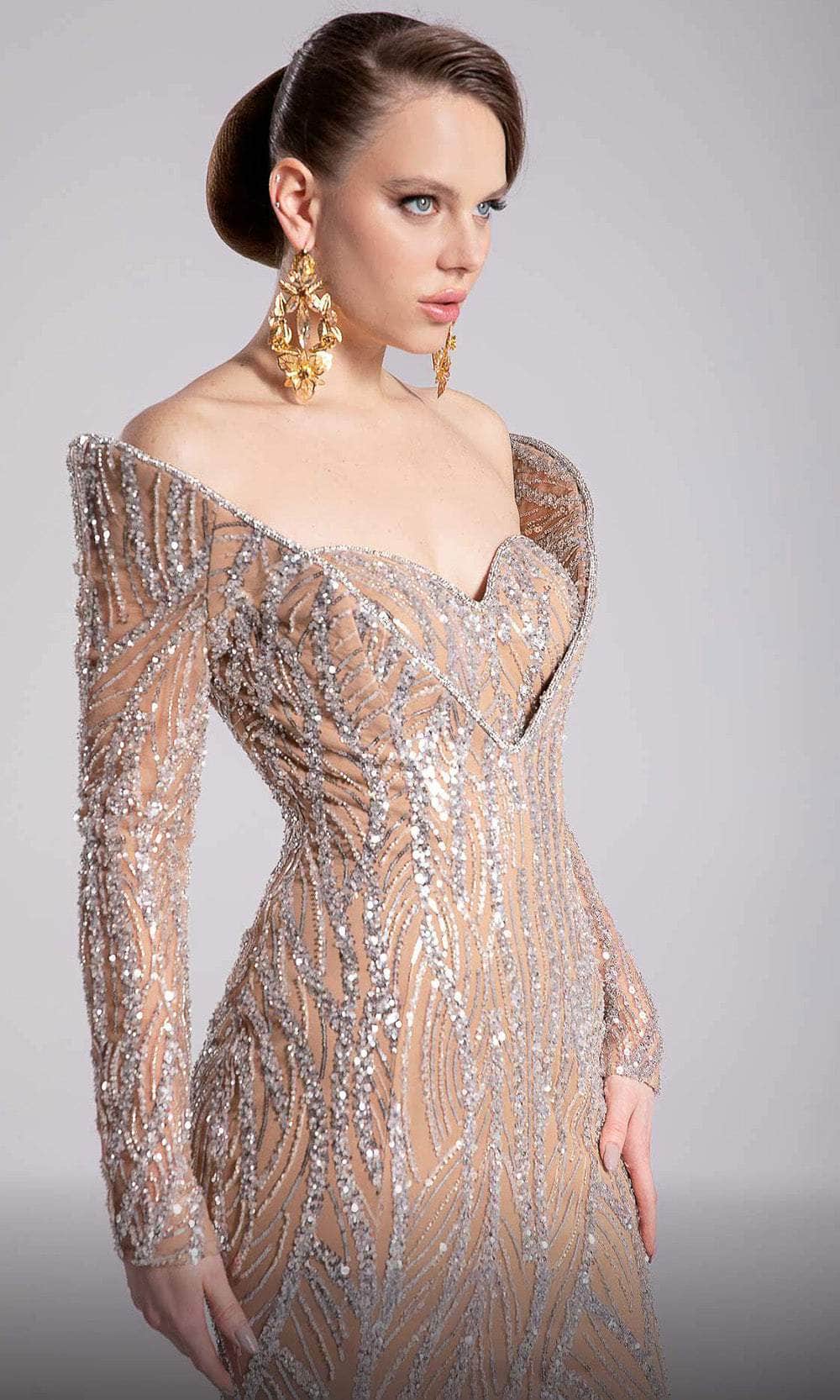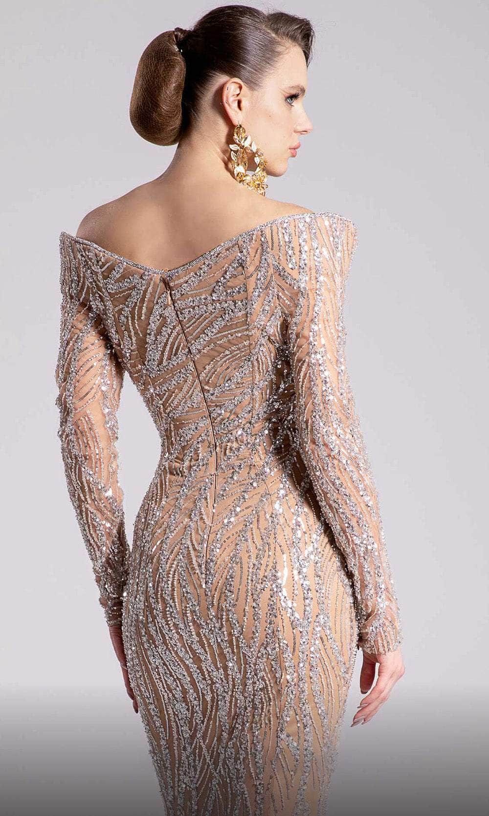 Transform any grand occasion into a show-stopping moment with MNM Couture F02900, an off-shoulder mermaid gown that defines modern luxury. The gown features a captivating arrangement of shimmering sequins and beads in fluid, organic lines that follow the body curves. Long sleeves balance the revealing sweetheart neckline, while a subtle sweep train elongates the figure. With its meticulous craftsmanship and radiant embellishments, MNM Couture F02900 is designed for those who demand attention and elegance at formal galas or elite red-carpet affairs. Model is wearing Silver color.