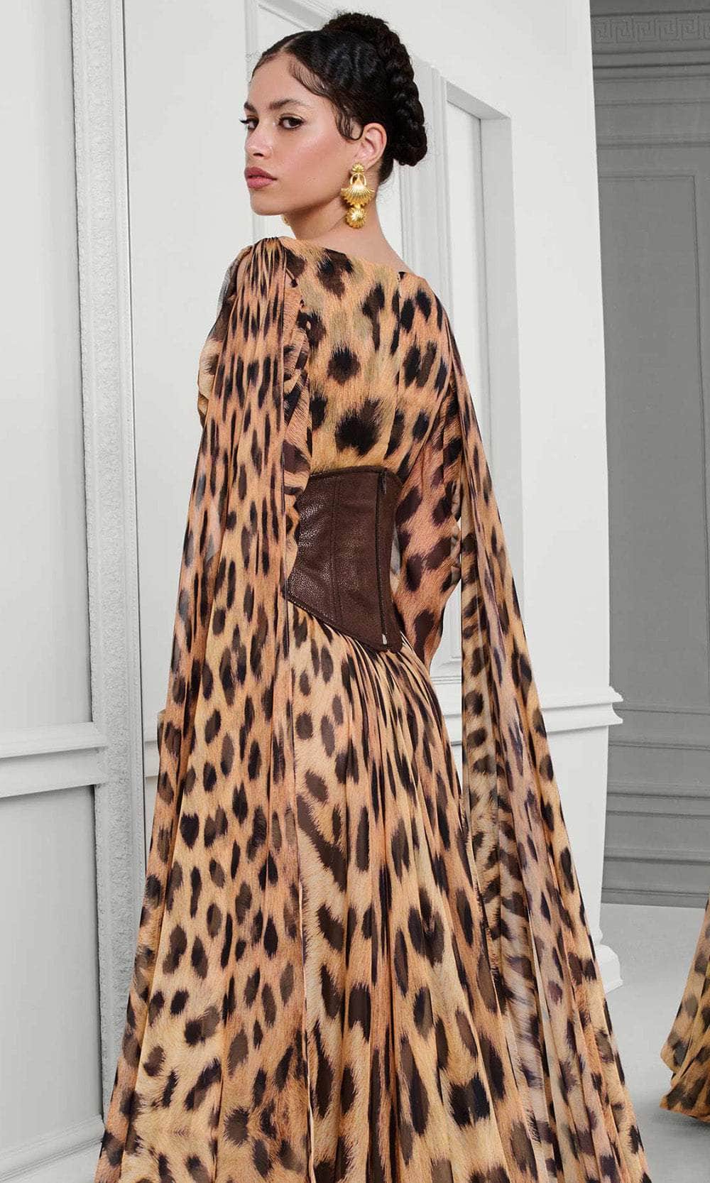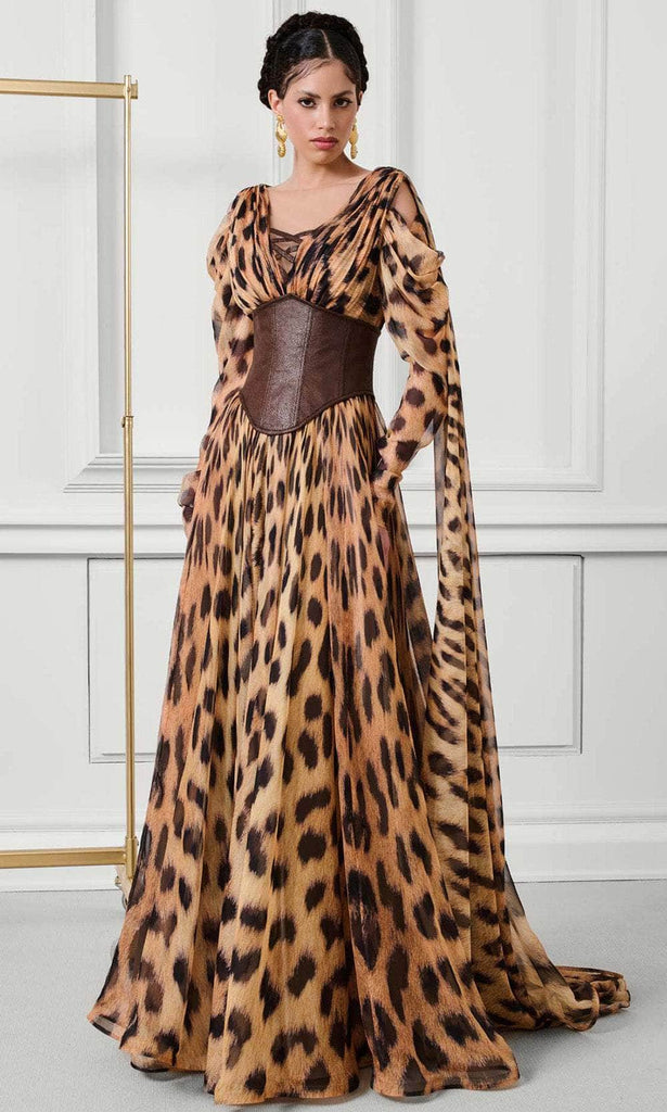 Unleash your wild elegance with MNM Couture F02921, a gown that brings couture-level drama to bold animal print. The ensemble features a beautiful plunging v-neckline, crisscross straps at the bust and voluminous long sleeves that flow into cape-like extensions, creating a sense of regal movement. A structured waistband cinches the silhouette and adds definition, while the full A-line skirt brings balance and grandeur. MNM Couture F02921 is the ideal ensemble for extravagant events where daring fashion and sophistication collide in a fierce display of confidence. Model is wearing Tiger color.