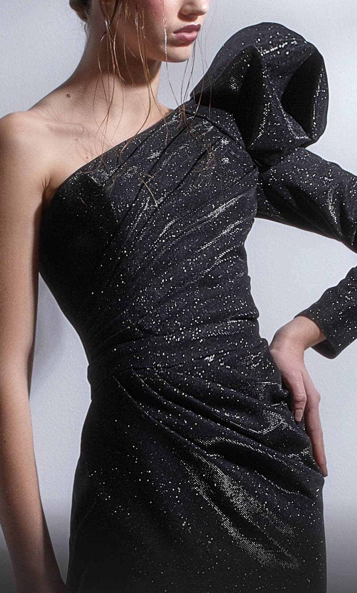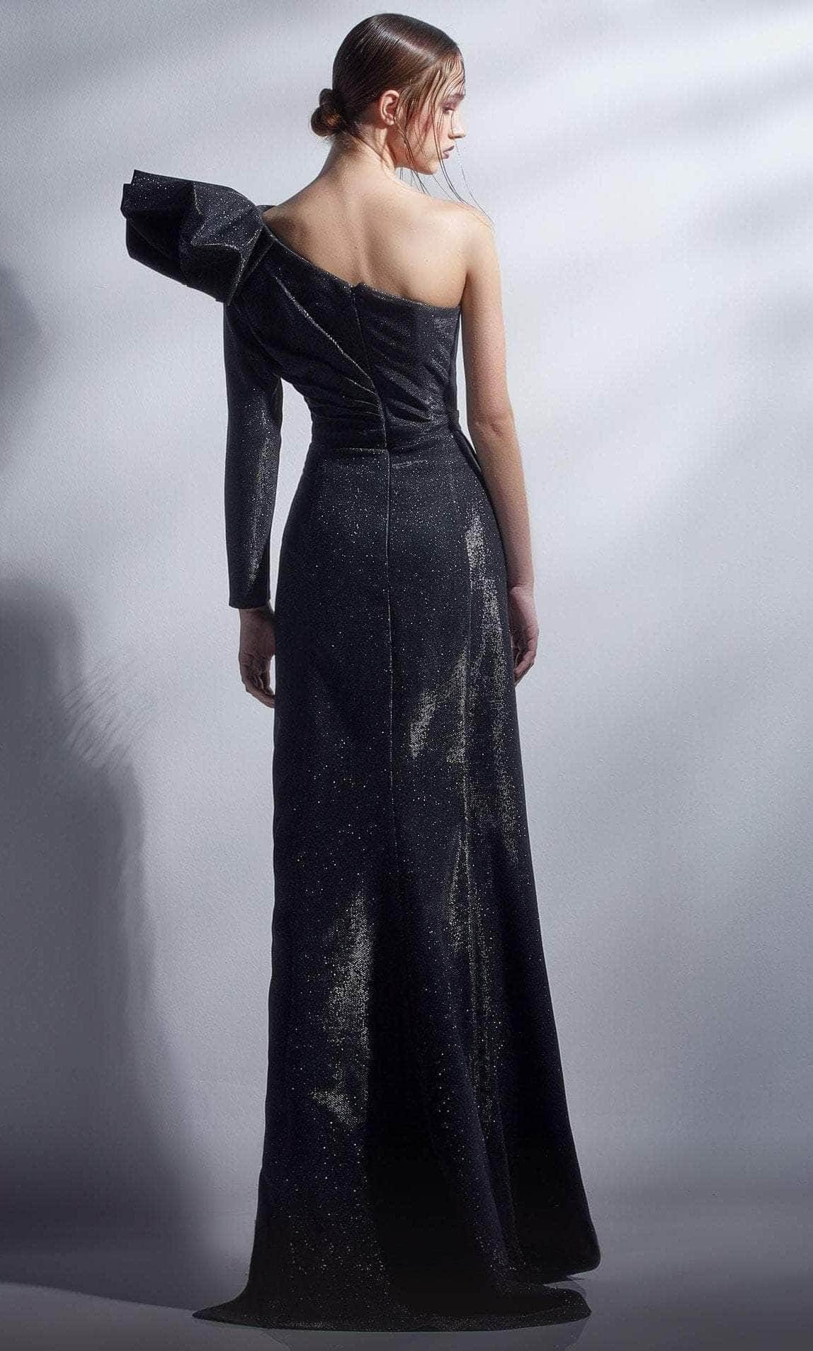 Shine through the night in this mesmerizing MNM Couture G1271. Tailored from metallic crepe fabric and styled with ruching details, this gown flatters an asymmetrical neckline and one-sleeve bodice with a puff design. The gown has a modified sheath silhouette that falls into a floor-length hemline and is cinched with a waistband. A slit accentuates the draping skirt with a sweep train finish. Never fail to impress in this regal MNM Couture G1271 masterpiece. Model is wearing Black color.