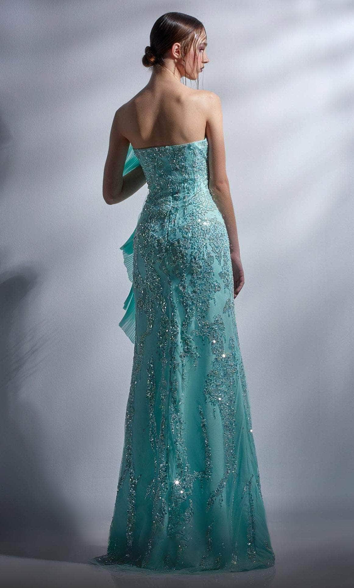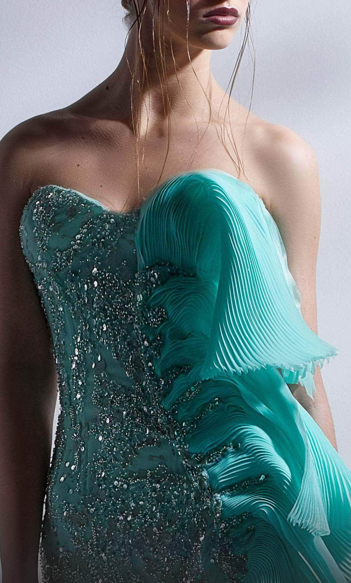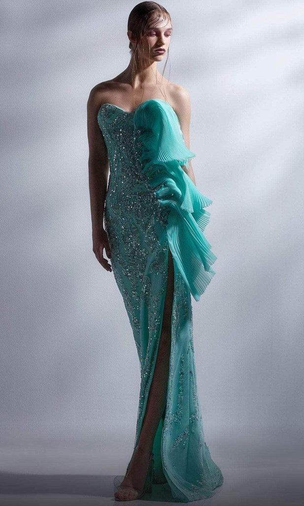 Capture that striking presence and get everyone’s attention in this MNM Couture G1281 creation. Showcases a strapless fitted bodice, with sweetheart neckline, this gown is fashioned from a luxurious fabric adorned with stunning beadwork and sequins. A dramatic plied organza drapes on one side and run down the hips, drawing the attention to your lovely curves. Finished with a thigh high slit and full-length, the sheath skirt completes the look! This MNM Couture G1281 is perfect for your upcoming event. Model is wearing the Aqua color.
