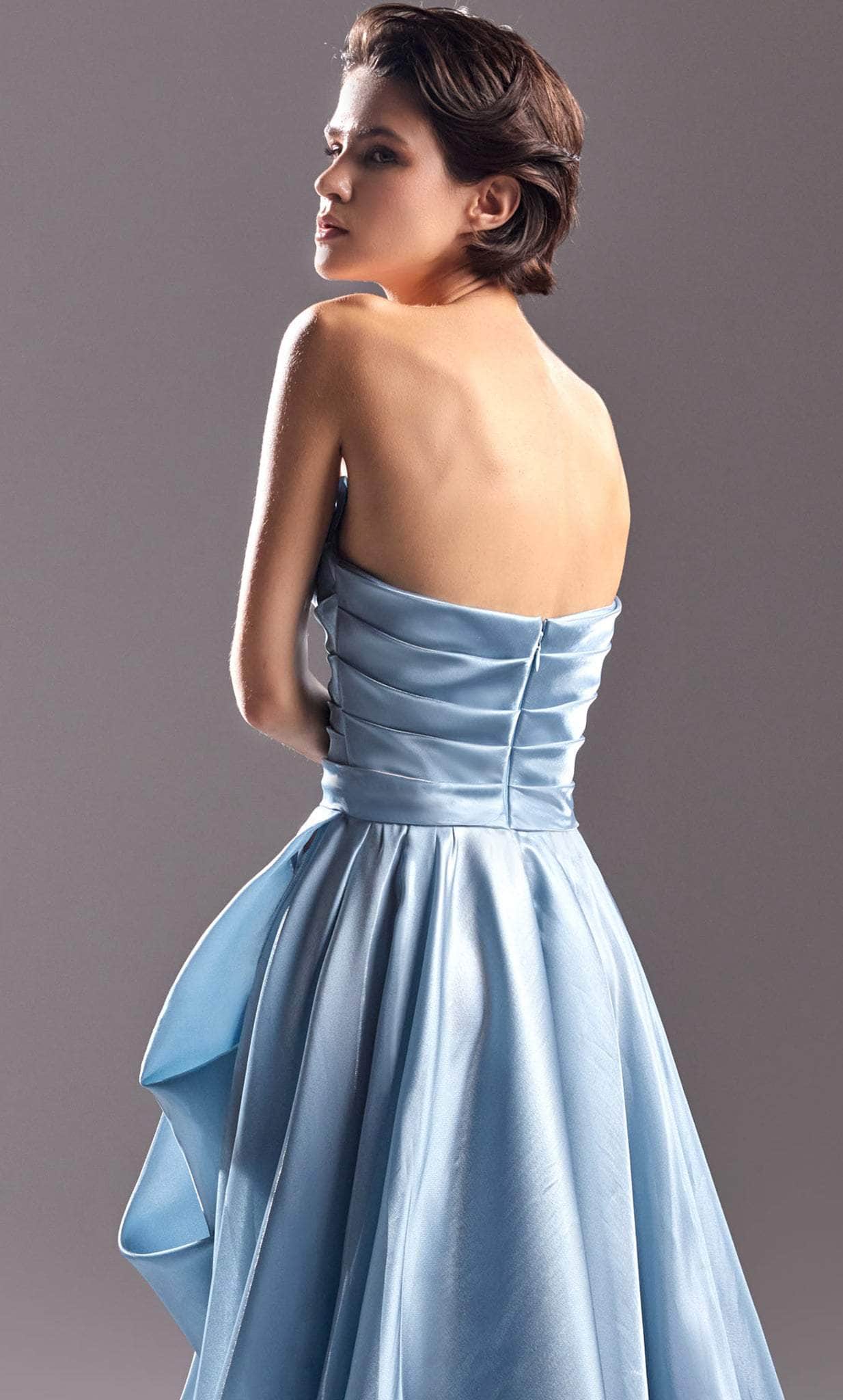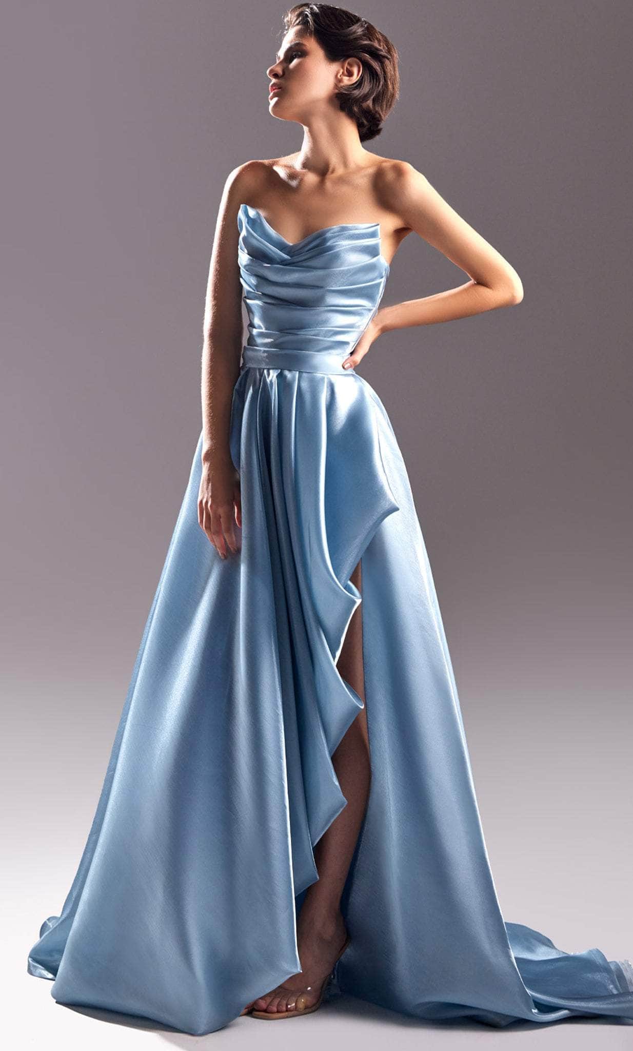 Enter the hall with grace and beauty in this fascinatingly styled MNM COUTURE G1501 creation. Flaunting a structured bodice with a strapless form, this stylish piece parades pleats below a modified v-neckline. Rendered with a ruche ornate midrise back, folded drapes give way to a peek of those legs as the skirt cascades into an A-line silhouette with a pool of train. Create a distinction with a regal flair in this exquisite MNM COUTURE masterpiece. Model is wearing the Blue color.