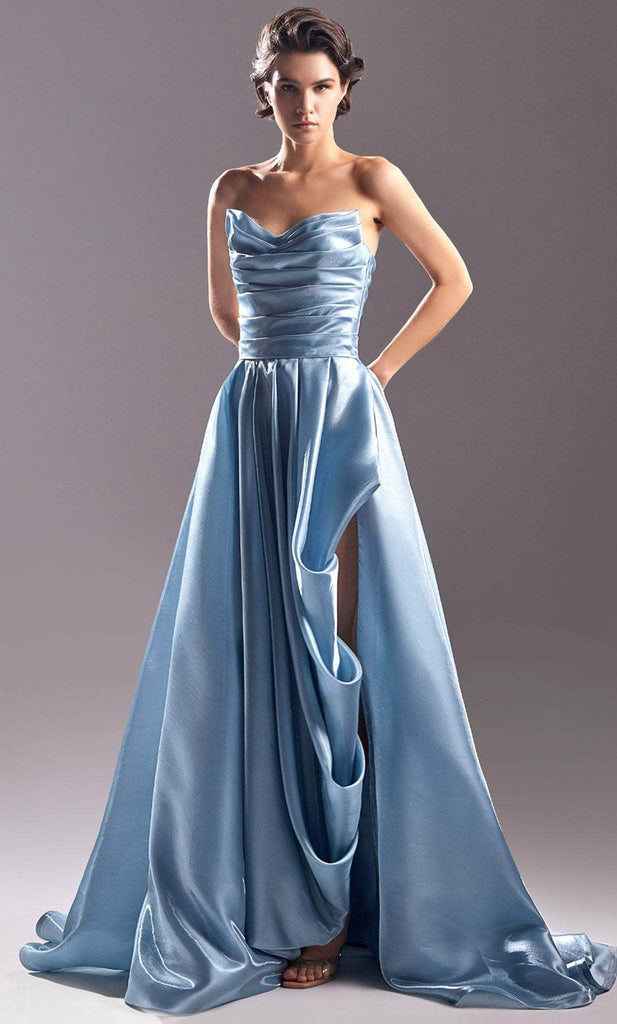 | Details: | Strapless, Pleated, Midrise Back, Zipper Closure, Draped Slit, Sweep Train |