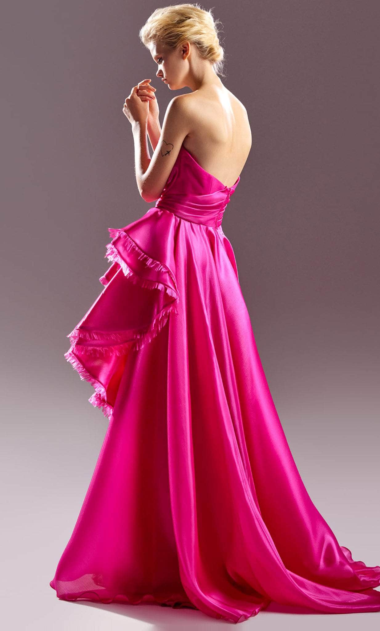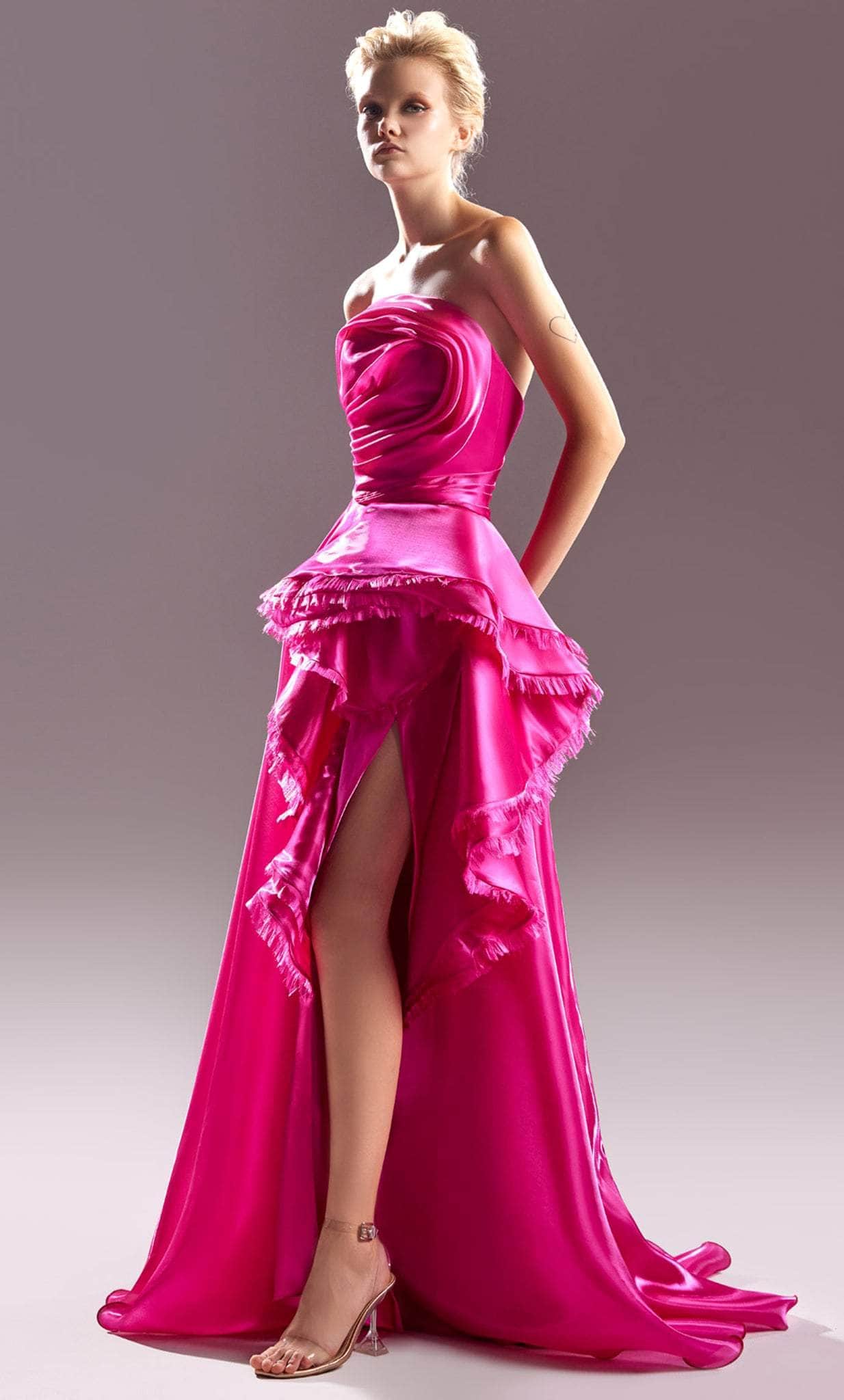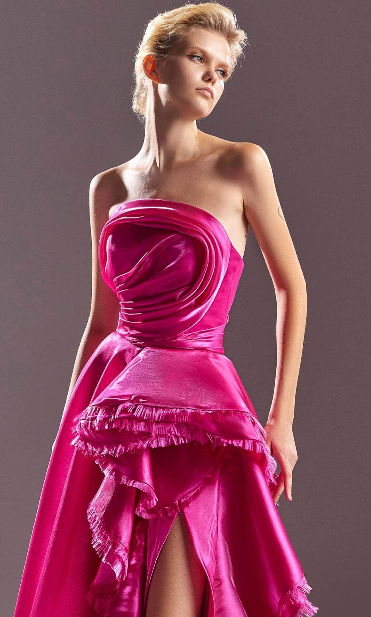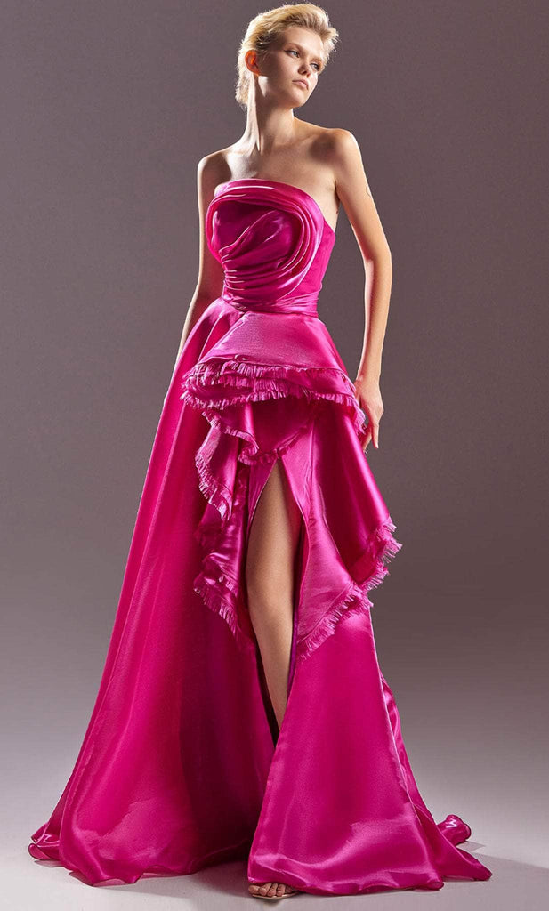 Claim that look of sophistication on your next event wearing this glamorous MNM Couture G1514 evening dress. This dress fashions an endearing straight across neckline in a fitted, sleeveless, and strapless bodice. Also, its bodice highlight unique pleated designs to add elegance on the look. Additionally, the back shows a mid-open back with back zipper closure to provide a neat finish on the dress. Revealing an A-line silhouette, the skirt also shows an enticing slit to add allure on the dress. It has ruffled designs which makes the dress more pleasant to look at. This MNM Couture G1514 creation is the perfect choice for the girl who wants to look attractive without being suggestive. Model is wearing Fuchsia color.