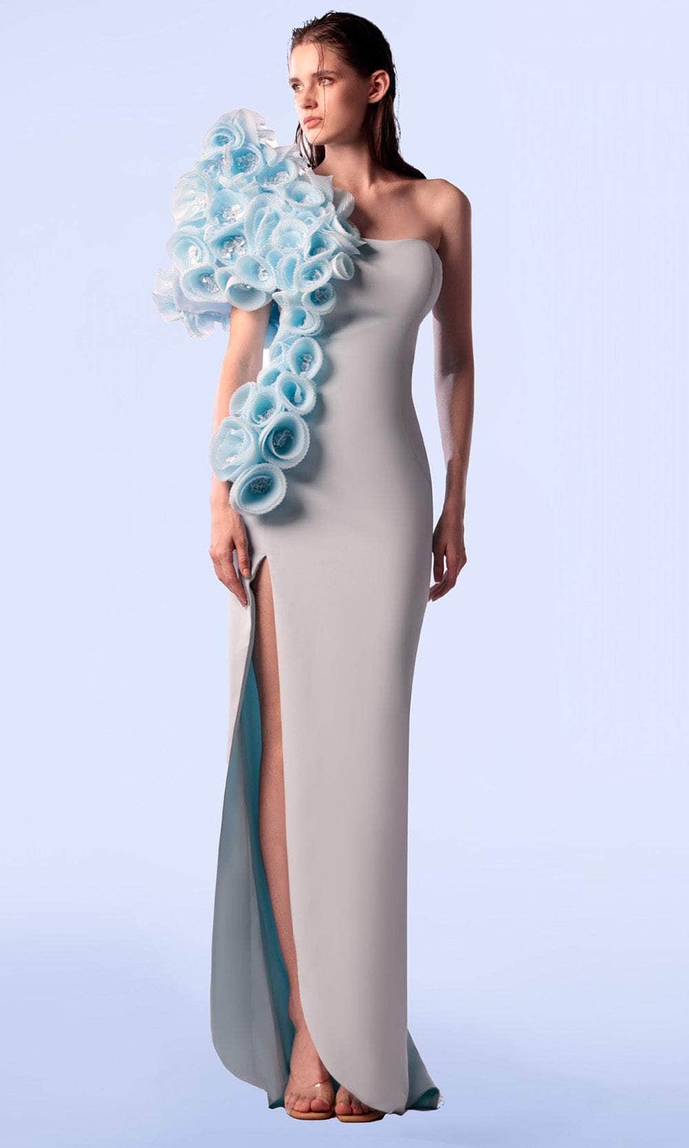 | Details: | One Shoulder, 3D Floral Applique, High Slit, Fitted Bodice |