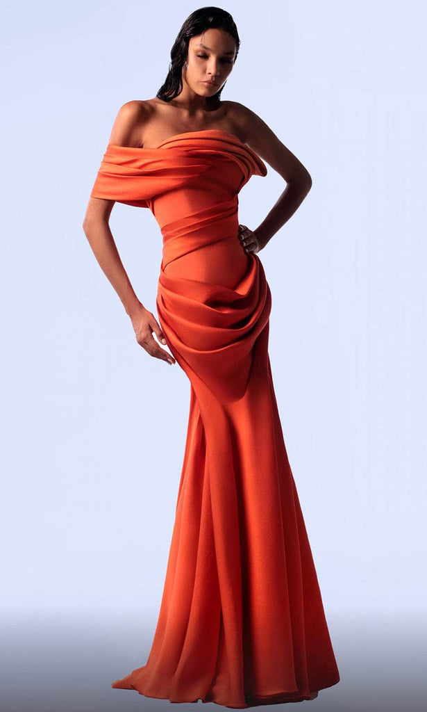 Embark on a journey of sartorial excellence with the MNM Couture G1710 gown, a masterpiece that effortlessly blends classic elegance with contemporary flair. Its meticulously crafted tailoring lines sculpt the feminine form, while the intricate weave shirred bodice and asymmetrical pleated waist create a captivating silhouette. The draped bodice and mermaid skirt with a structured side drape and sweep train add a touch of drama and sophistication. This MNM Couture G1710 gown is a sartorial statement perfect for those seeking to make a lasting impression at any formal event. Model is wearing the Orange color.