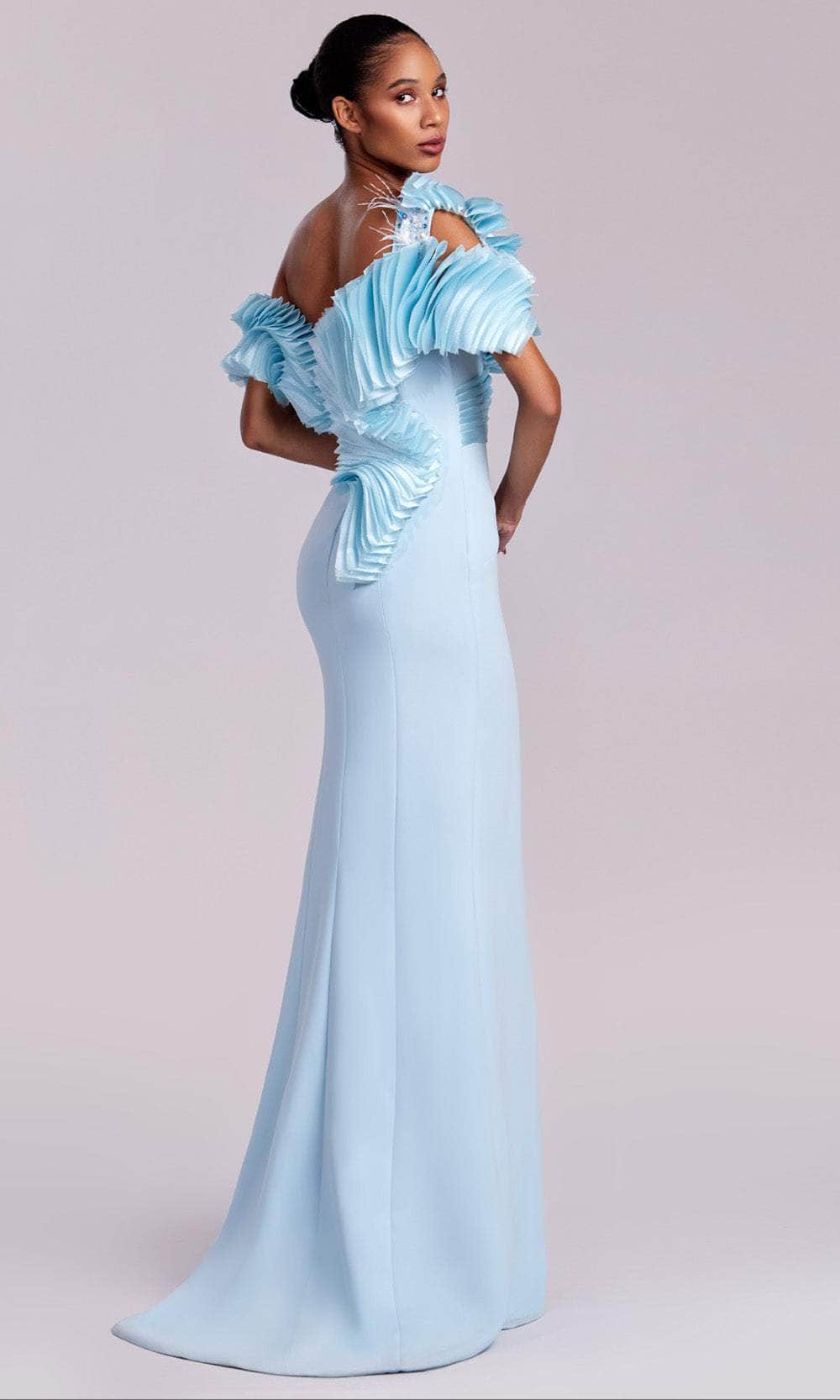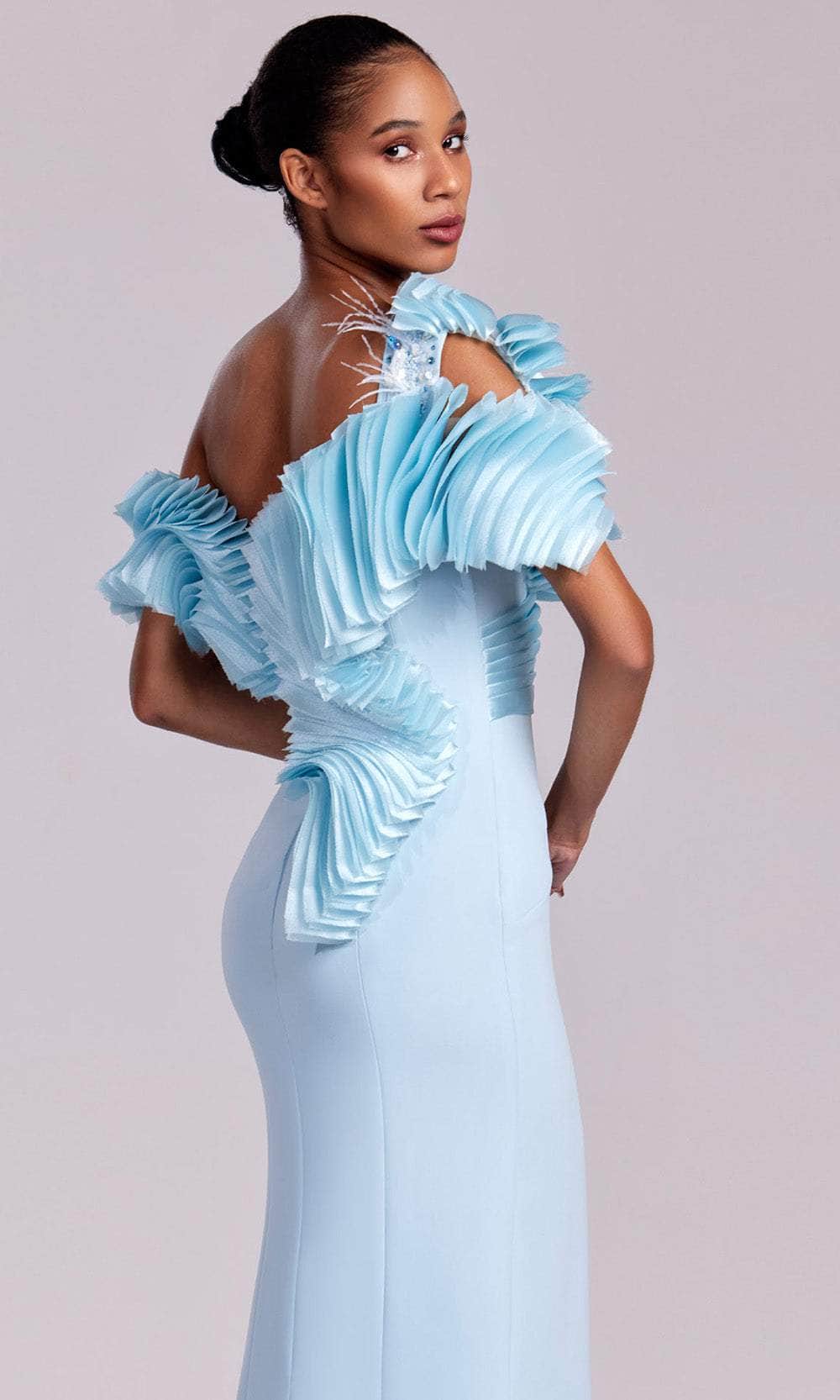 MNM Couture G1807 introduces a design that feels both romantic and sculptural, perfect for fashion-forward formal wear. The off-shoulder neckline and short sleeves are decorated with an ornate mix of pleated ruffles, feathers and bead-embellished floral appliques, offering a rich sense of depth and detail. Its sheath silhouette glides over curves and is finished with a sultry side slit for modern appeal. Complete your formalwear dreams with MNM Couture G1807. Model is wearing Blue color.