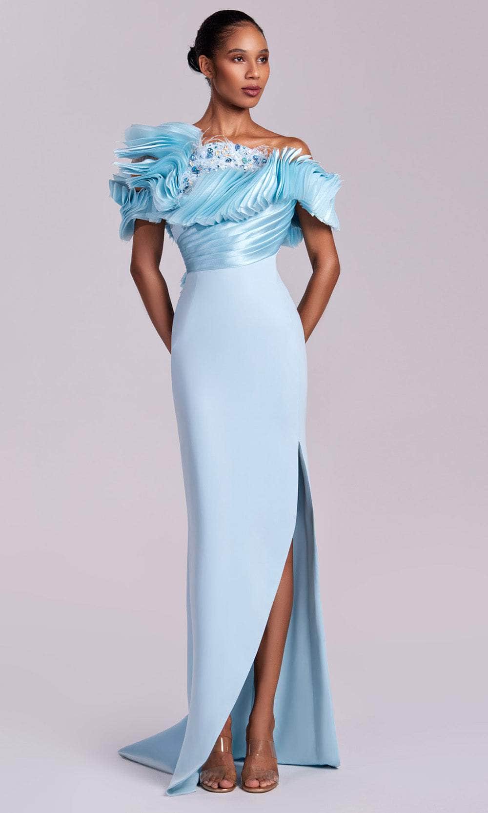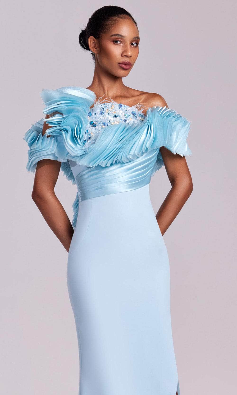 | Details: | Pleated Ruffle Bodice, Beaded Applique, Feather Accents, High Slit, Mid-Open Back, Fitted |