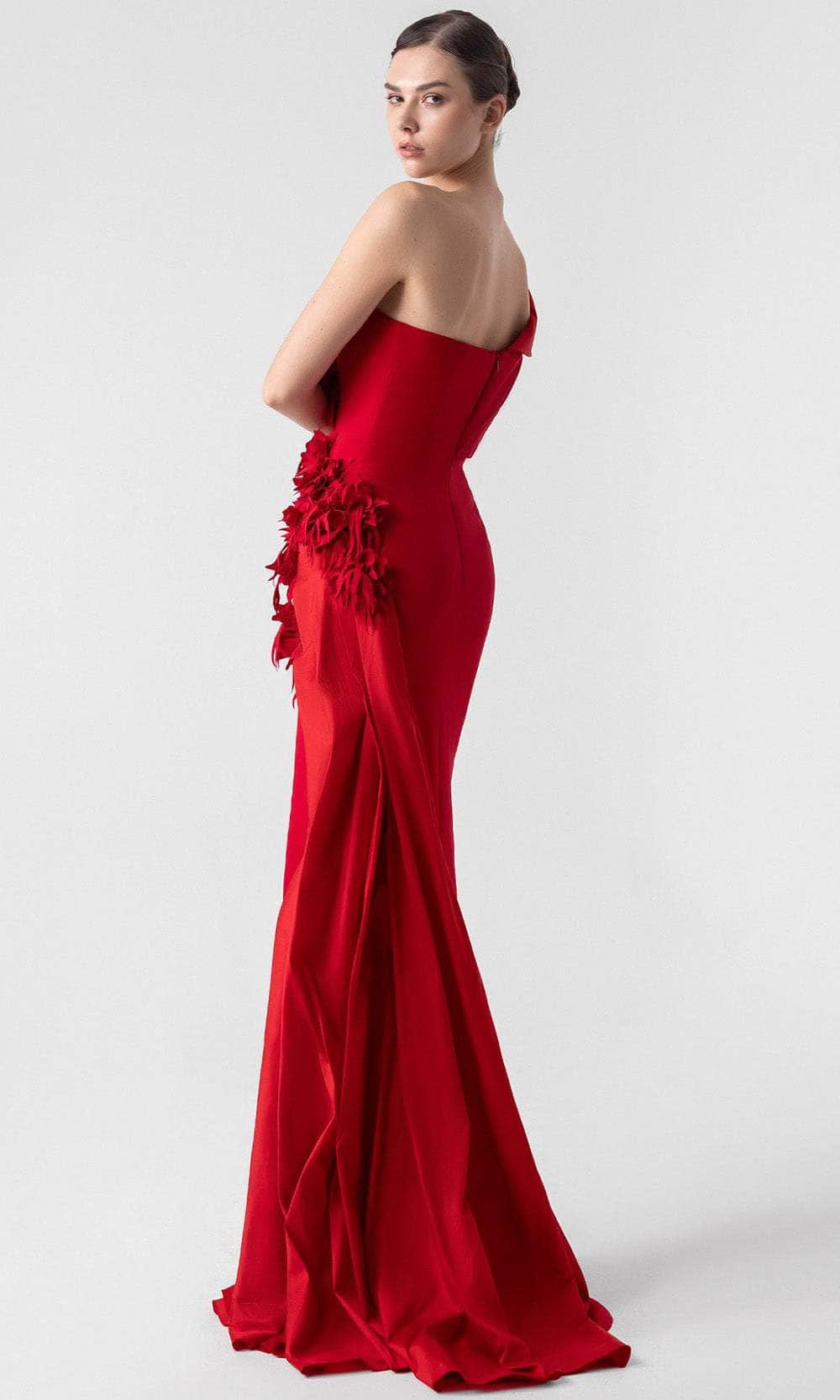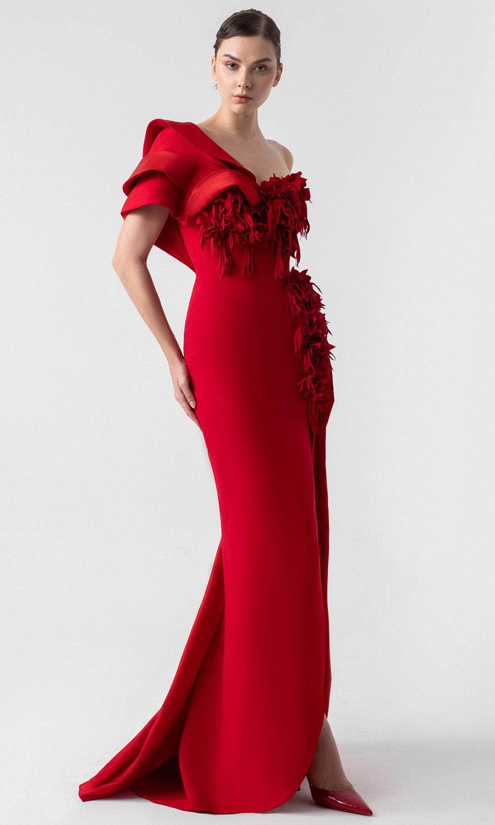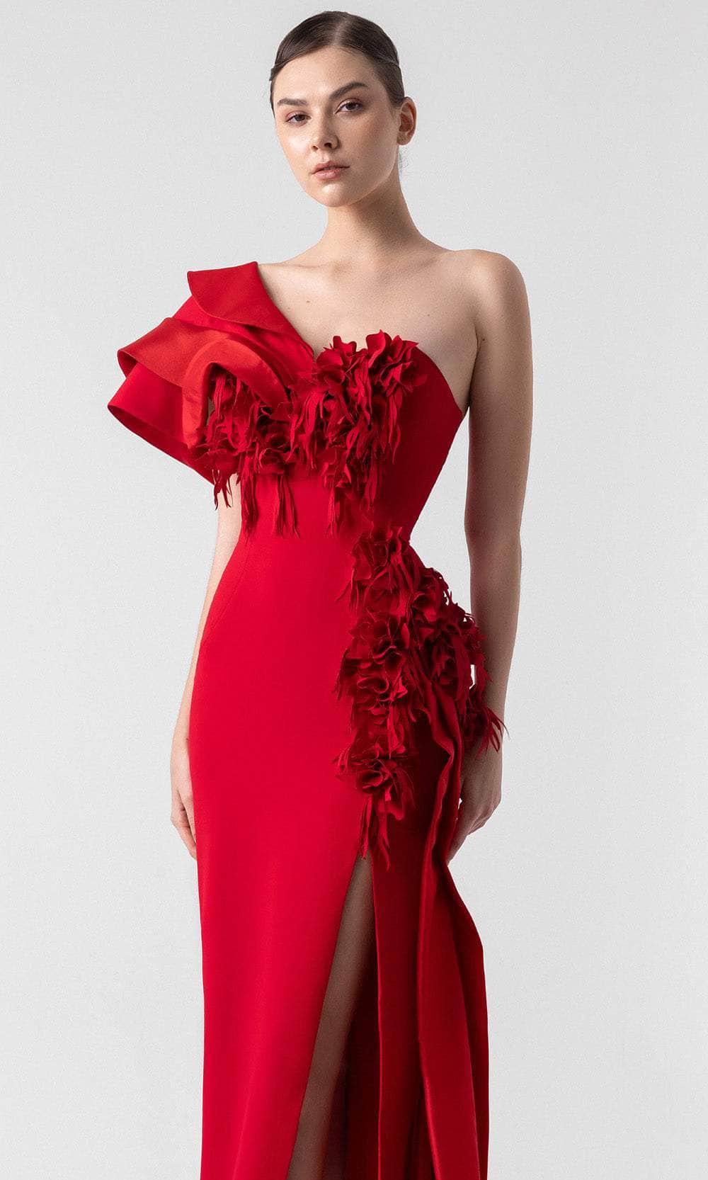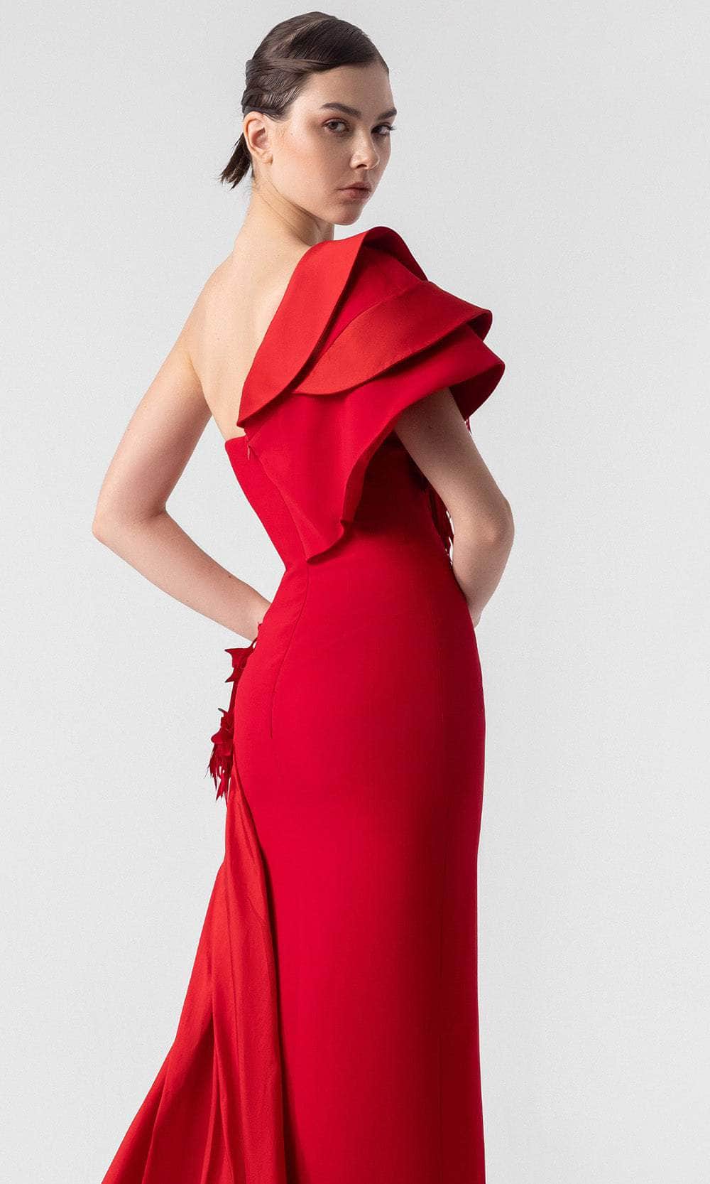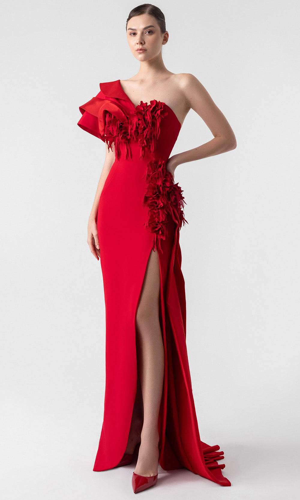 Make a show-stopping impression with the undeniable glamour of this MNM Couture G1909 creation. One-shoulder styling meets a symphony of laser-cut 3D applique that adds rich visual contrast across the bodice and down the side. A thigh-high slit adds sensual appeal, while the sculpted sheath skirt with draped side sash offers both fluidity and drama. With its asymmetric neckline and dynamic detailing, MNM Couture G1909 makes an unforgettable choice for women who want to bring couture energy to upscale events. Model is wearing Red color.