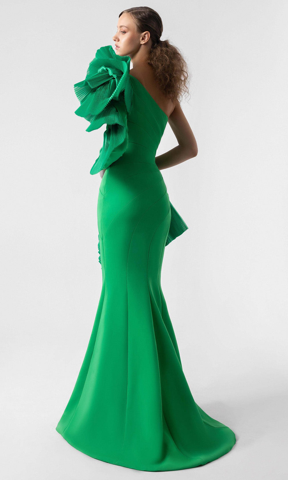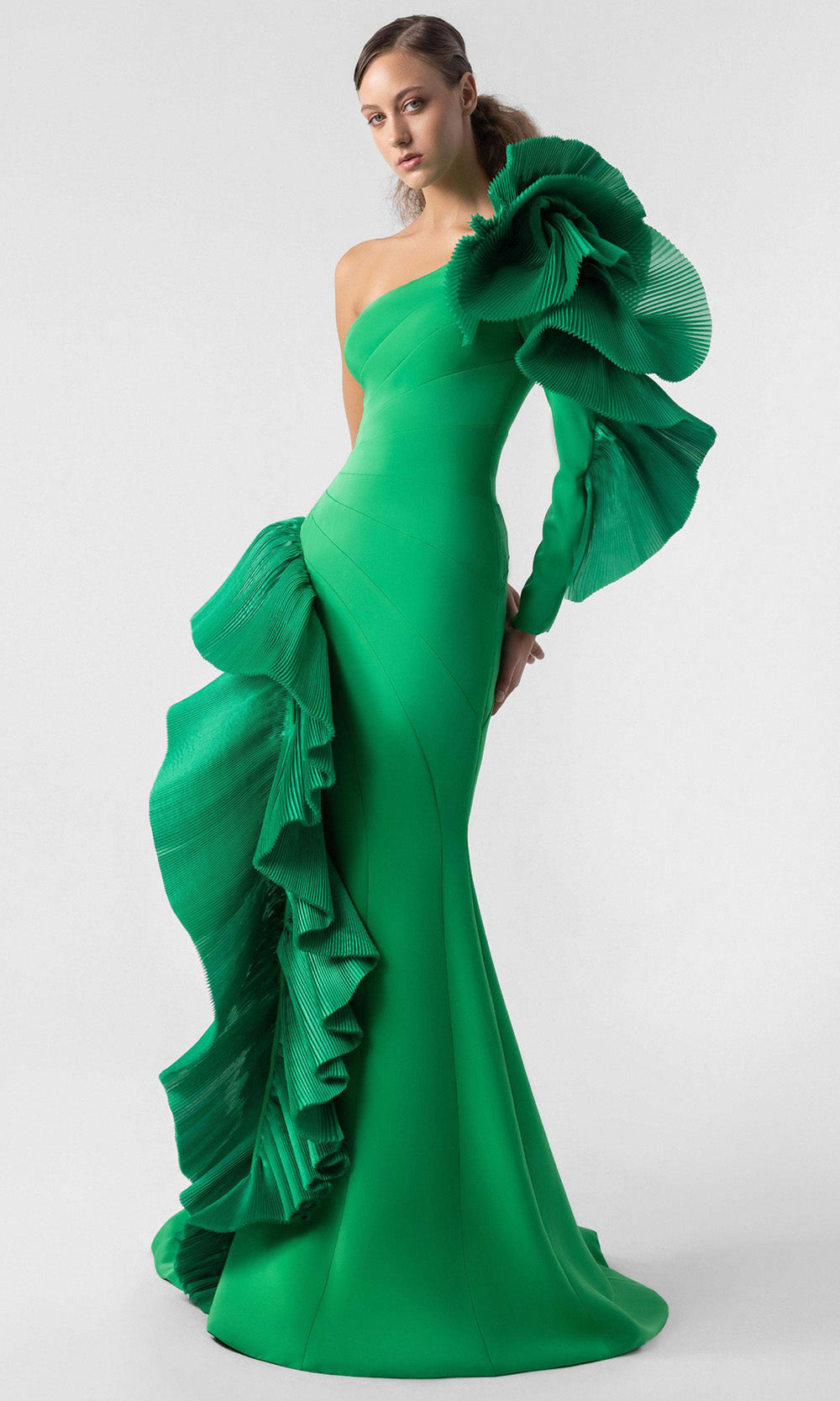 Awaken your inner goddess in this spellbinding gown from MNM Couture G1918. Its fitted bodice is amplified by a sculptural plisse ruffles that exudes sophistication and high-fashion drama. A fitted bodice seamlessly transitions into a mermaid silhouette, highlighting the curves beautifully. A one-shoulder long sleeve and asymmetric neckline create a modern edge, balanced by the allure of a mid-open back. Perfect for those looking to command attention at any formal affair, the MNM Couture G1918 promises a showstopping entrance and an unforgettable evening. Model is wearing Green color.